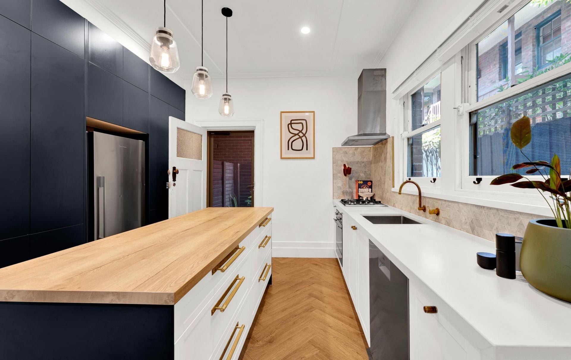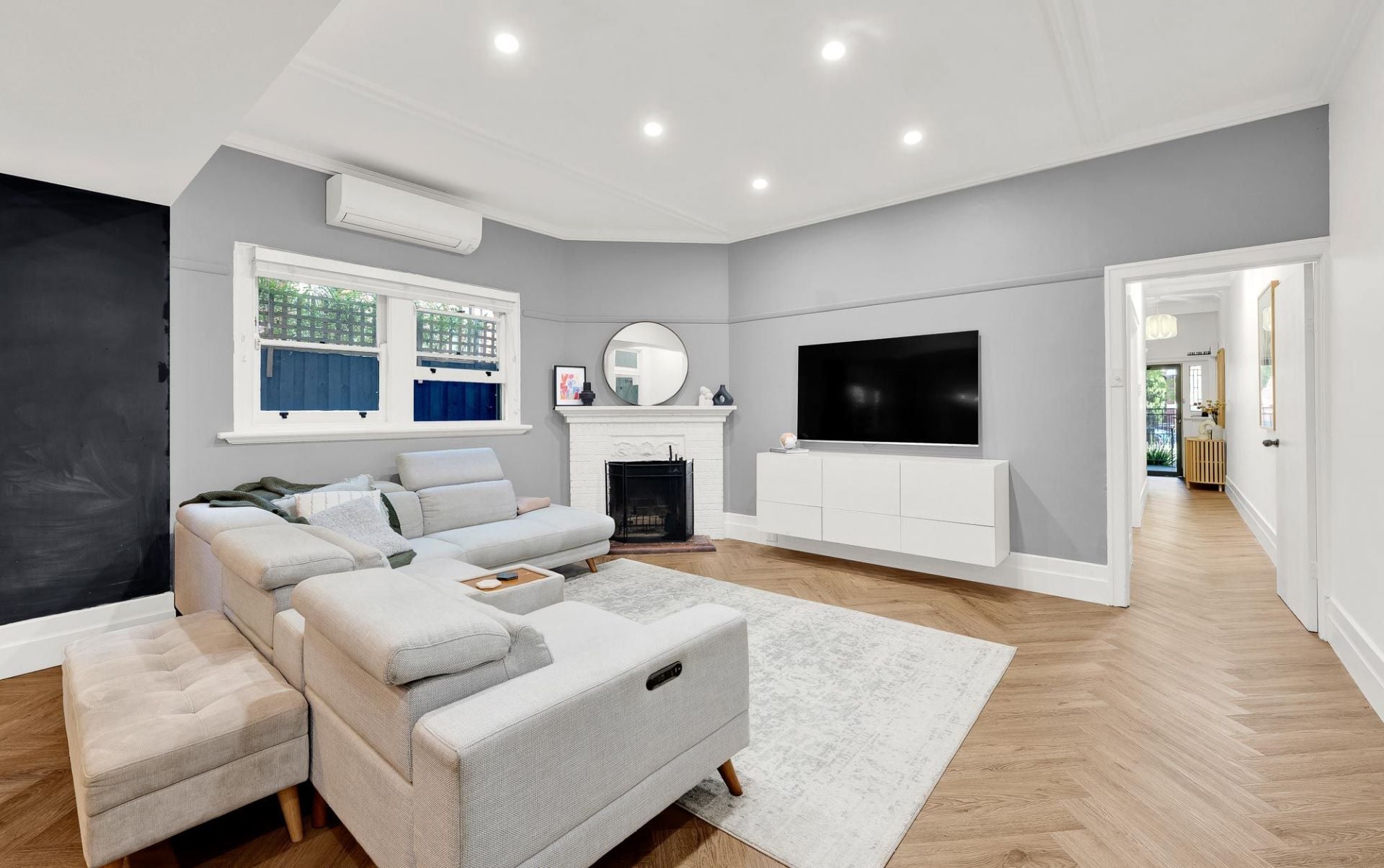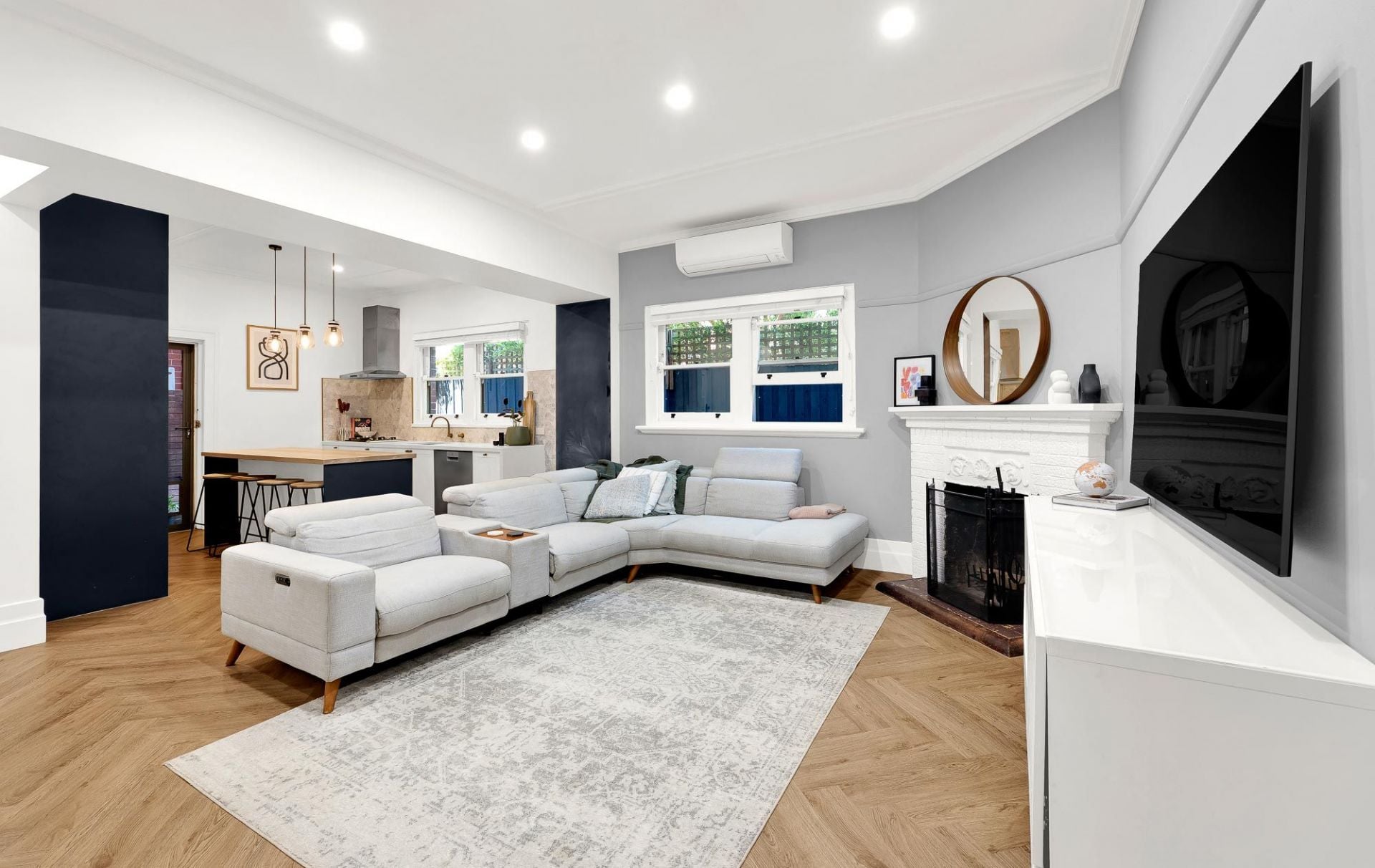 A rare offering of scale, this beautifully appointed living and entertaining domain blends refined period charm with contemporary luxury. Herringbone parquetry flooring, soaring ceilings and soft neutral tones create a sense of space, warmth and understated elegance, while recessed lighting enhances the room’s architectural detail.