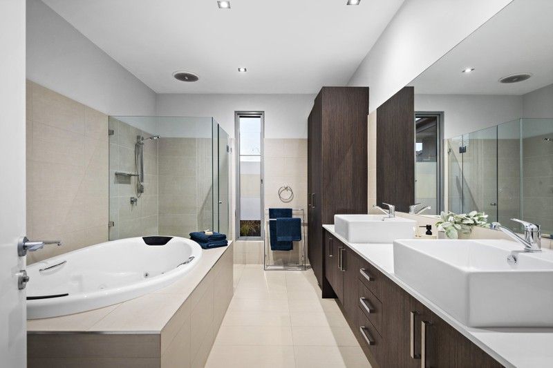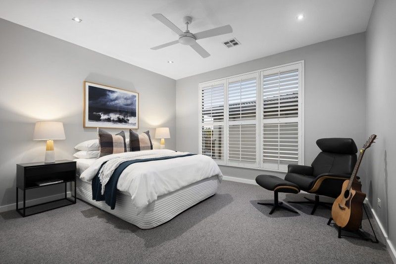 Light-filled and spacious, the home features three separate living zones and three well-appointed bedrooms, including a luxe master suite with walk-in robe and ensuite. The central family bathroom includes a spa bath, and there are two additional powder rooms for convenience. Bifold and sliding glass doors open to a range of outdoor spaces, including a ground floor alfresco deck and an expansive upstairs balcony with motorised awning – perfect for enjoying the tranquil garden outlooks and coastal breeze.
