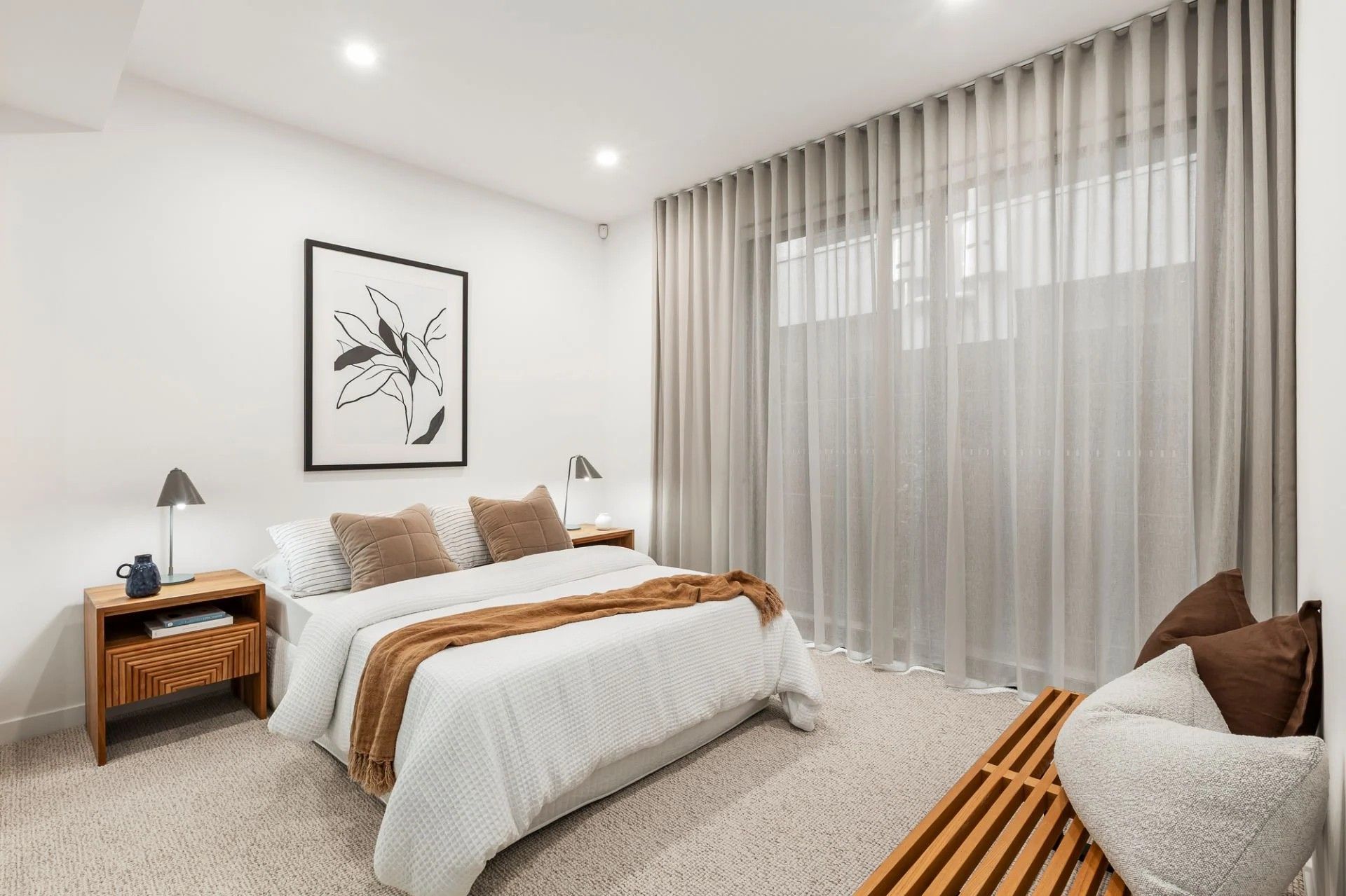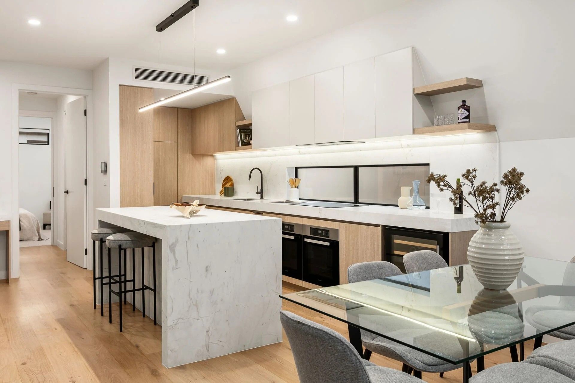 The design embraces natural light and elegance at every turn, with wide oak flooring, high ceilings, and garden outlooks. Two generously sized bedrooms are located on the ground floor alongside a stylish bathroom, while the upstairs main suite enjoys a sleek en-suite, large walk-in robe, and north-west aspect.