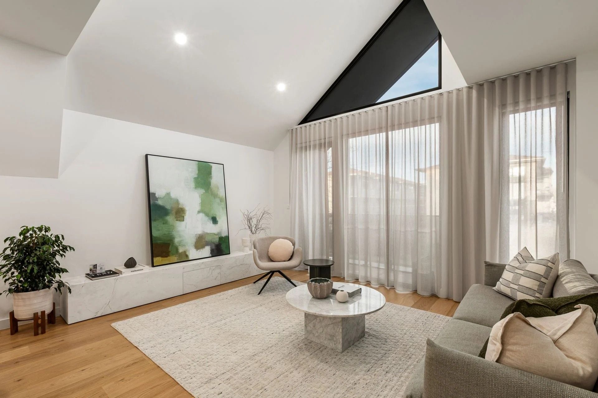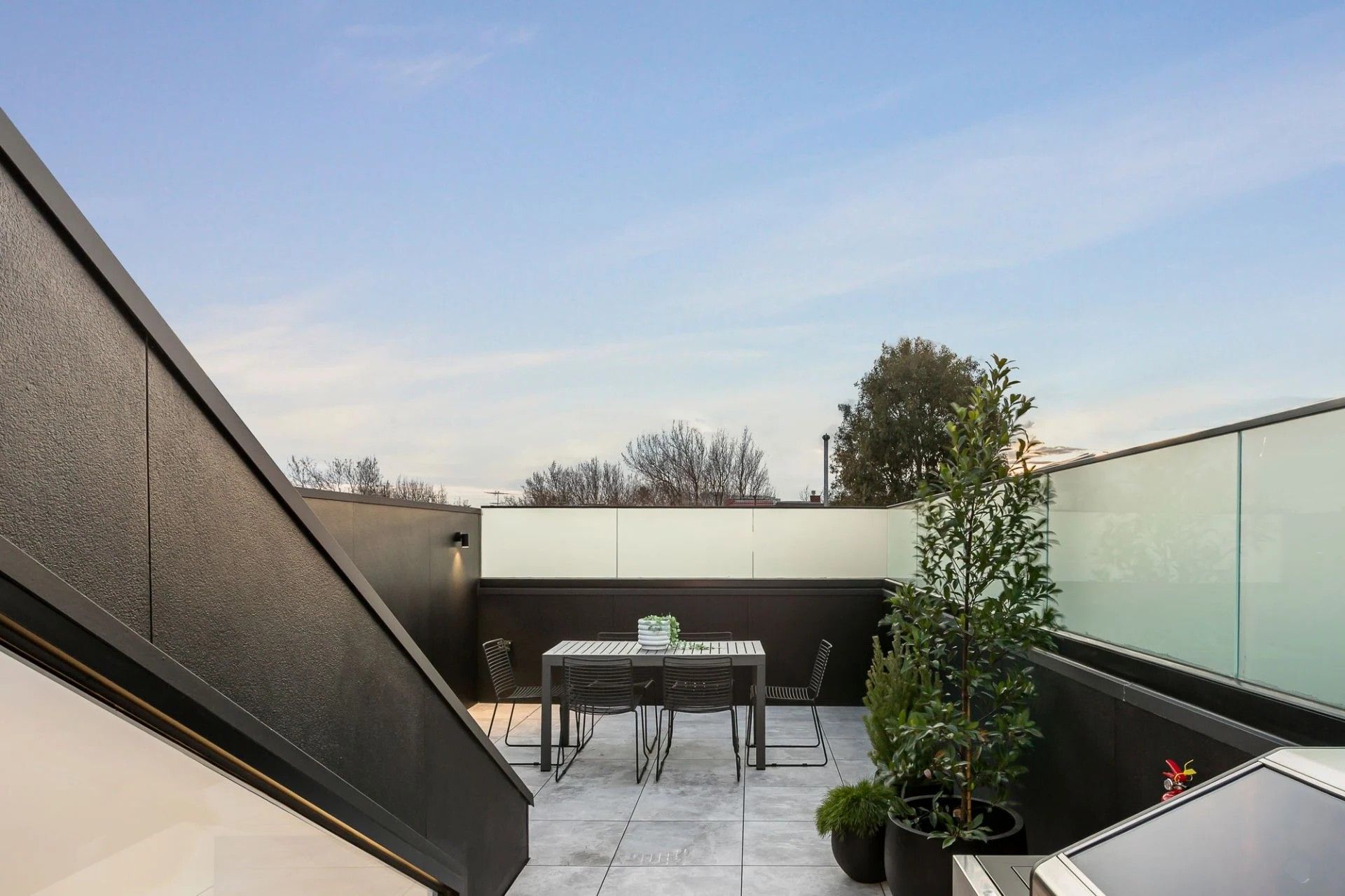 The open-plan living and dining zone features a striking architectural roofline, abundant sunlight, and seamless indoor-outdoor flow to a spacious balcony. The gourmet kitchen boasts marble surfaces, Miele appliances, integrated refrigeration, and a wine fridge. An expansive rooftop terrace with built-in BBQ captures all-day sun – perfect for summer gatherings.