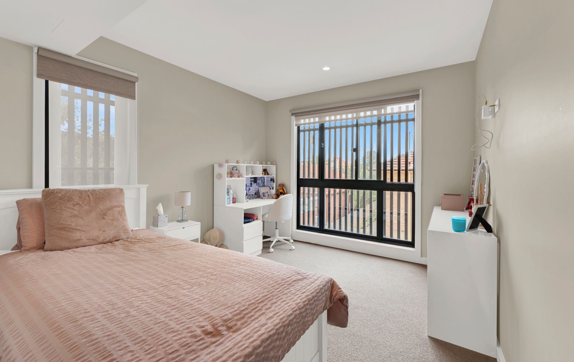 Downstairs, you are welcomed by a private, leafy front courtyard that sets the tone for what’s inside. The home opens into a stunning open-plan kitchen, living and dining area filled with natural light and finished with sleek Bosch appliances and modern design. This level also features a stylish powder room and a generous bedroom complete with walk-in robe and private ensuite, perfect for guests, family, or flexible living arrangements.