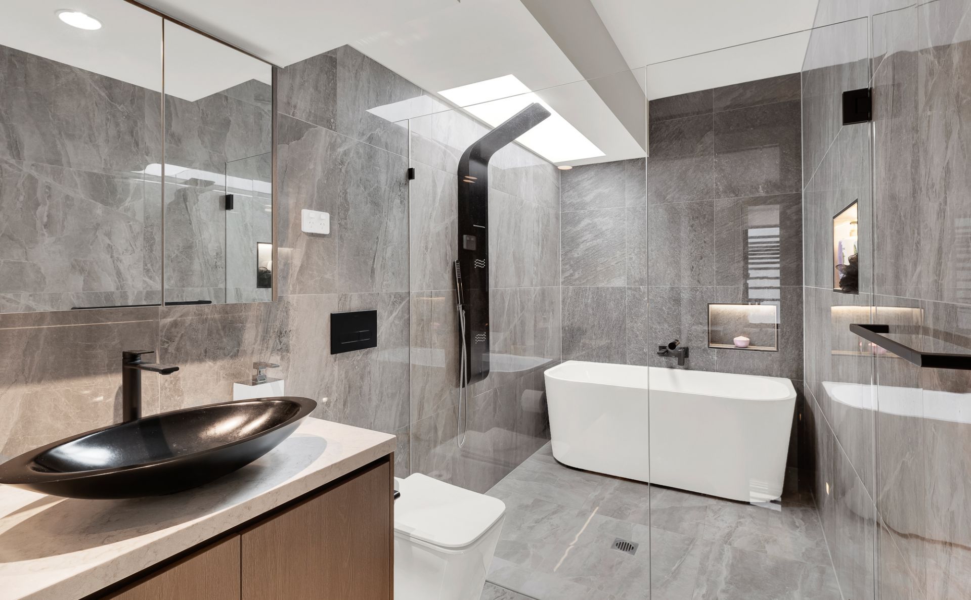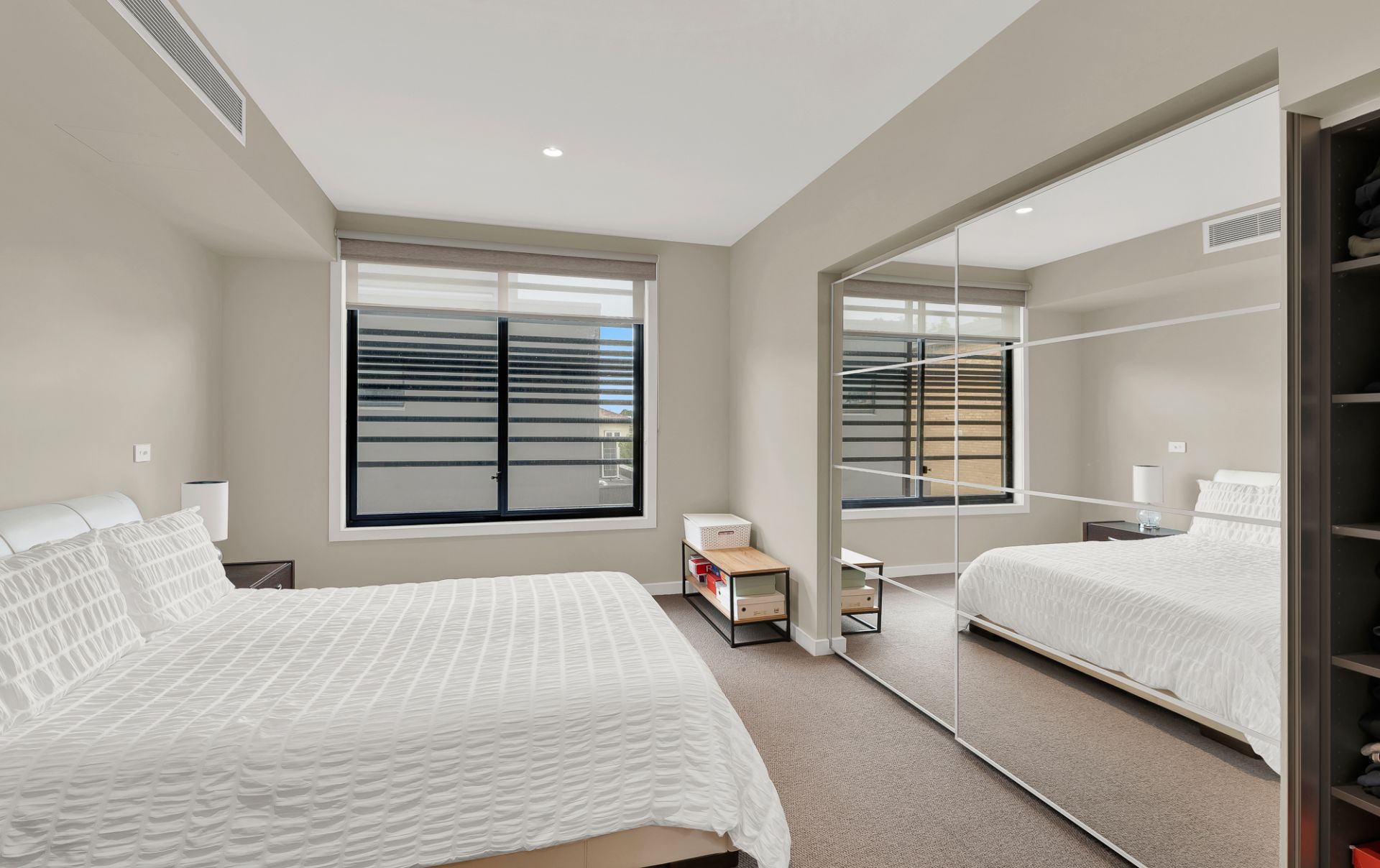 Upstairs, a second living area provides the ideal space for a retreat, home office, or media room. The level also includes a central contemporary bathroom, a second bedroom with walk-in robe, a linen cupboard for added storage, and a luxurious main bedroom featuring built-in robes and a beautiful ensuite with separate bath and shower, creating a true private sanctuary.
