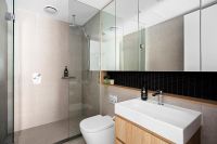 The expansive master suite provides plenty of room, even for a study nook, and features an ensuite with modern wall-hung vanities and a concealed cistern.