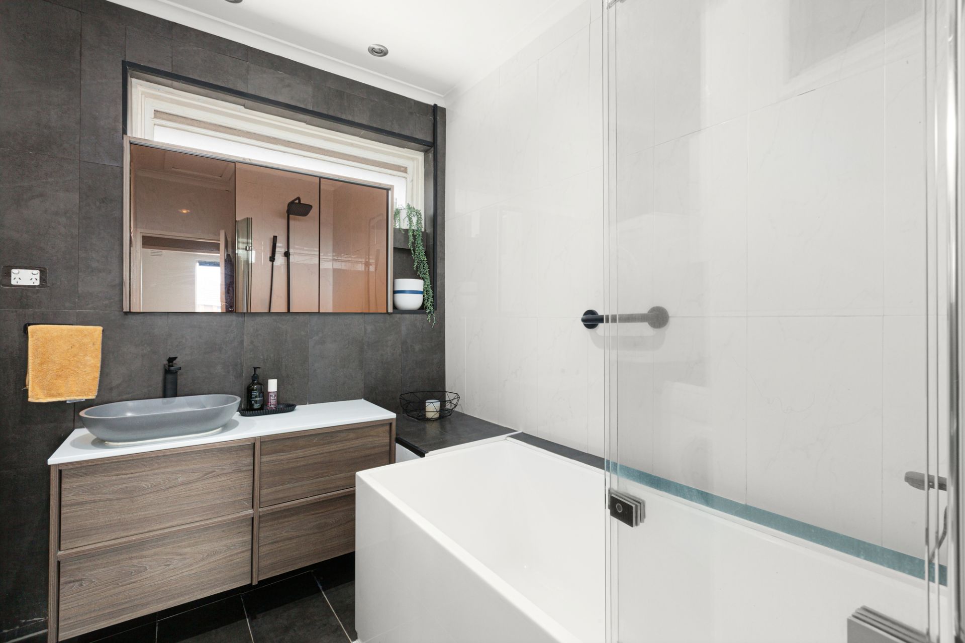 The apartment offers two spacious bedrooms with built-in robes, serviced by a contemporary bathroom boasting a bath with a dual-head shower, chic black tapware, and integrated laundry facilities for added convenience.