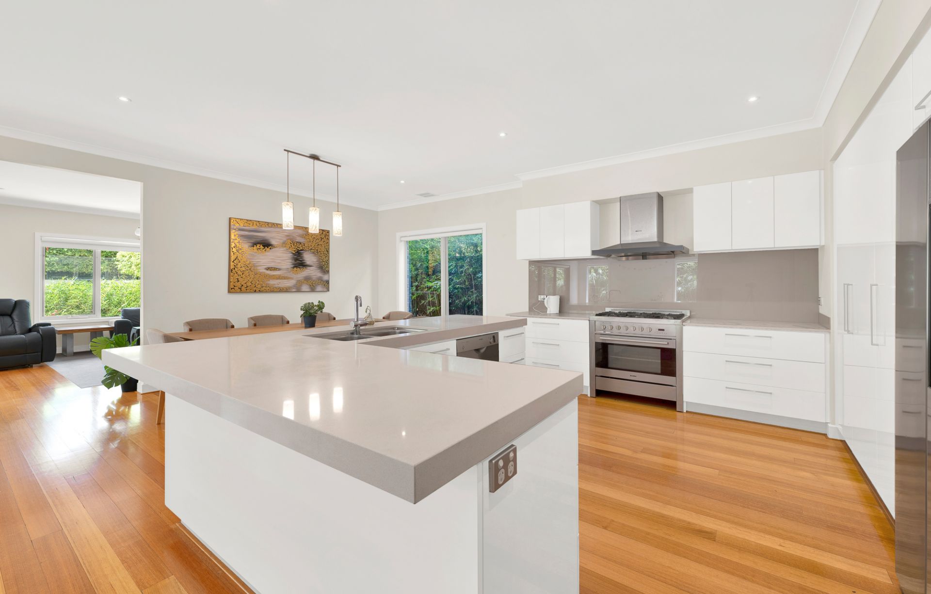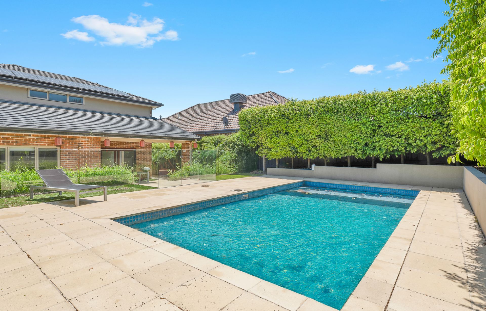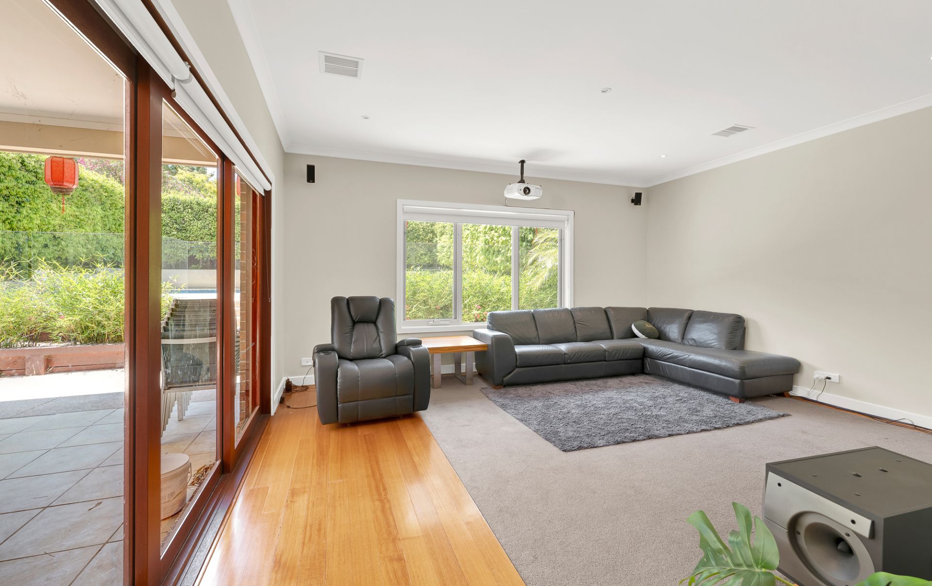 A practical, flowing floorplan features Tasmanian Oak flooring throughout the ground level, opening to a formal sitting room and separate study. The sleek, well-appointed kitchen is finished with CaesarStone benchtops and quality stainless steel appliances, overlooking an expansive sun-drenched family living area. This space seamlessly extends to a covered alfresco zone, solar-heated swimming pool, and a private landscaped garden framed by ornamental trees.