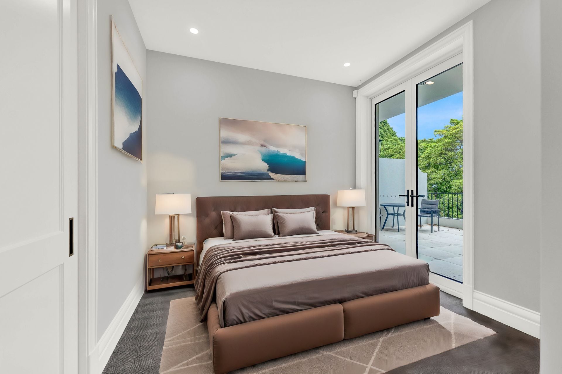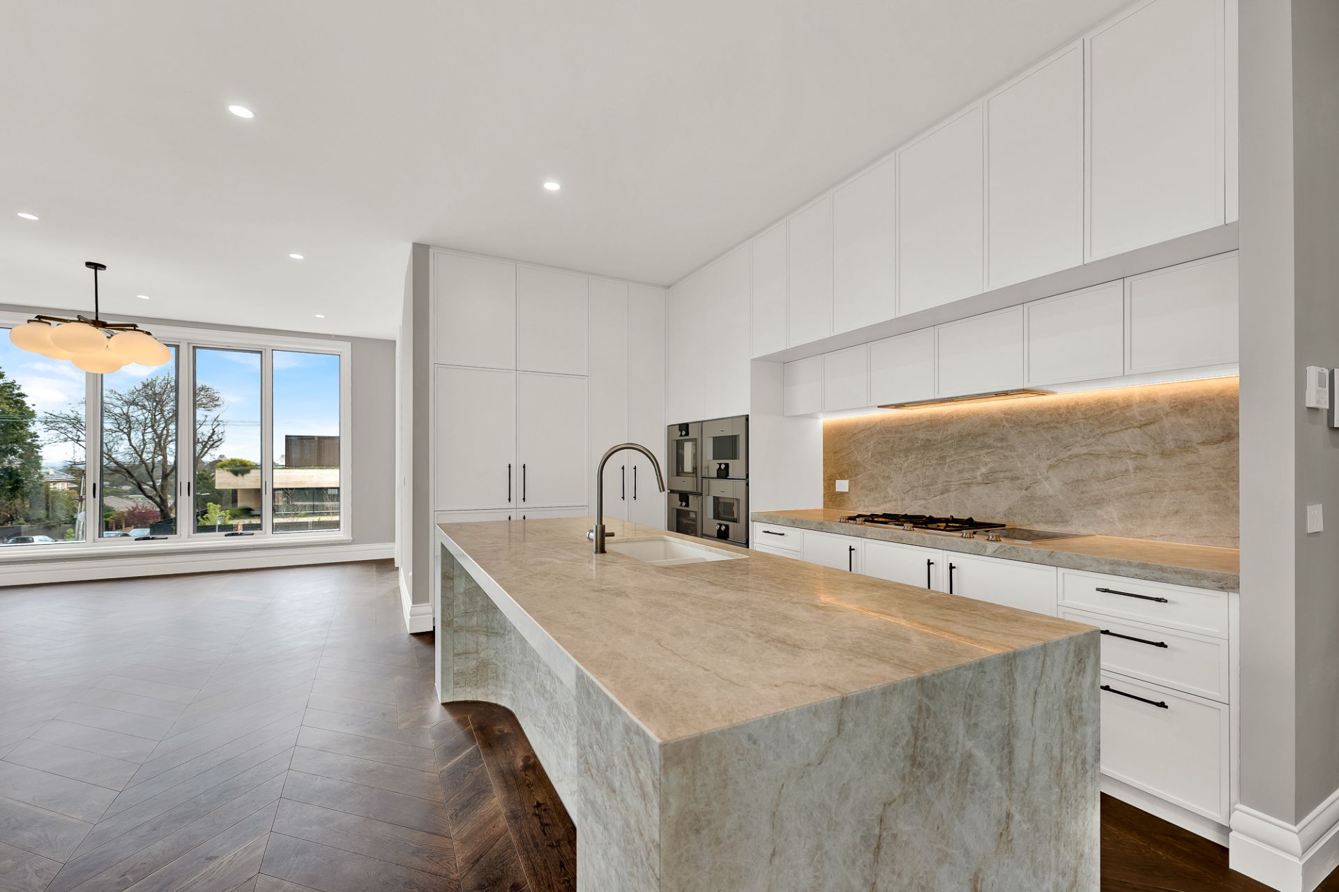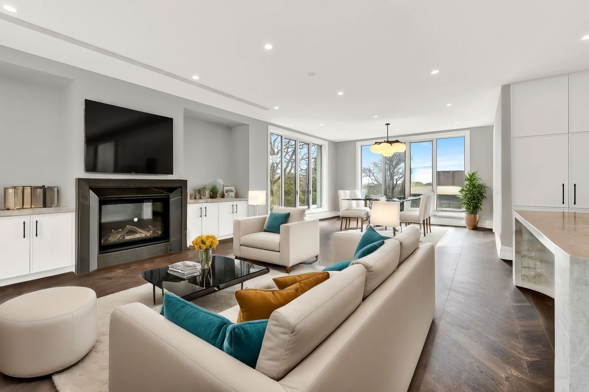 The spacious, light-filled open-plan living and dining areas are anchored by a Pietra Grigio limestone gas fireplace. French doors lead to an elevated terrace, ideal for alfresco dining and entertaining. The state-of-the-art kitchens, featuring Taj Mahal quartzite and top-of-the-line Gaggenau and Liebherr appliances, is a culinary masterpiece with pyrolytic ovens, steam/microwave ovens, an induction/gas cooktop, dishwashers, and a butler's pantry.