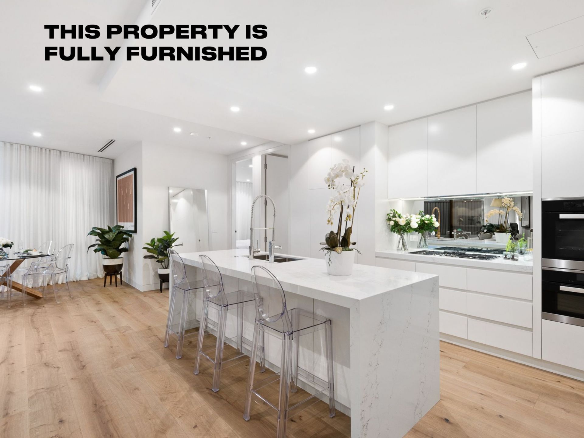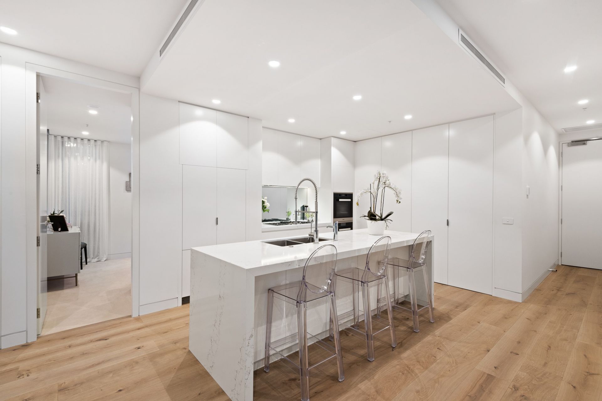 Large open plan spacious entertaining areas flow seamlessly from the impressive kitchen with white stone benchtops, through to the living and dining zones with beautiful views of the Paul Bangay designed gardens. Top of the range European appliances include a full size Miele oven & speed oven, integrated Miele dishwasher, Miele gas cooktop and an integrated double fridge and freezer.