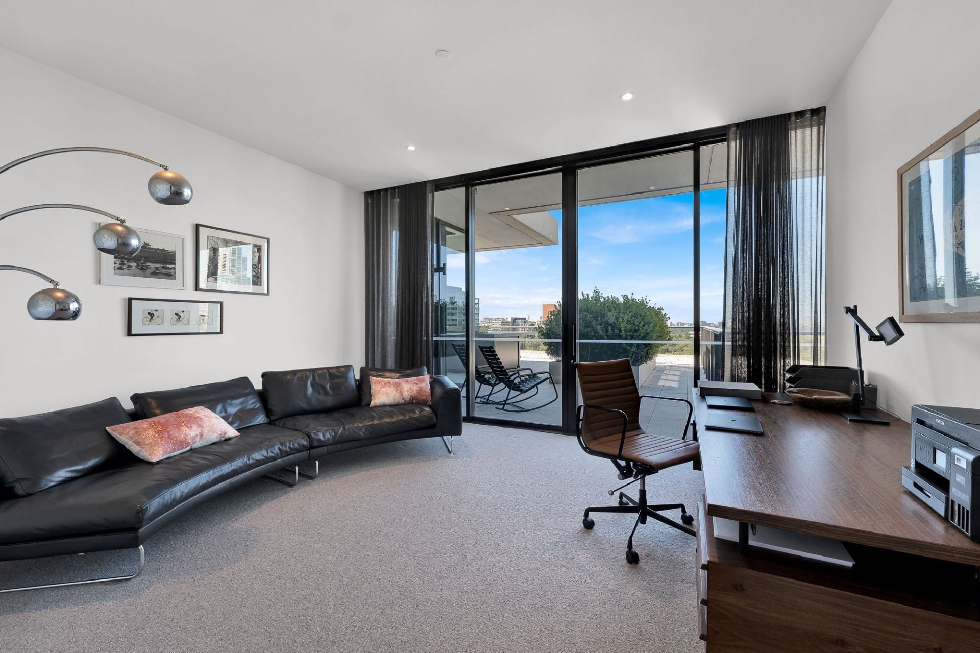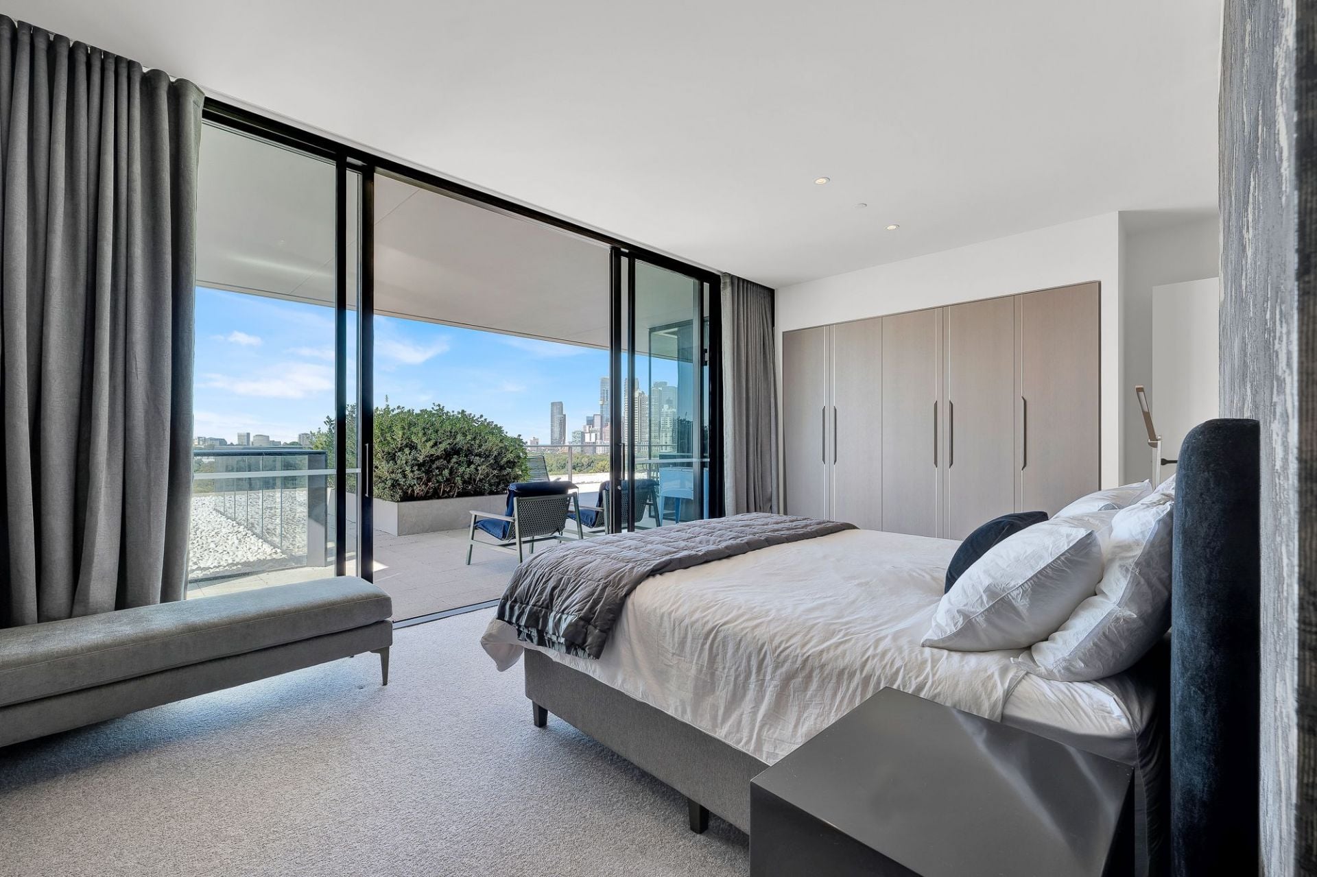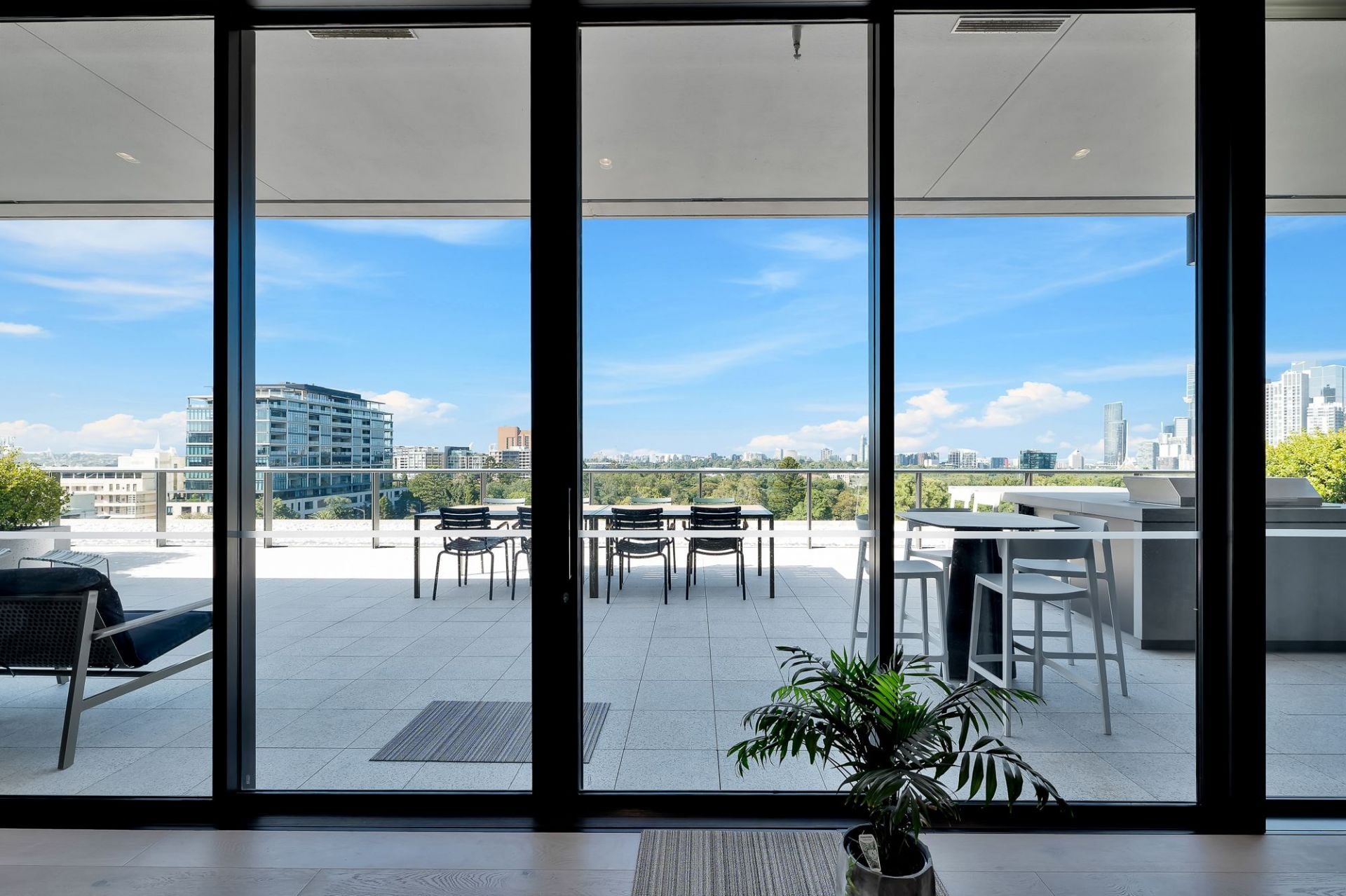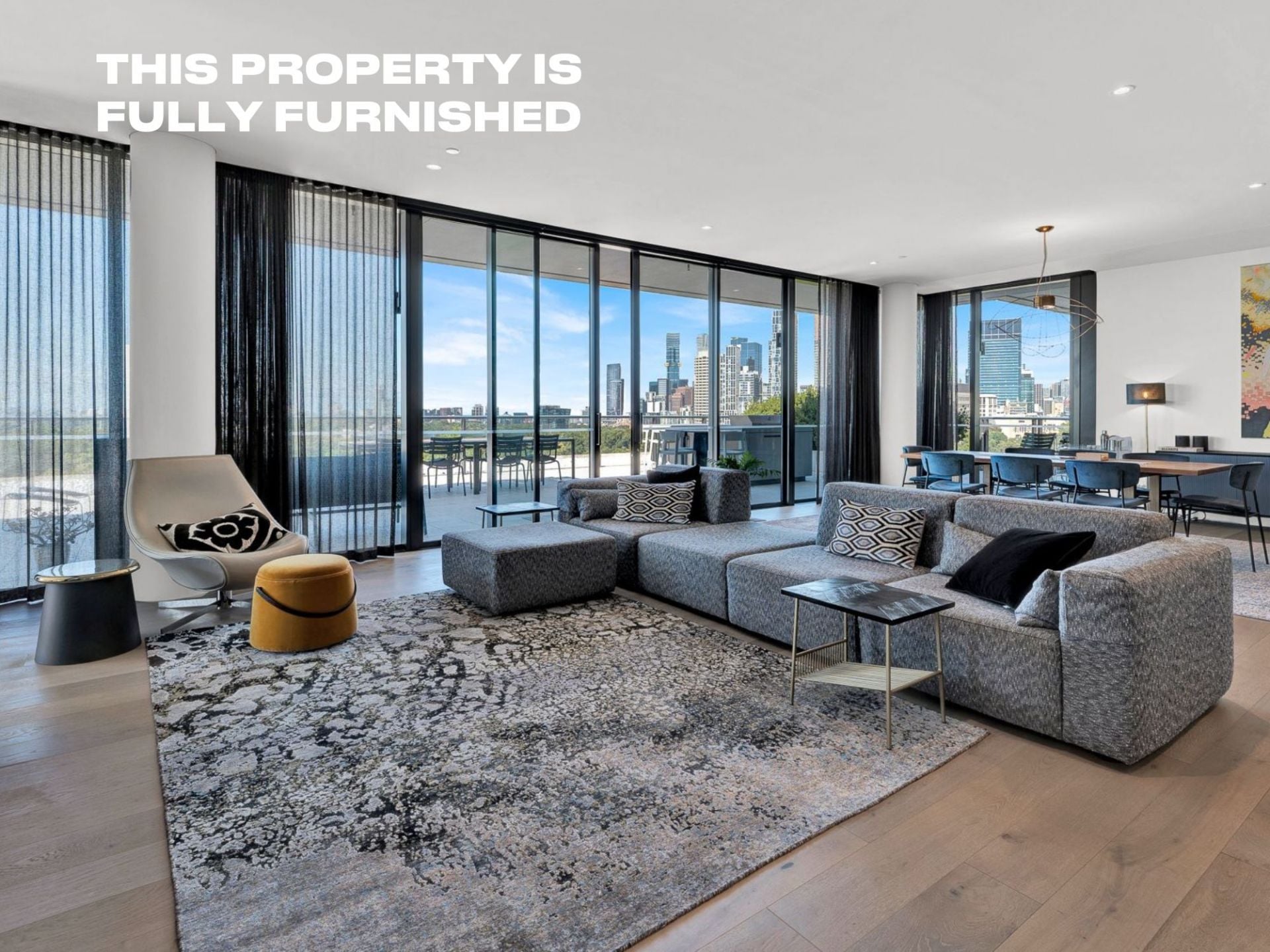 Upon entry, you're welcomed by a grand, open-plan living and dining area, flooded with natural light through floor-to-ceiling windows that seamlessly transition to a full width private garden terrace. Complete with a built-in BBQ, this outdoor space offers magnificent vistas of Melbourne’s dynamic skyline, making it the ultimate venue for lavish indoor-outdoor entertaining. A premium gourmet kitchen and fully-equipped butler’s pantry, featuring top-of-the-line European appliances—ovens, coffee machine, integrated Liebherr fridge/freezers, and Miele wine fridge—make hosting a breeze.