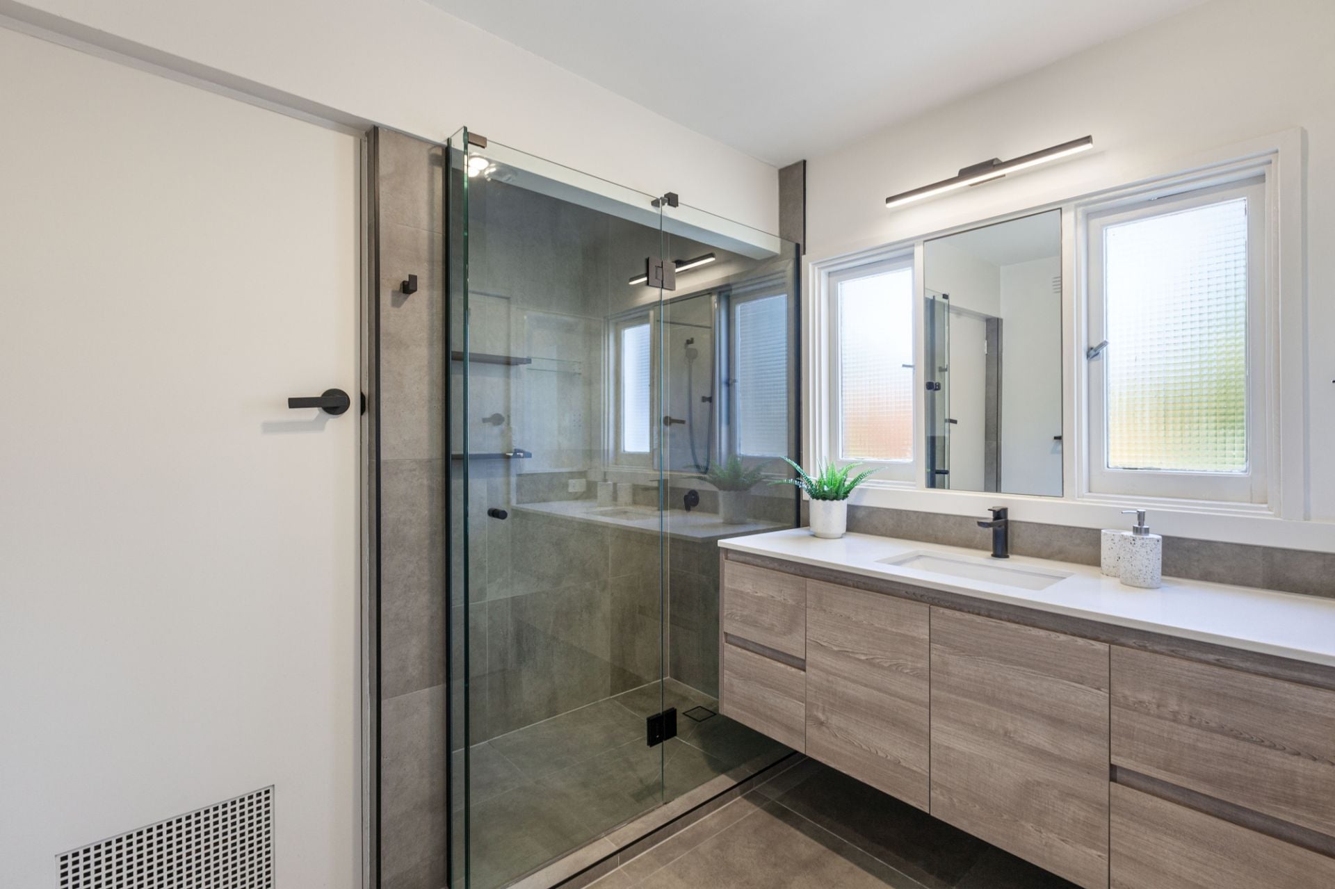 Both bedrooms are serviced by a stylish bathroom which offers a stone-topped vanity with storage, a spacious walk-in shower and striking black fixtures and fittings.