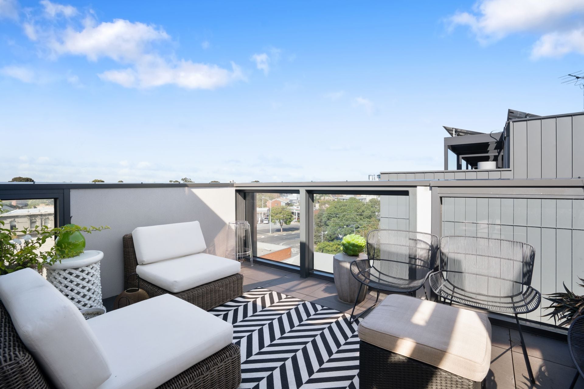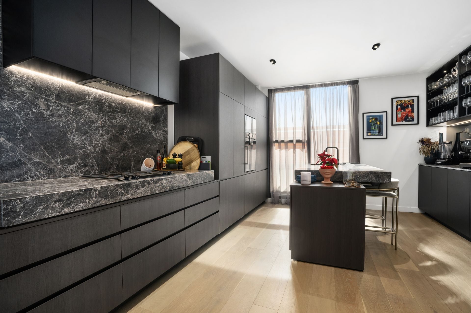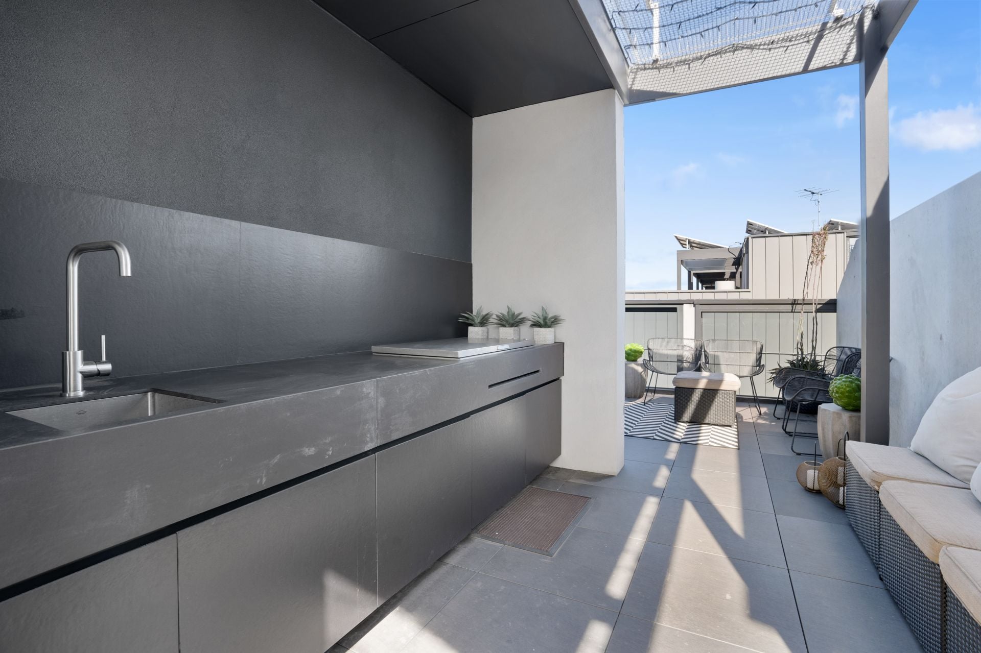 Above it all, uninterrupted views of the Melbourne skyline unfold from the wrap-around rooftop terrace, complete with an outdoor kitchen — perfect for summer evenings and entertaining against a spectacular city backdrop.