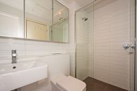 The contemporary bathroom is bright and functional, incorporating discreet laundry facilities for added convenience. Additional features include reverse cycle heating and cooling, secure intercom entry, and a dedicated car space.