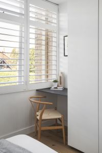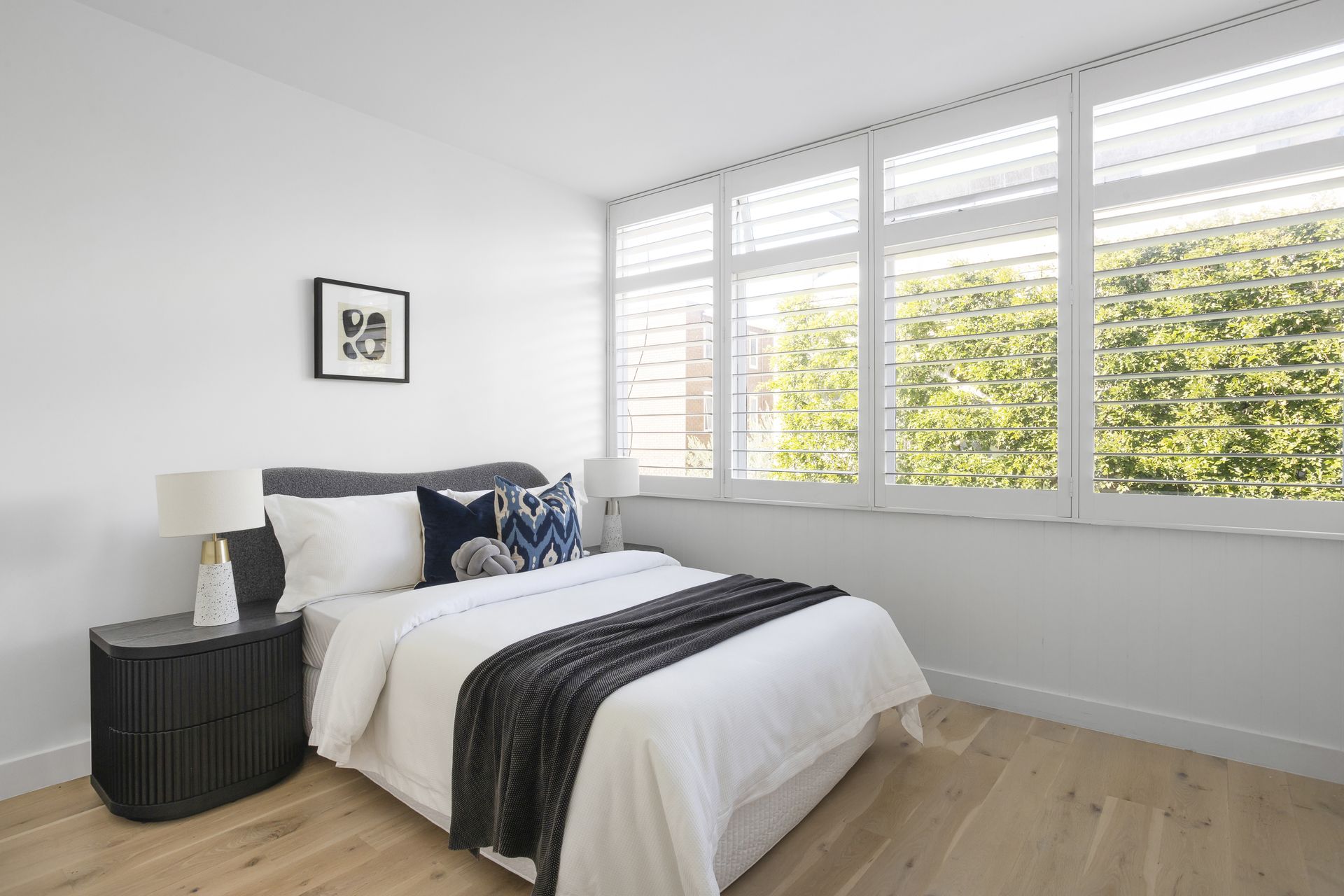 Indulge in relaxation in the sleek, fully tiled bathroom, complete with a concealed European laundry and ample storage within the cabinetry. Plantation shutters adorn the bedrooms, providing privacy and elegance, with the main bedroom boasting an inbuilt desk and soft-close two pack cabinetry. Throughout the apartment, engineered floorboards create a seamless flow.
