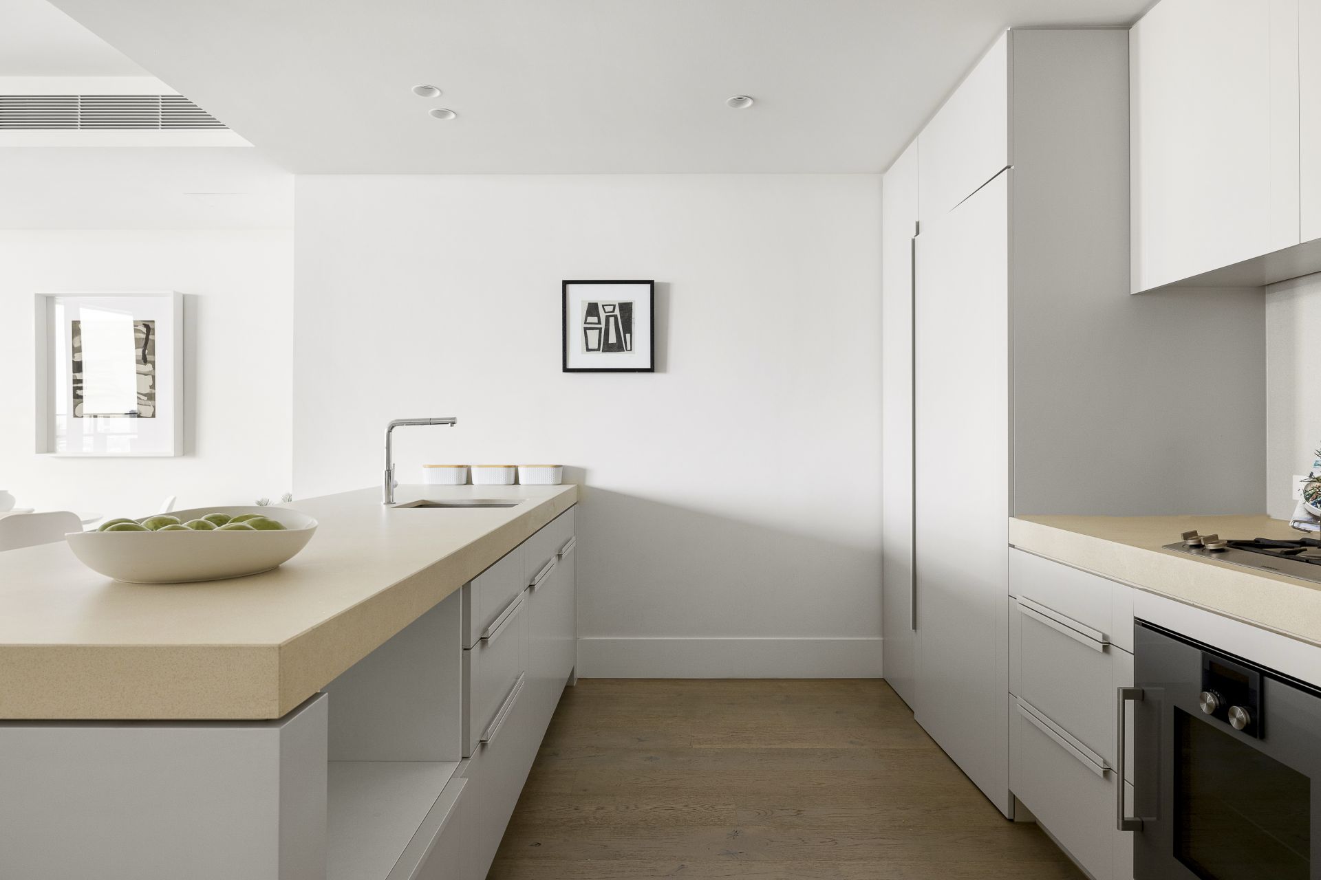 The elegant open-plan living and dining space feature floor-to-ceiling glass windows and a custom-built study corner. The gourmet kitchen is a masterpiece with luxurious stone benchtops, stunning light cabinetry, premium Gaggenau appliances, integrated dishwasher, and ample storage.