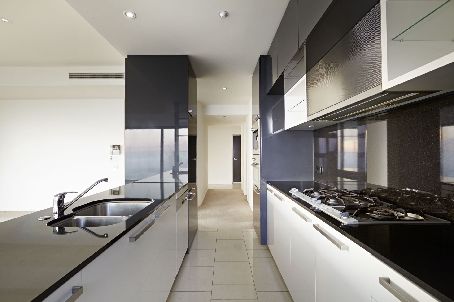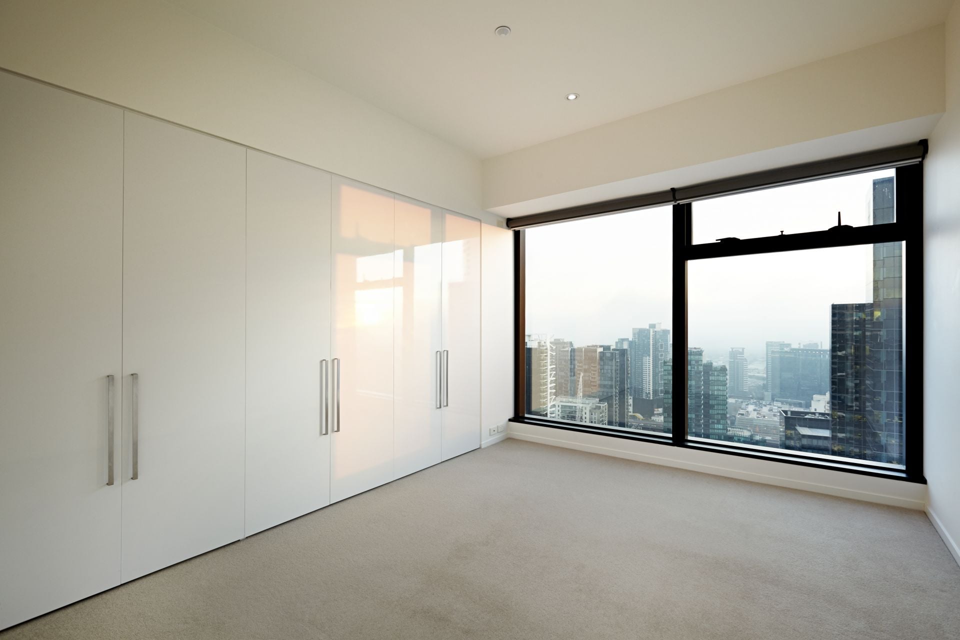 The modern kitchen, fitted with premium appliances including a dishwasher, integrated fridge and quality stainless steel cooking appliances, flows into an expansive open-plan living area, opening onto a private balcony with panoramic city views. New carpets throughout and automatic blinds in every room elevate the level of comfort and sophistication.