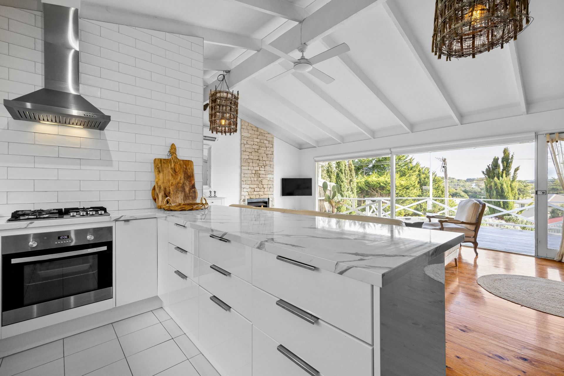 Step on to the elevated, expansive front deck, designed for seamless outdoor living, featuring a covered entertaining area, comfortable seating for eight, and stunning views that enhance your alfresco experience. Inside, the spacious and sun-filled open-plan living space is perfect for relaxation, featuring a digital TV, open fireplace, reverse cycle air-conditioning, and a ceiling fan to ensure year-round comfort.