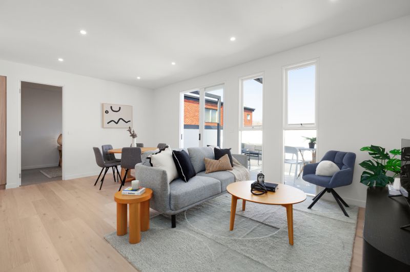 Two sun-drenched bedrooms feature built-in robes, while the stylish central bathroom/laundry boasts sub-floor heating for year-round comfort. Additional highlights include timber flooring, split-system heating and cooling, security alarm and an on-title car space.