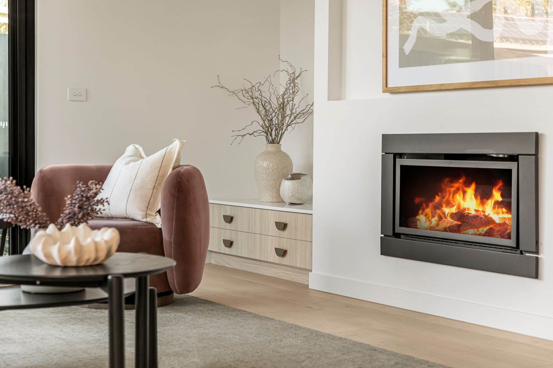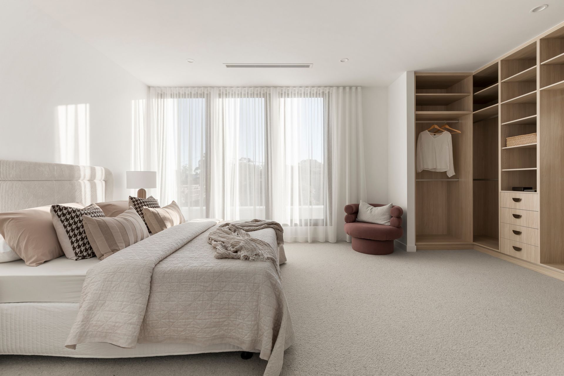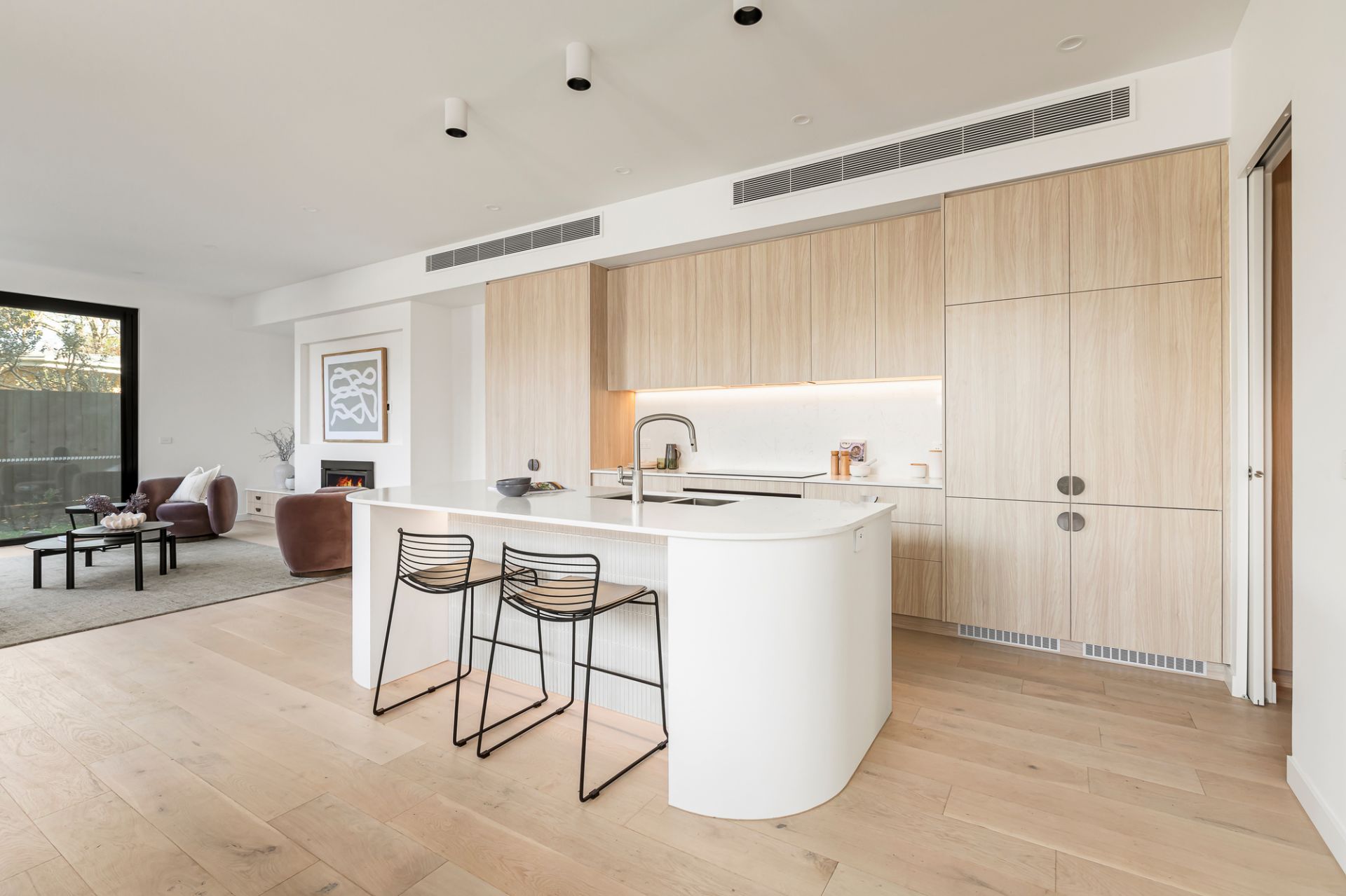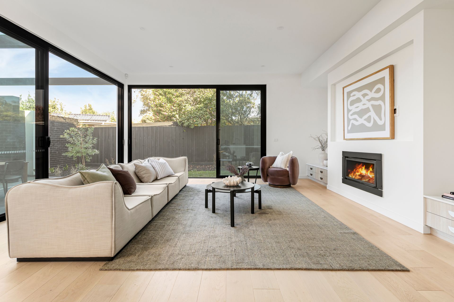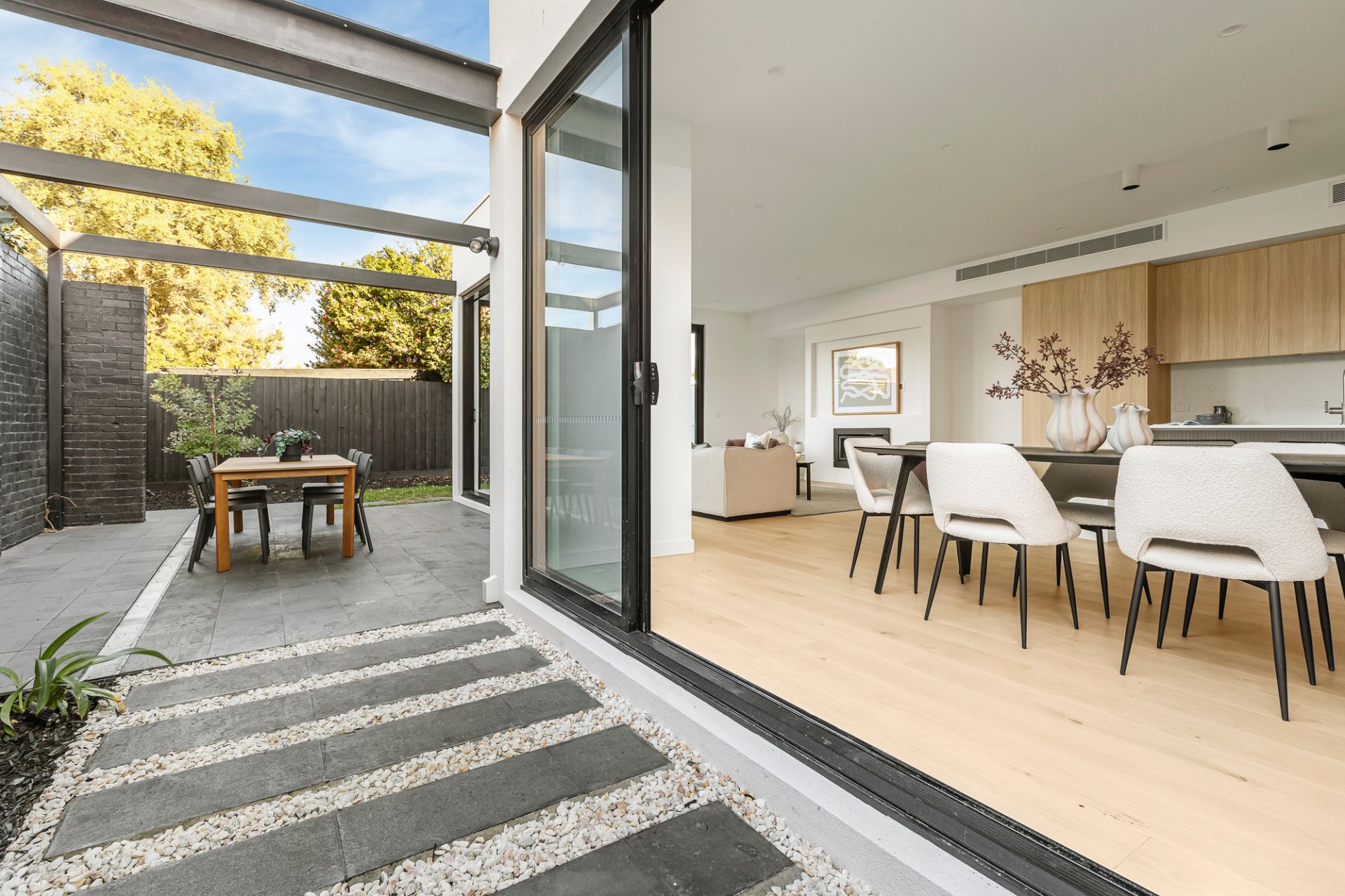 American oak floors and high ceilings flow through interconnected zones, where each space is tailored to contemporary family needs. A luxurious ground-floor guest bedroom with walk-in robe and dual-access ensuite sits separately from three upstairs bedrooms, all with walk-in robes, including a main suite with a freestanding bath and a bespoke dressing room. The expansive open-plan living and dining area unfolds via full-width retractable glass walls, extending to a landscaped, bluestone-paved alfresco domain with an architectural pergola, offering effortless seasonal transition for dining and entertaining. A gas fireplace infuses the living room with ambient warmth, while the gourmet kitchen provides an excellent centrepiece with stone surfaces, curved detailing, a walk-in pantry, and integrated German-made Häfele appliances, including a side-by-side refrigerator.