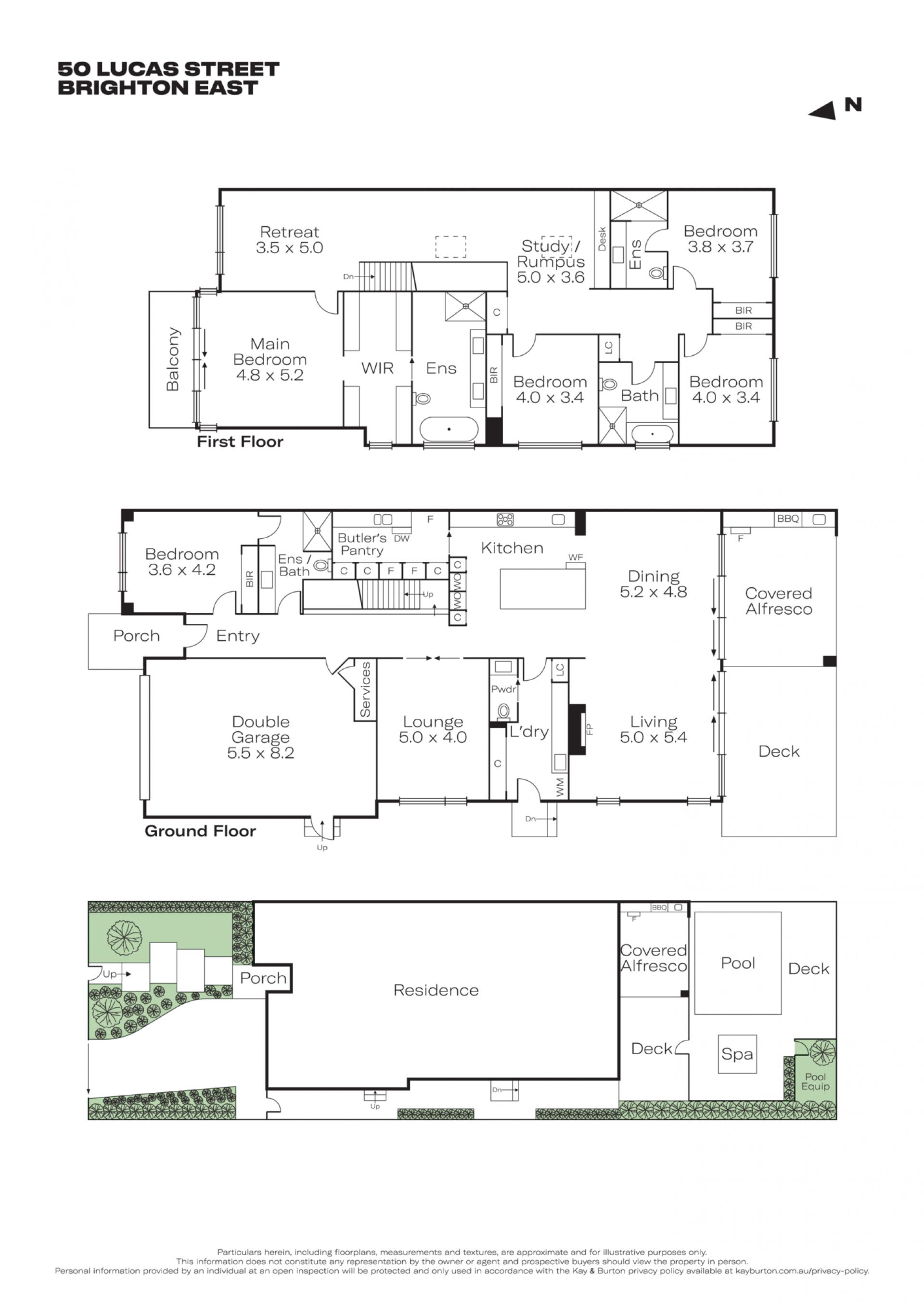With its signature timber battens and lush gardens leaving a lasting impression, a grand pivot door reveals a sweeping interior where craftsmanship and function go hand-in-hand. A ground-floor guest room with a robe and semi-ensuite is the ideal counterpart to outstanding accommodation above, with a double walk-in robe, scenic balcony, elegant ensuite, and option of a separate air conditioning system all enhancing a stellar main bedroom. A robe and ensuite feature in a sizeable third bedroom, while a lavish central bathroom joins excellent storage in serving bedrooms four and five. With a multi-user study superb for school-age kids, a substantial upper lounge and ground-level media room offer all the flexibility a family could ever ask for; perfect complements to a brilliant entertainer’s suite at plan’s rear.