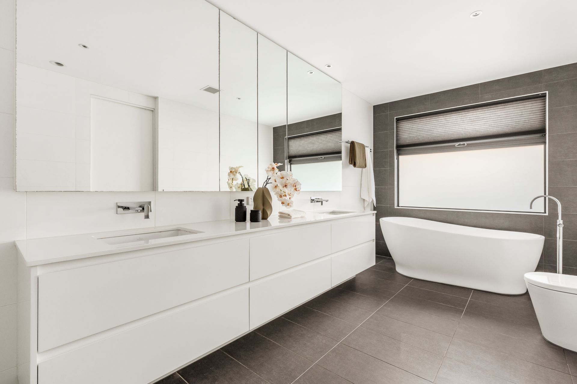 Two sets of stacker glass see vast living/dining and outdoor domains seamlessly combine, with any and all gatherings capably served by an upscale kitchen’s profuse cabinetry, lengthy stone benches, butler’s pantry, and top-of-the-range Liebherr and Miele appliances. A louvre-top alfresco with a complete barbecue kitchen heights hospitality prowess beyond compare, while tall, sculpted greenery gifts total privacy to a deep backyard’s feature pool and spa. Equipped to a standard far-surpassing the high-end-home norm, other standouts include a large solar energy system, blackbutt floors, skylights, ceiling speakers, camera and alarm security, Villeroy & Boch basins, two bathtubs, gas and solar pool and spa heating, a gas-log fireplace, large laundry, powder room, oversized double garage, and electric-gated driveway housing at least two more cars.
