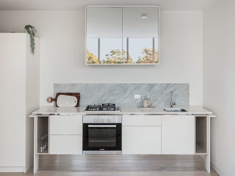 High ceilings are paired with light oak floors, crisp white joinery and slimline Corian benchtops to create an ambience of warm elegance, matched with high-end Bosch appliances and an integrated Fisher and Paykel dish drawer dishwasher. The superb scale continues into the north-facing bedroom with built-in mirrored robes, served by the fully-tiled bathroom with a walk-in shower and European laundry facilities.