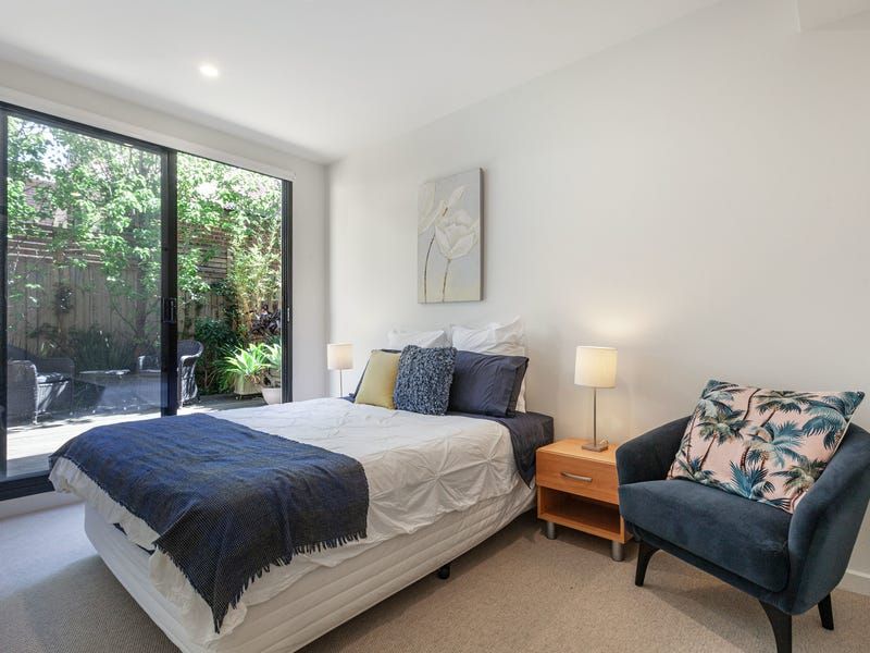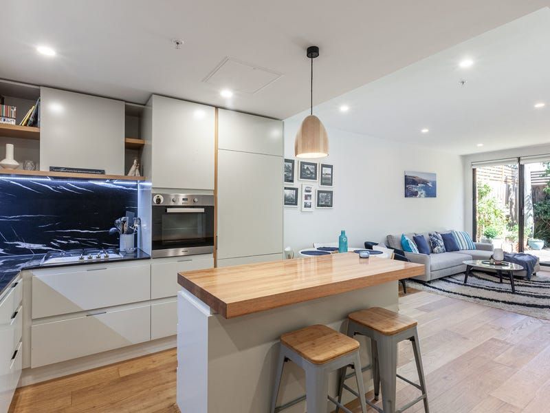 Contemporary stone and timber finishes extend to both pendant lit bathrooms, while bedrooms are fitted with built-in robes. The guest room or home office opens to a second decked courtyard that catches the bay breeze. Euro-laundry, climate control and designer-details including high ceilings, broad-board oak flooring and black steel-framed windows. Security is paramount here too, boasting video intercom and lift access from basement parking for 2 cars and a storage cage.