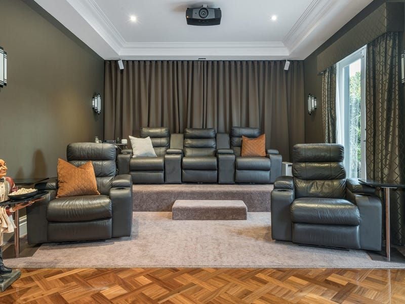 The cinema, conveniently located near the kitchen and living, has access to an expansive formal courtyard.