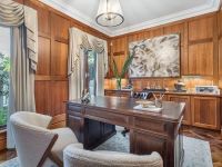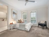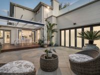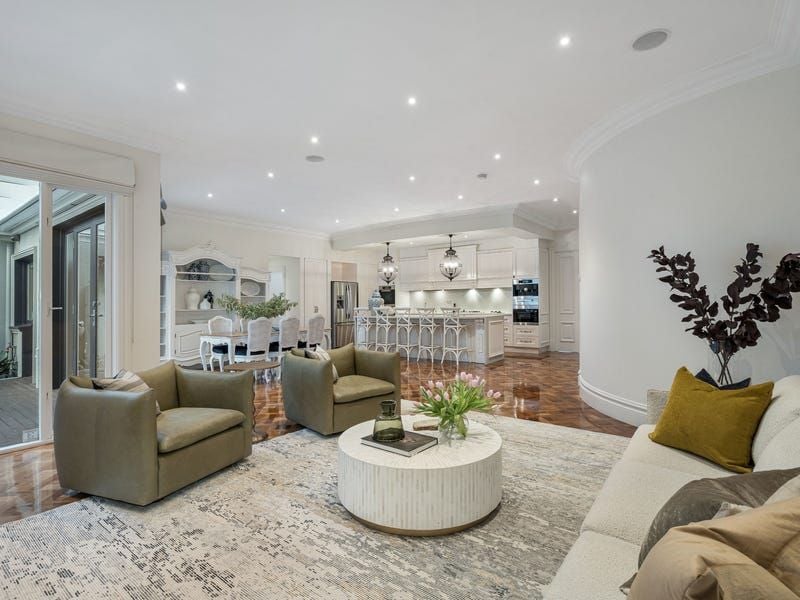 Double doors signal the entrance to the family living zone. The informal living room with a gas fireplace opens through glass doors to the north-west facing deck and courtyard garden for seamless indoor-outdoor living, while the pristine kitchen, with CaesarStone benchtops and Gaggenau and Miele appliances, overlooks the meals area .The butlers pantry, laundry and powder room are discreetly nearby.