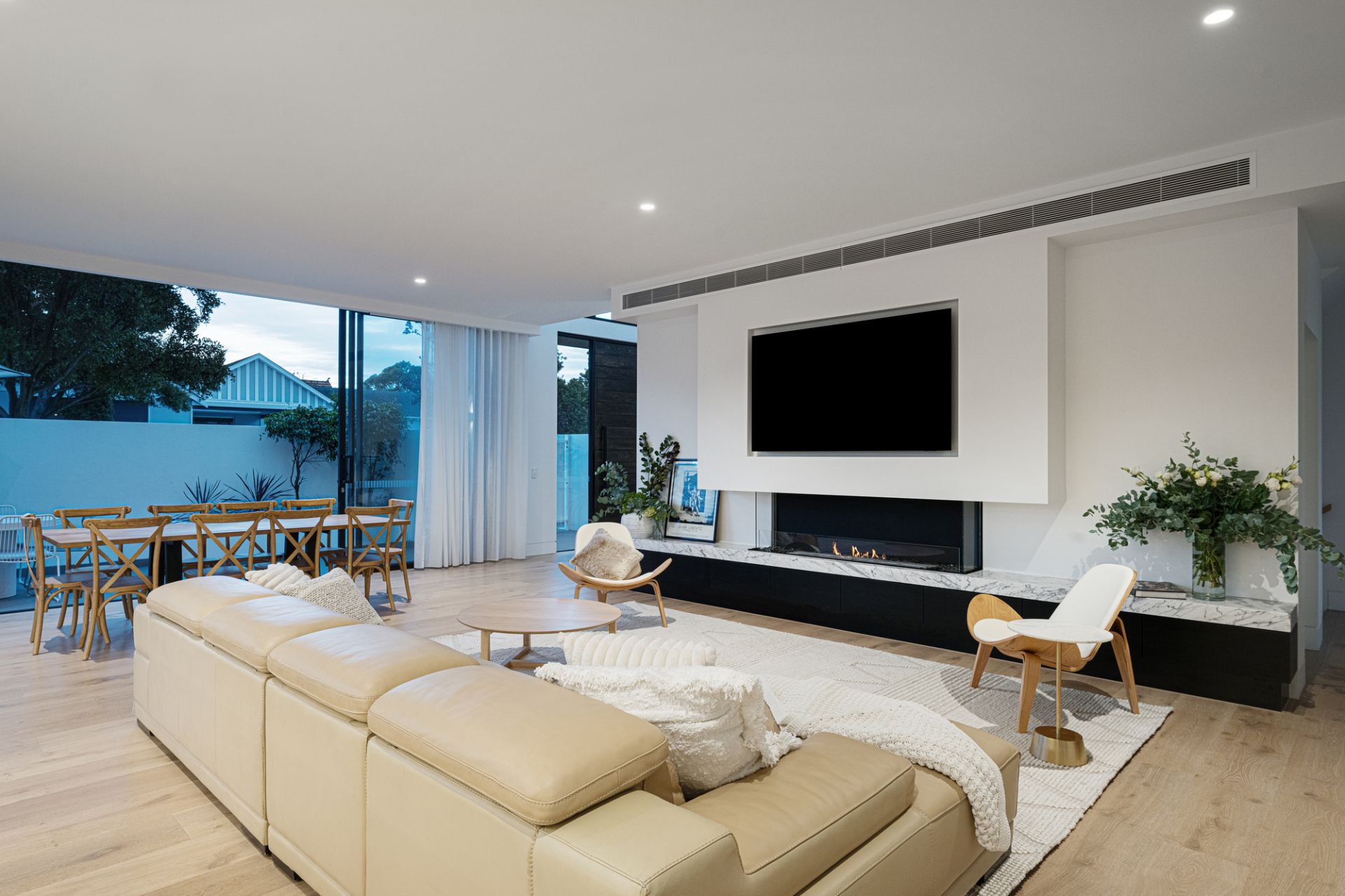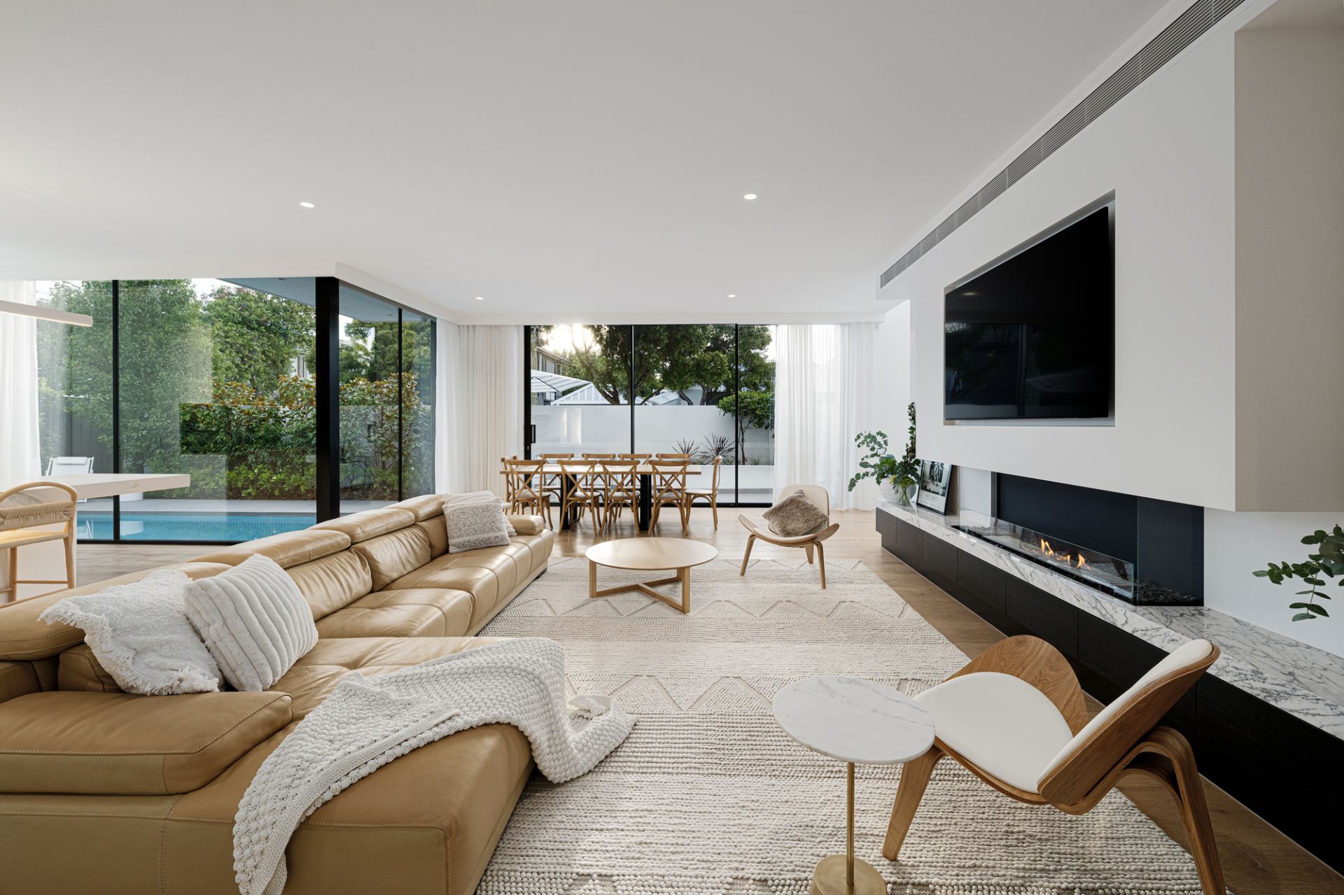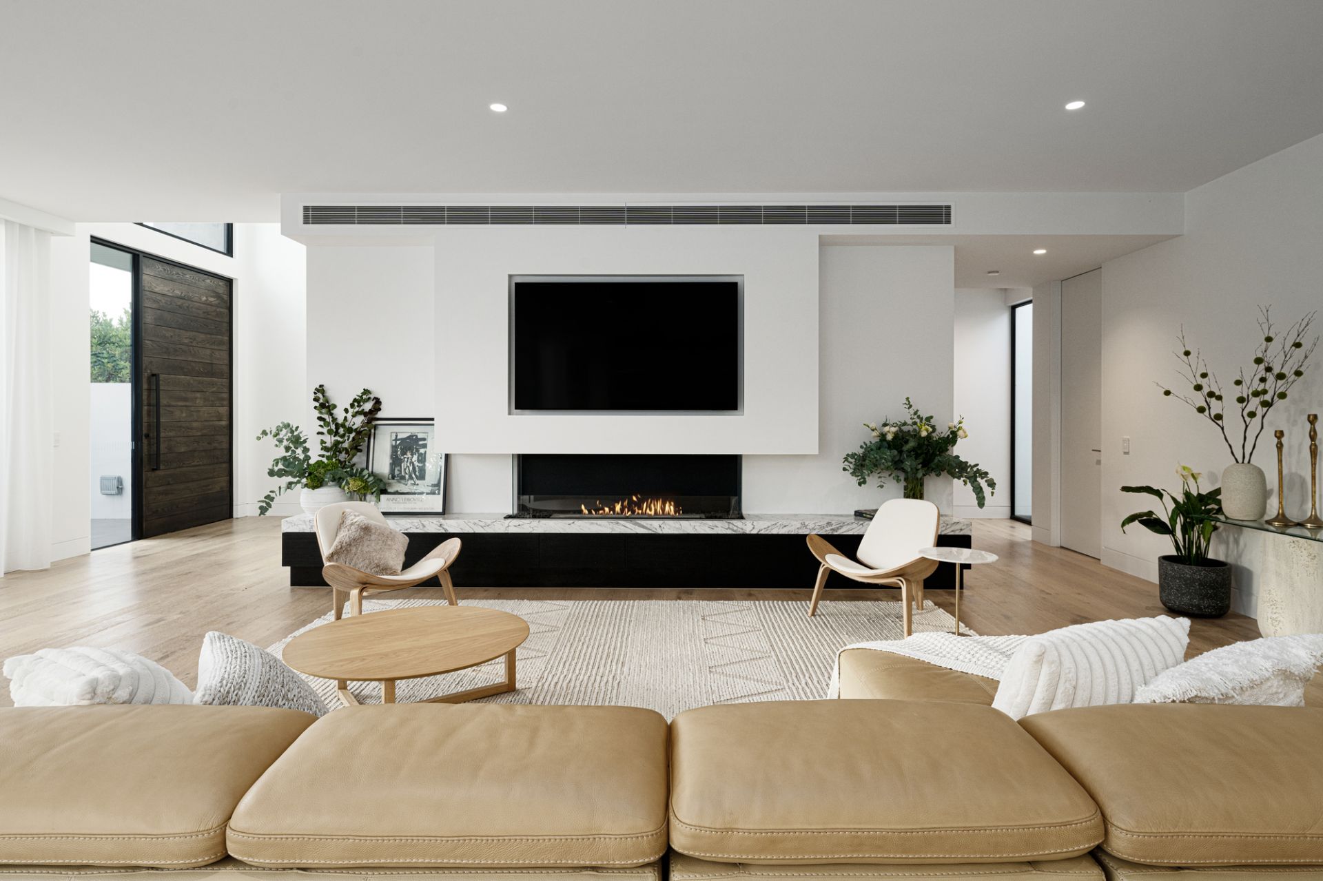 Every element, from its soaring proportions to its exquisite materiality, has been executed with an exacting vision, delivering a home where architectural ambition meets an uncompromising standard of luxury. Wide oak floors, towering ceilings, and full-height glass define the main living areas, where a marble-wrapped gas fire introduces an atmosphere of understated opulence. A state-of-the-art kitchen, equipped with premium Gaggenau appliances, integrated refrigeration, and a butler’s pantry, commands attention for the avid host, while an unbroken flow to the terrace and heated pool ensures every occasion is framed by the beauty of the low-maintenance, landscaped outdoors.