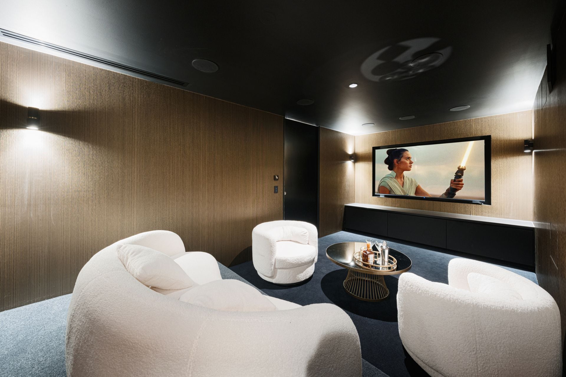 A lavish main bedroom suite occupies a privileged position on the ground floor, with its Calacatta marble ensuite and substantial dressing room offering a retreat of rare sophistication complemented by a separate home office. Above, three additional bedrooms, each with a luxe ensuite and walk-in robe, extend from a generous second living area, with east and west balcony terraces inviting all-day sun.