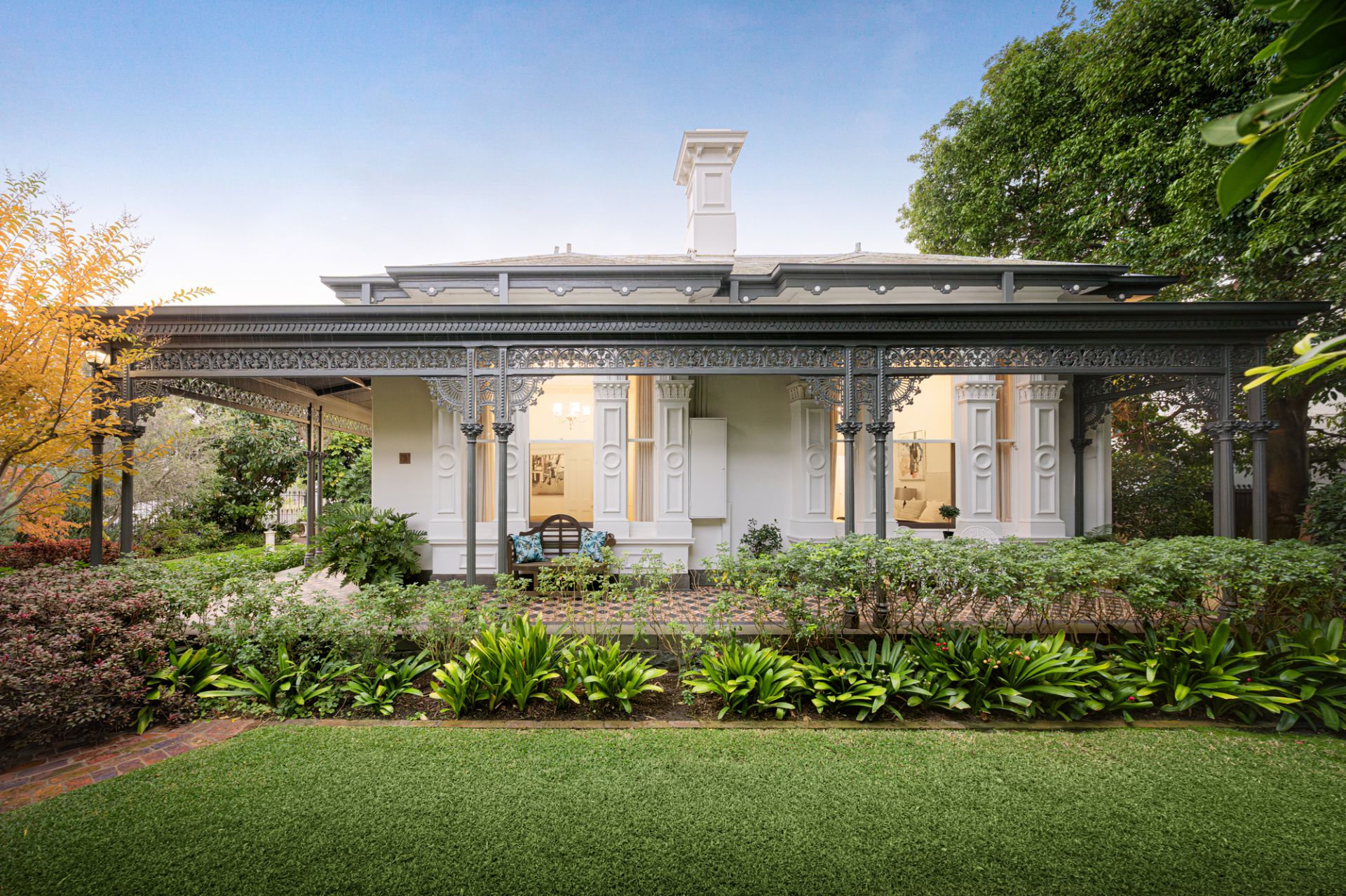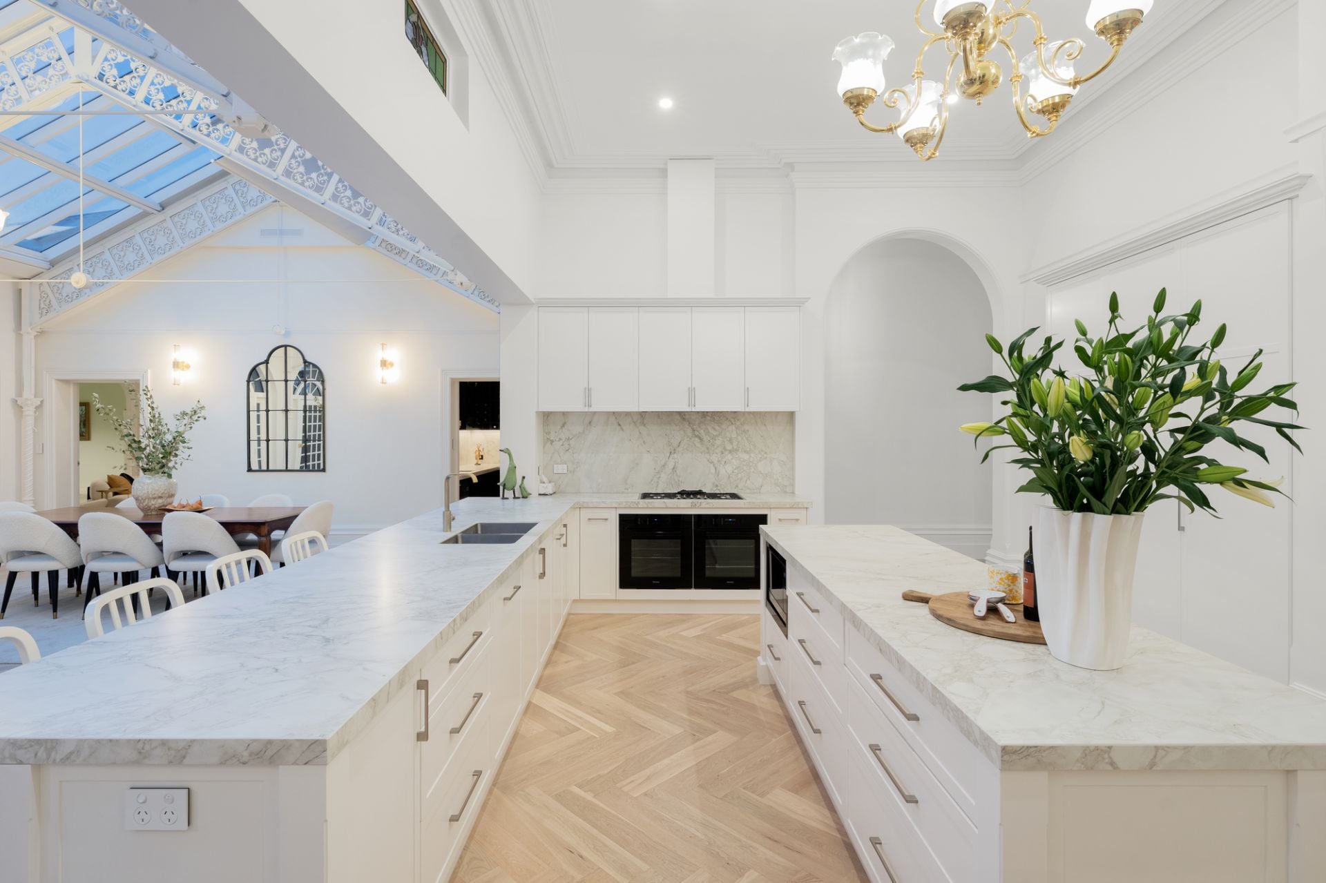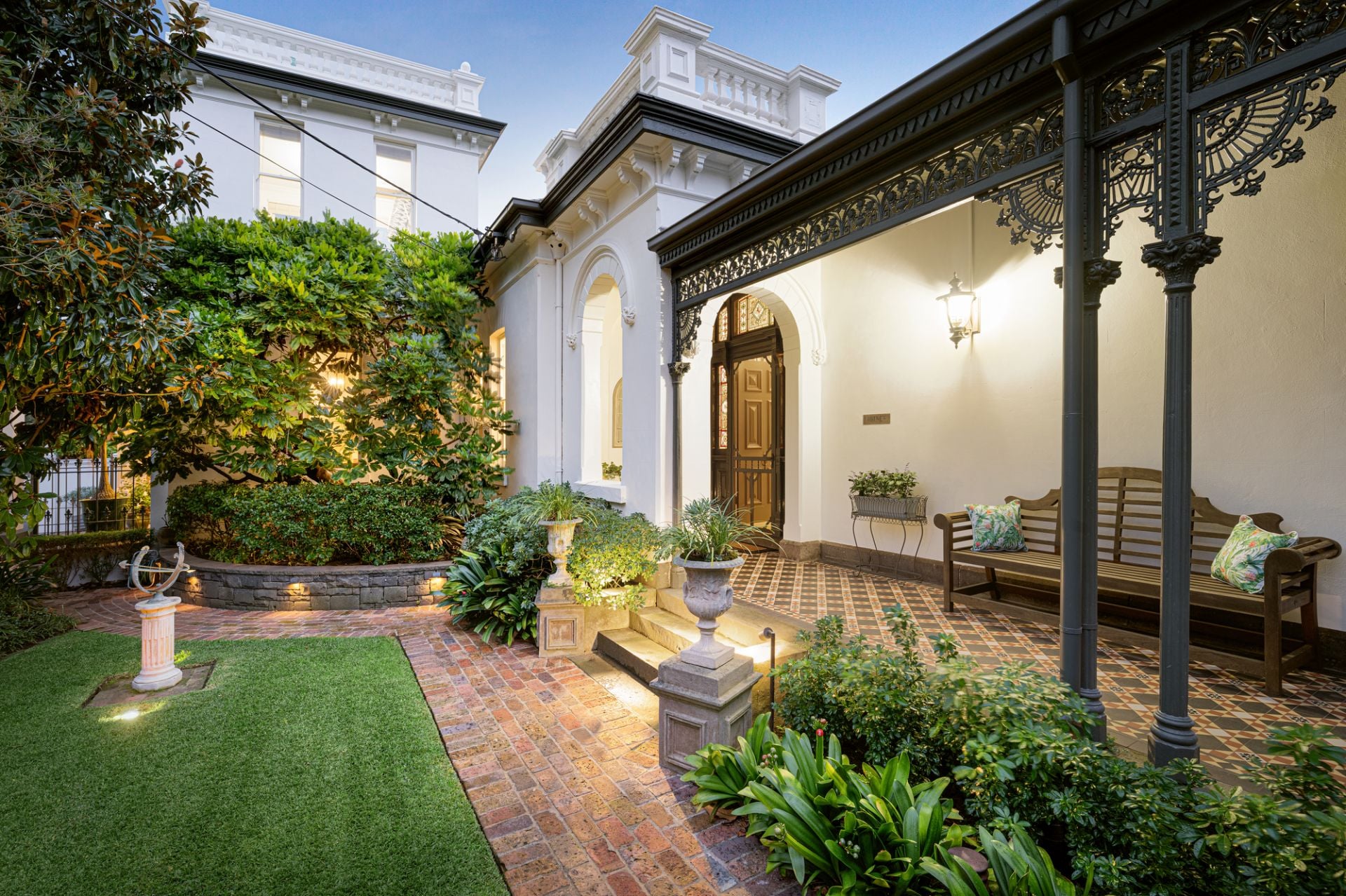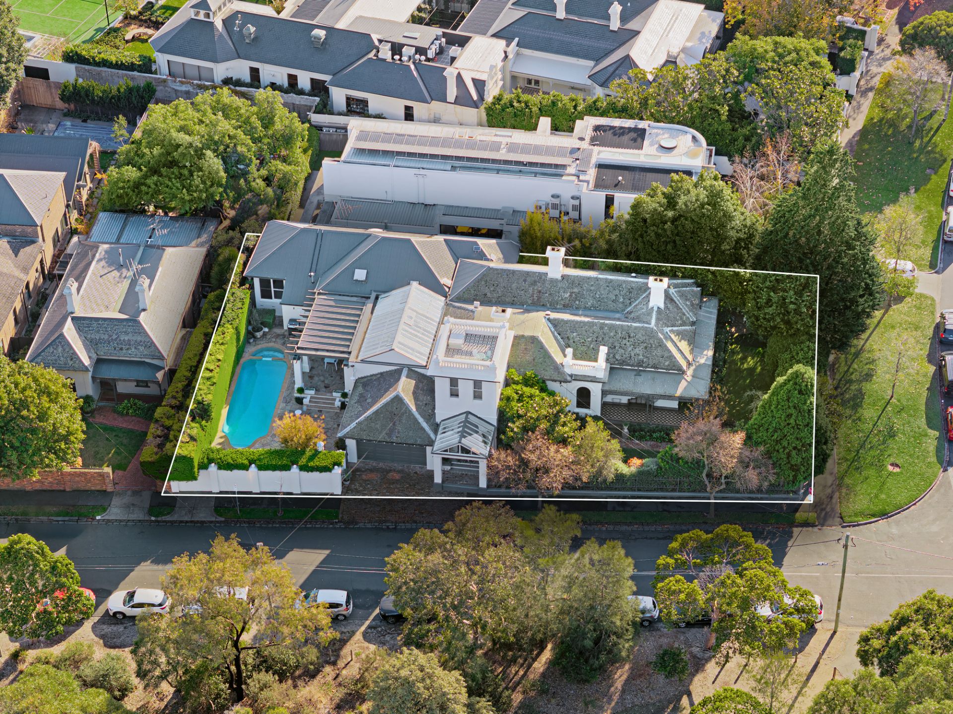 With uninterrupted frontage to Wilson Reserve, the home’s stance is made memorable by wrought-iron fences and lacework, canopies of verdure, a tessellated-tile veranda, and prominent corner position, while inside, period grace and modern luxe seamlessly entwine. Herringbone parquetry, a grand archway, and towering, ornate ceiling frame an inviting hallway, winding to introduce a spacious dining room en route to exceptional living/hospitality domain. Occupying their own distinct wing, expansive lounge and rumpus areas heighten hosting capabilities, while in a wonderfully open main section, a first-class kitchen and wine room flank a family/meals conservatory soaking in delightful, all-day sun. Usable across the year, a louvre-top alfresco steps into a sun-soaked yard kept private by sculpted hedges, brilliant for a dip in the pool and barbecue surrounded by friends and family.