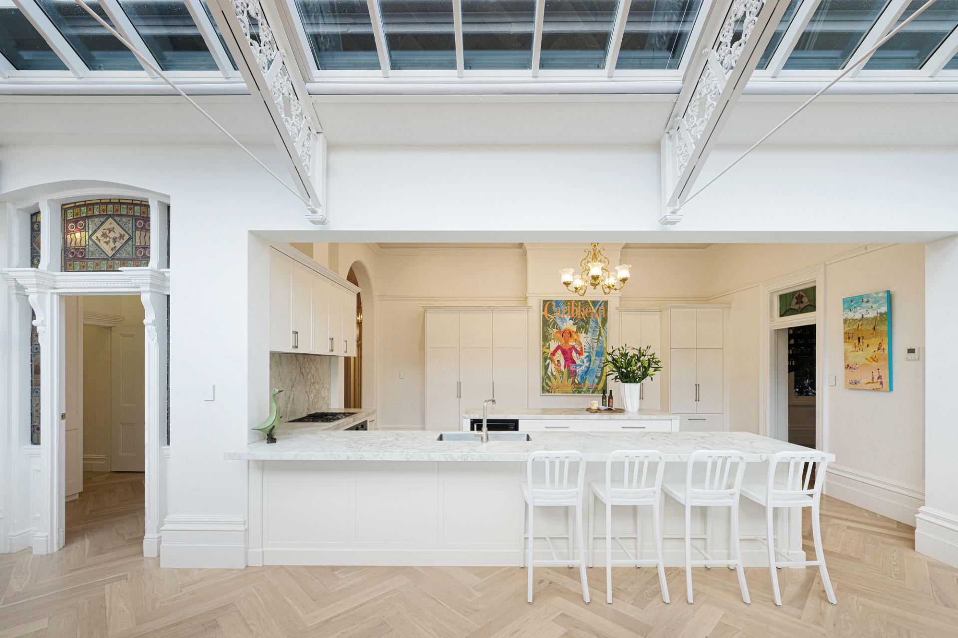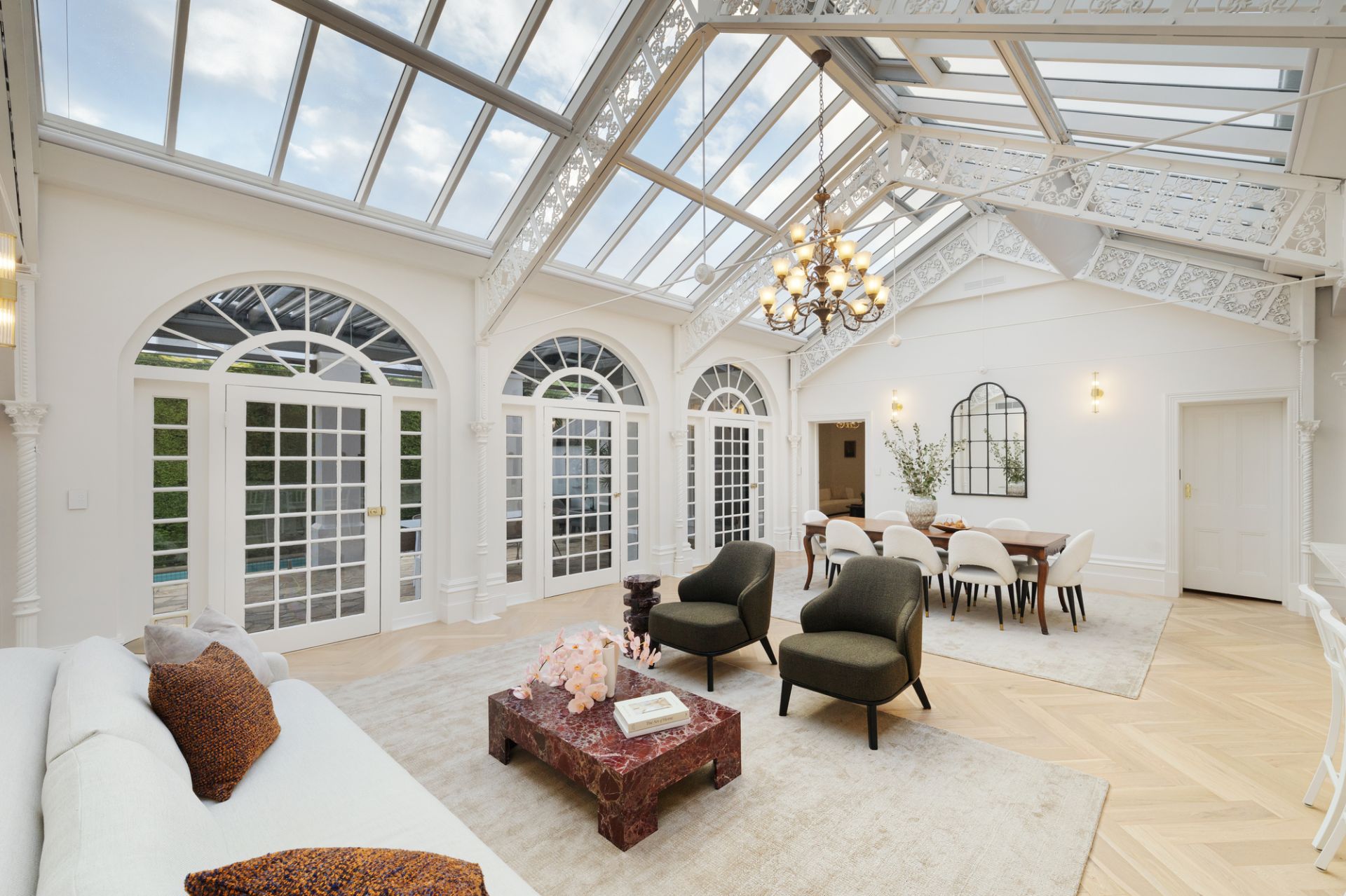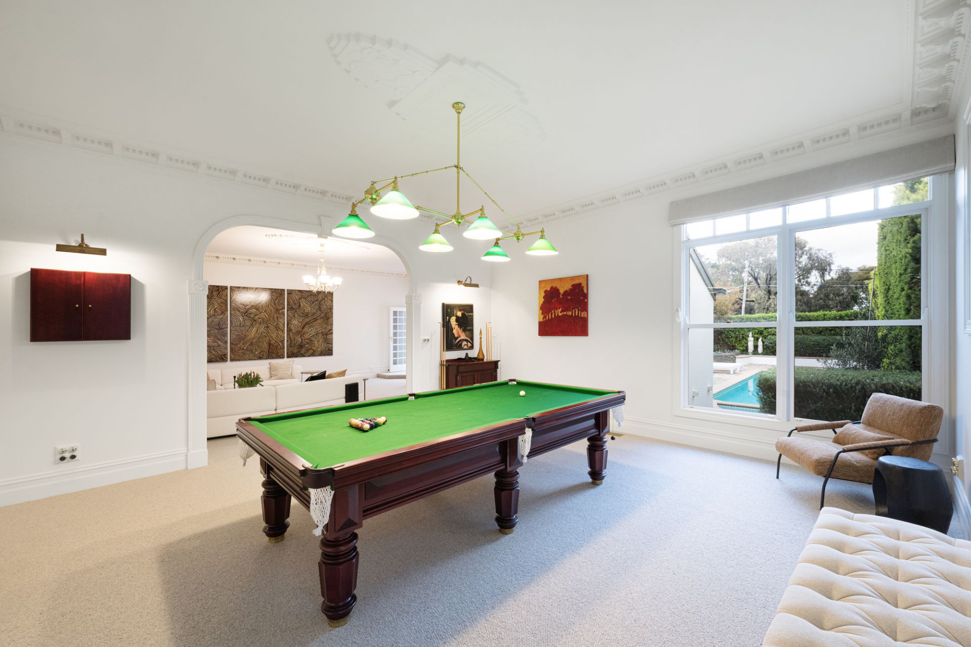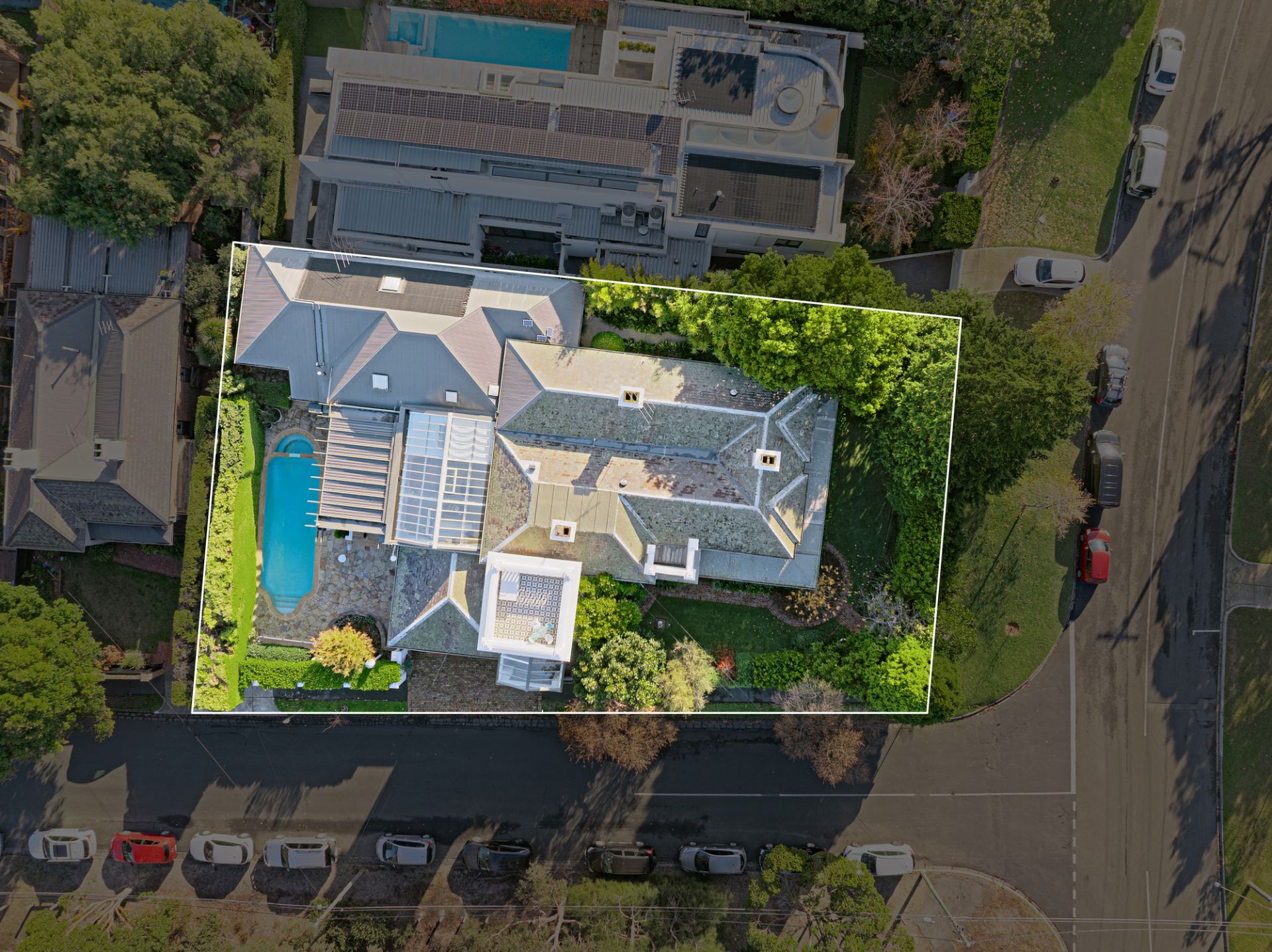 With uninterrupted frontage to Wilson Reserve, the home’s stance is made memorable by wrought-iron fences and lacework, canopies of verdure, a tessellated-tile veranda, and prominent corner position, while inside, period grace and modern luxe seamlessly entwine. Herringbone parquetry, a grand archway, and towering, ornate ceiling frame an inviting hallway, winding to introduce a spacious dining room en route to exceptional living/hospitality domain. Occupying their own distinct wing, expansive lounge and rumpus areas heighten hosting capabilities, while in a wonderfully open main section, a first-class kitchen and wine room flank a family/meals conservatory soaking in delightful, all-day sun. Usable across the year, a louvre-top alfresco steps into a sun-soaked yard kept private by sculpted hedges, brilliant for a dip in the pool and barbecue surrounded by friends and family.