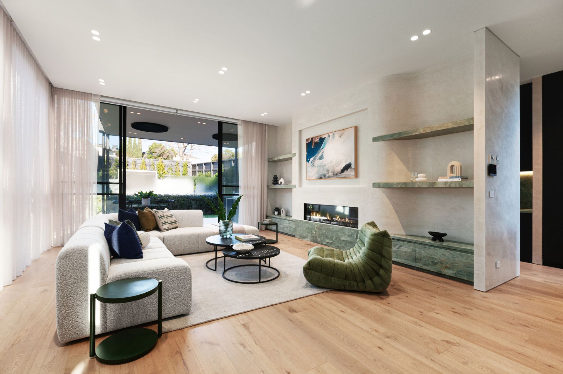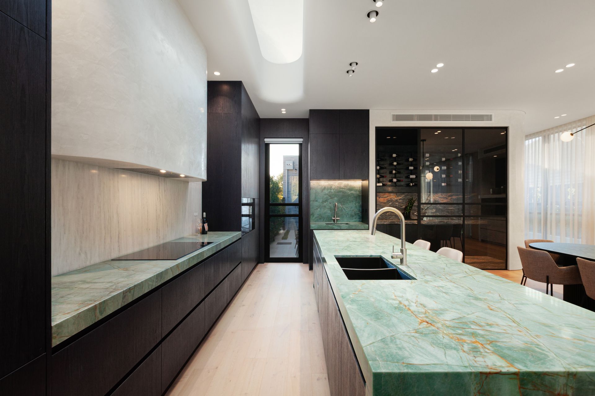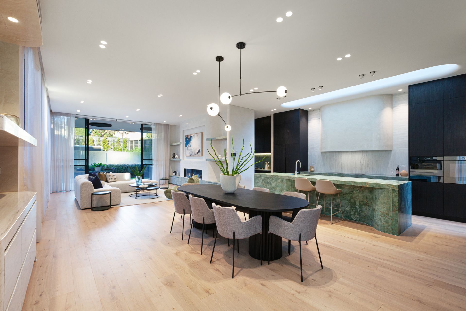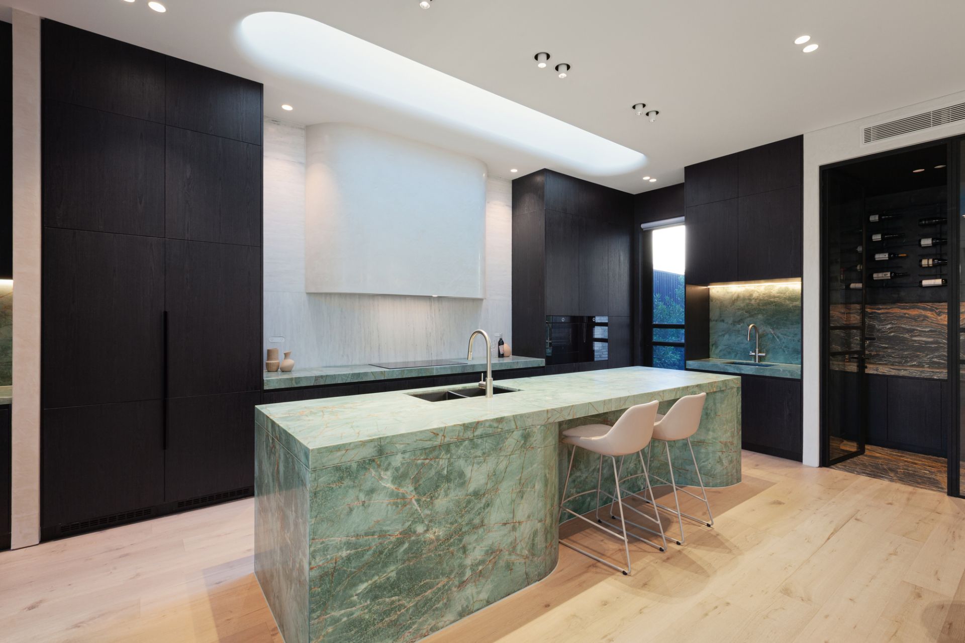 A floral backdrop and ribbons of all-day sun enrich vast living and dining zones, with a gas fire and wine display room letting the space reach a new level as a hospitality suite. With an Emerald Haze island, contrasting dark joinery, and pale oak floors illustrating the design acumen of GOLDEN, a skylit kitchen ensures the passionate cook has the finest tools at their disposal. A rounded island takes the fore, joined by an integrated Liebherr fridge/freezer, added fridge/freezer, butler’s kitchen, Zip Tap, and complete V-ZUG fit out with induction and gas cooktops, two ovens, and two dishwashers.
