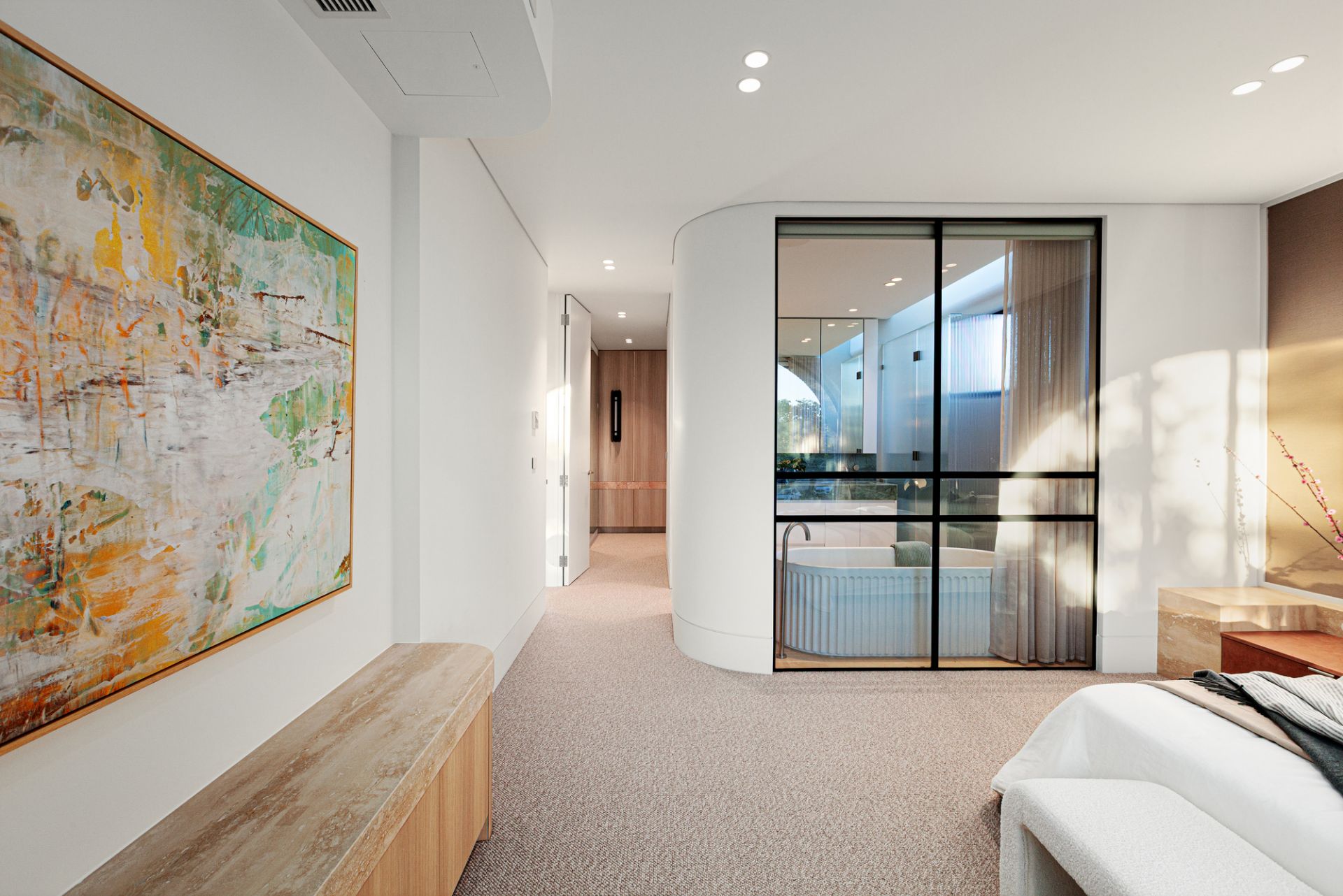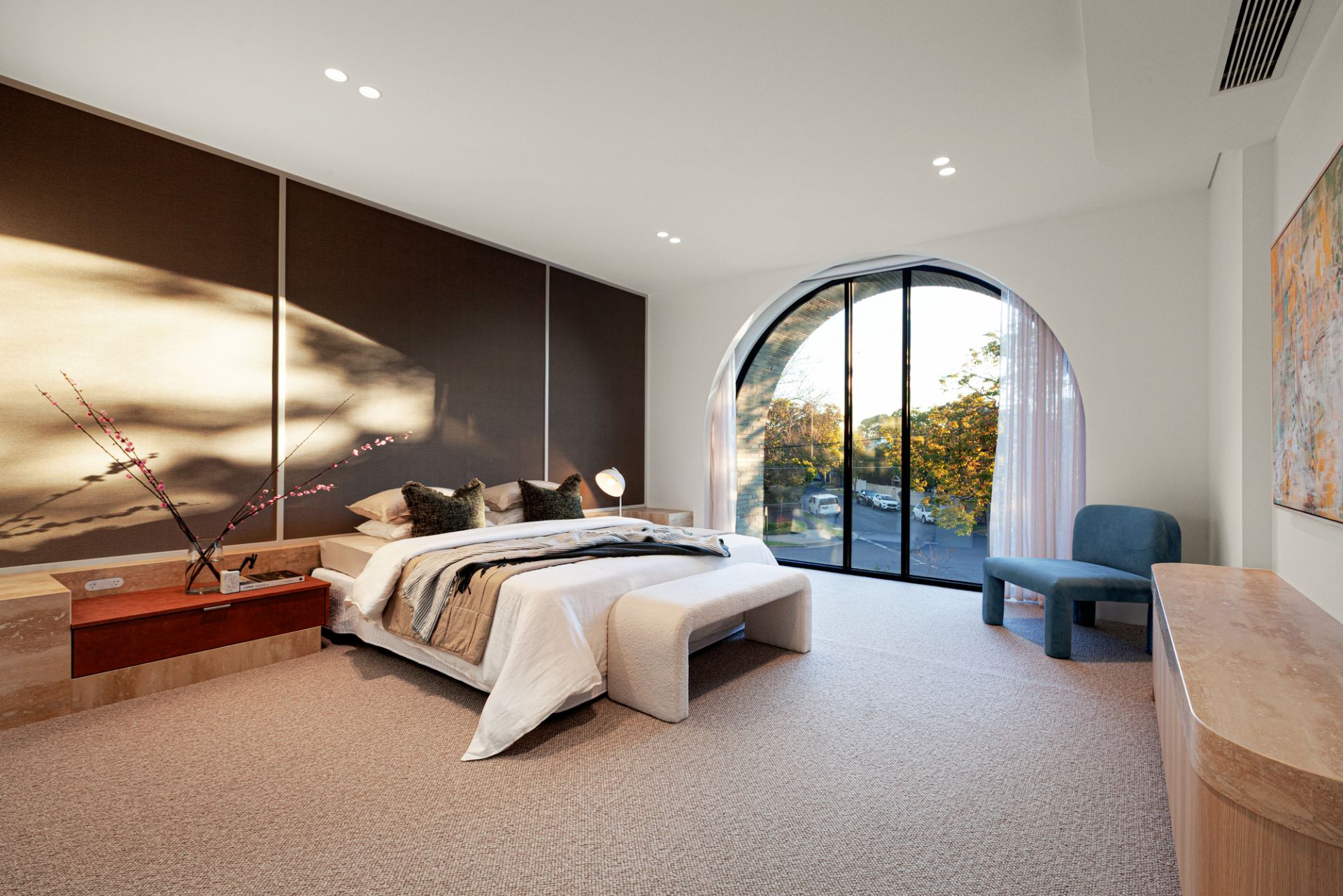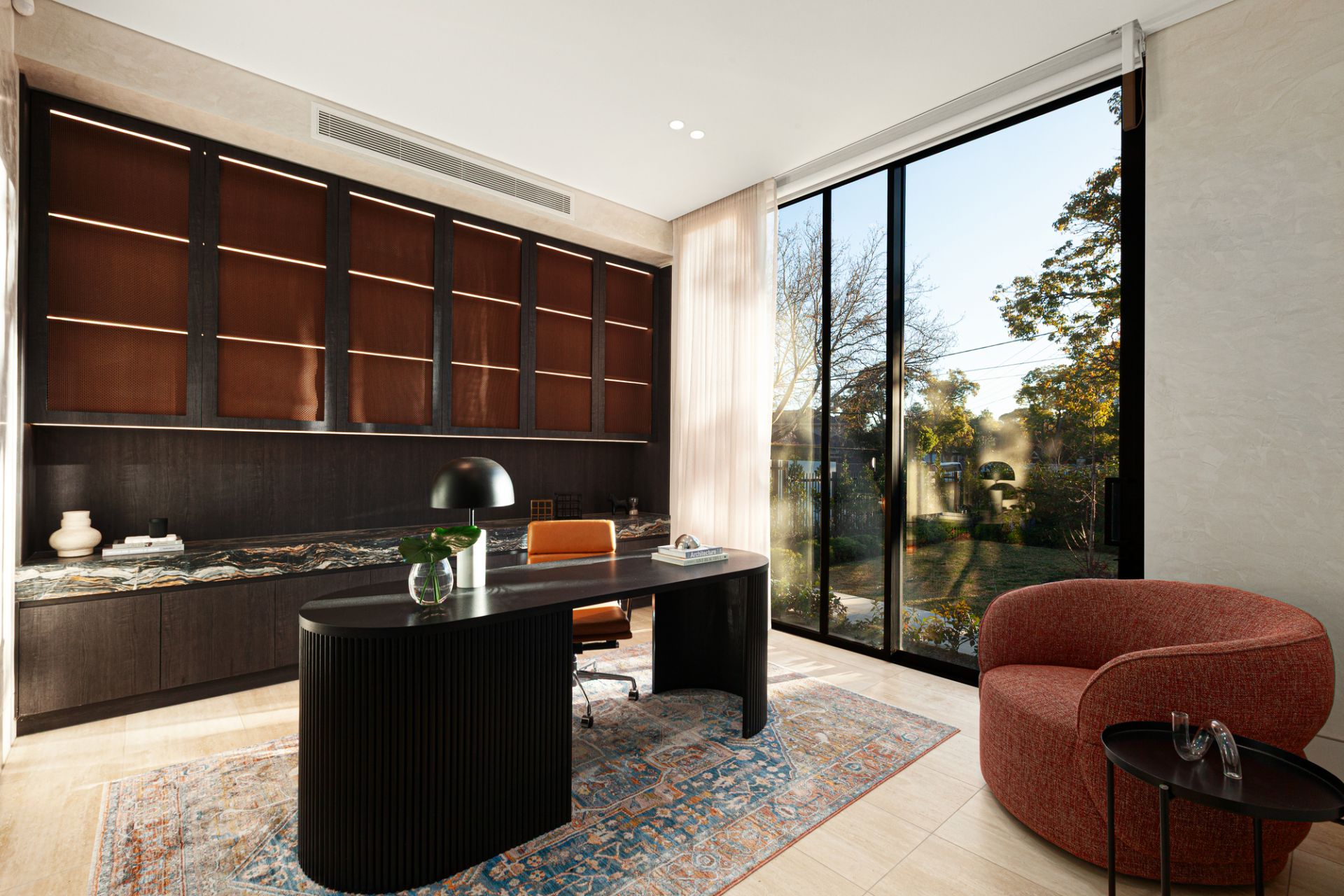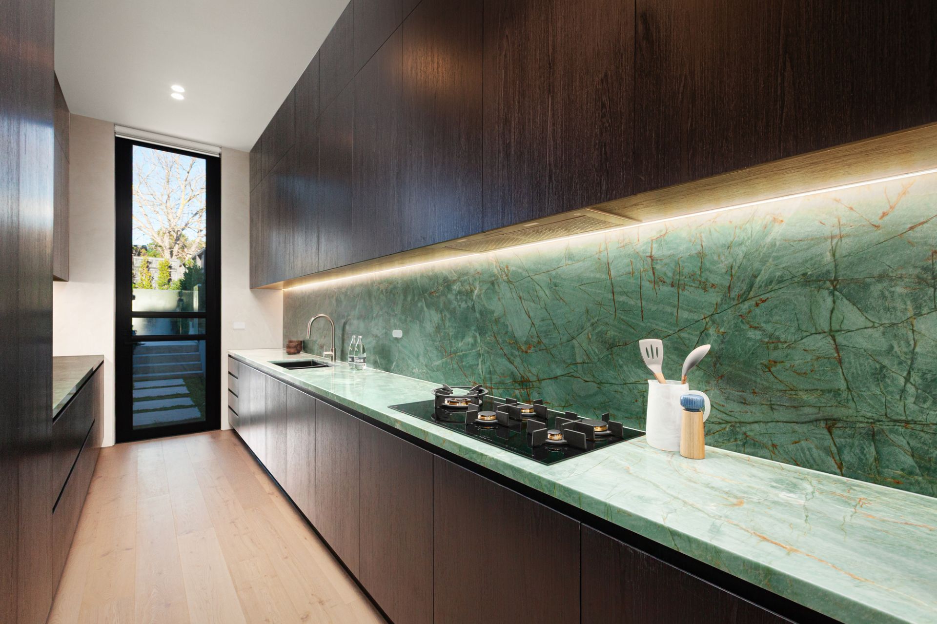 A floral backdrop and ribbons of all-day sun enrich vast living and dining zones, with a gas fire and wine display room letting the space reach a new level as a hospitality suite. With an Emerald Haze island, contrasting dark joinery, and pale oak floors illustrating the design acumen of GOLDEN, a skylit kitchen ensures the passionate cook has the finest tools at their disposal. A rounded island takes the fore, joined by an integrated Liebherr fridge/freezer, added fridge/freezer, butler’s kitchen, Zip Tap, and complete V-ZUG fit out with induction and gas cooktops, two ovens, and two dishwashers.