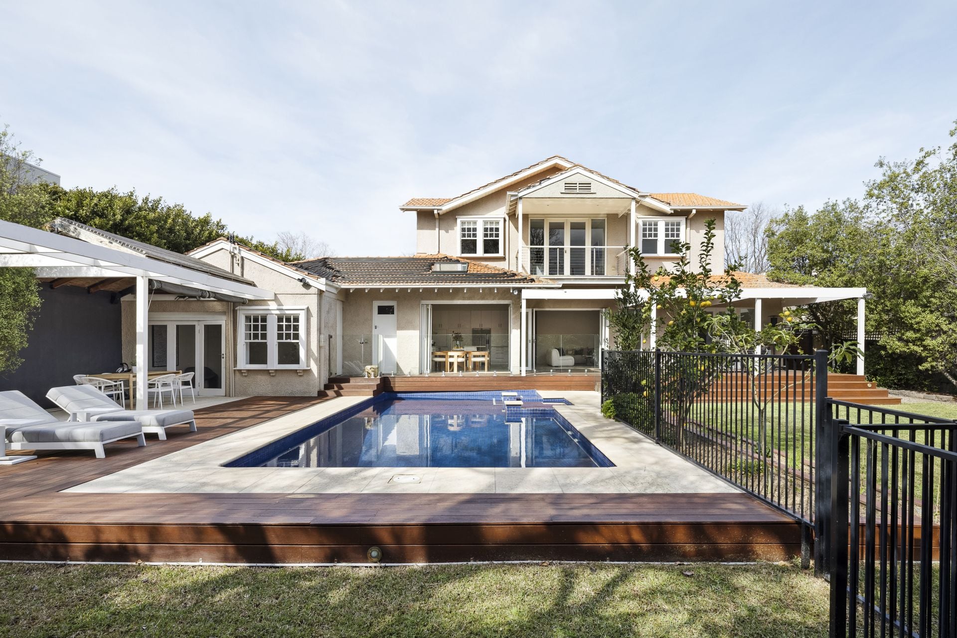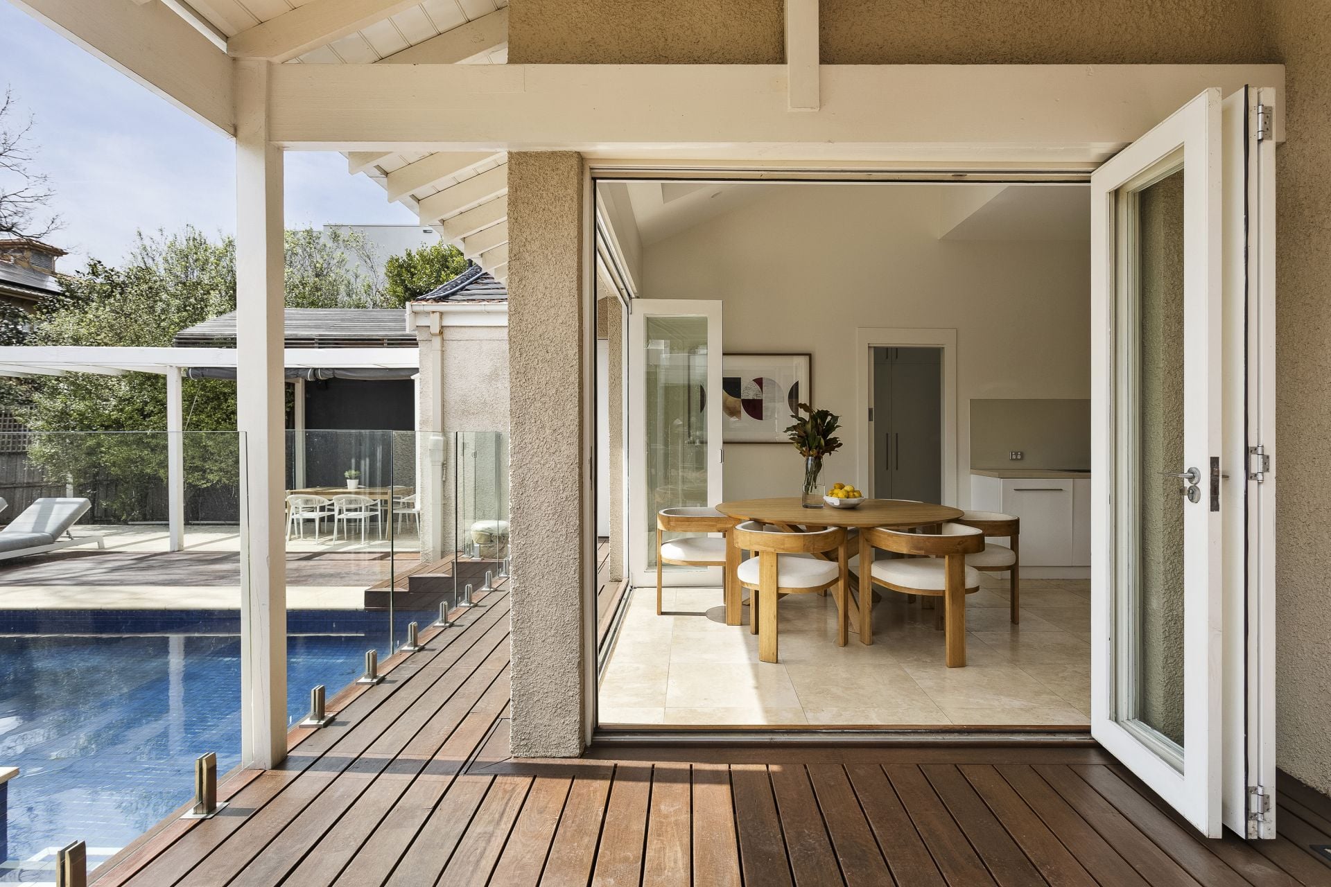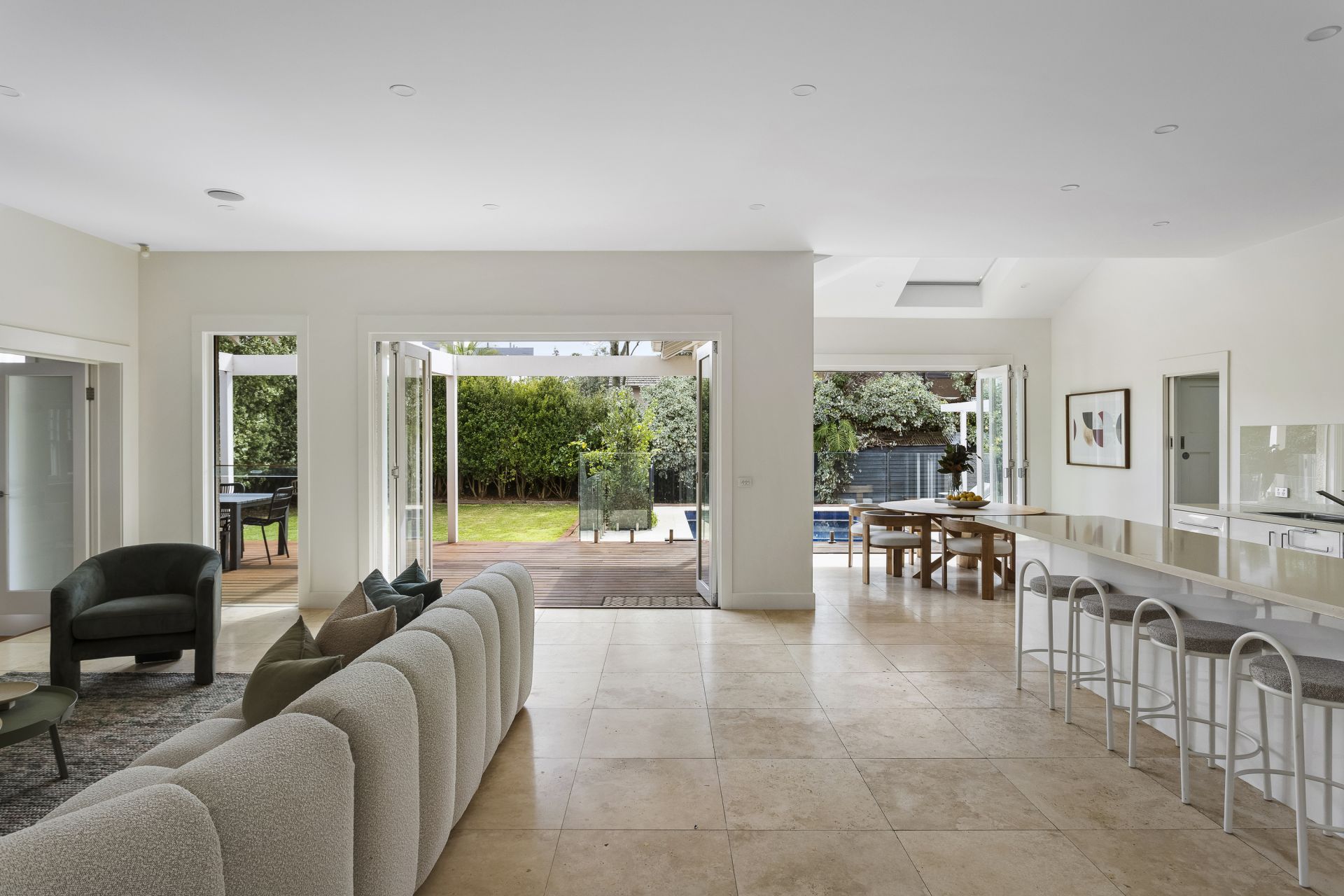 Behind its period frontage, light-filled spaces unfold with a rhythm designed for family living. Formal rooms exude warmth and intimacy, anchored by marble fireplaces and traditional detailing, while expansive contemporary living zones extend to the north, where glass, travertine and timber draw the garden and pool into the daily experience.