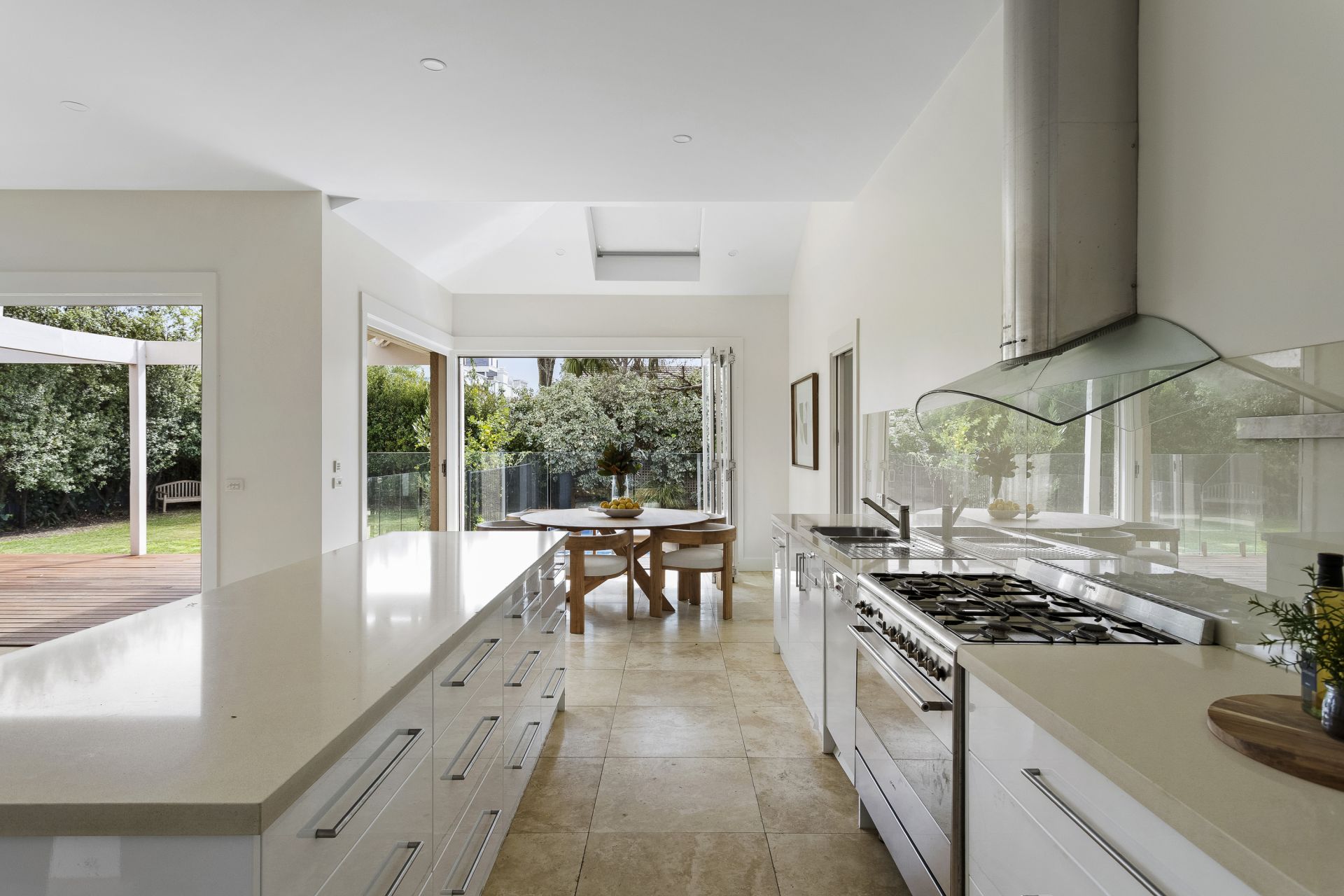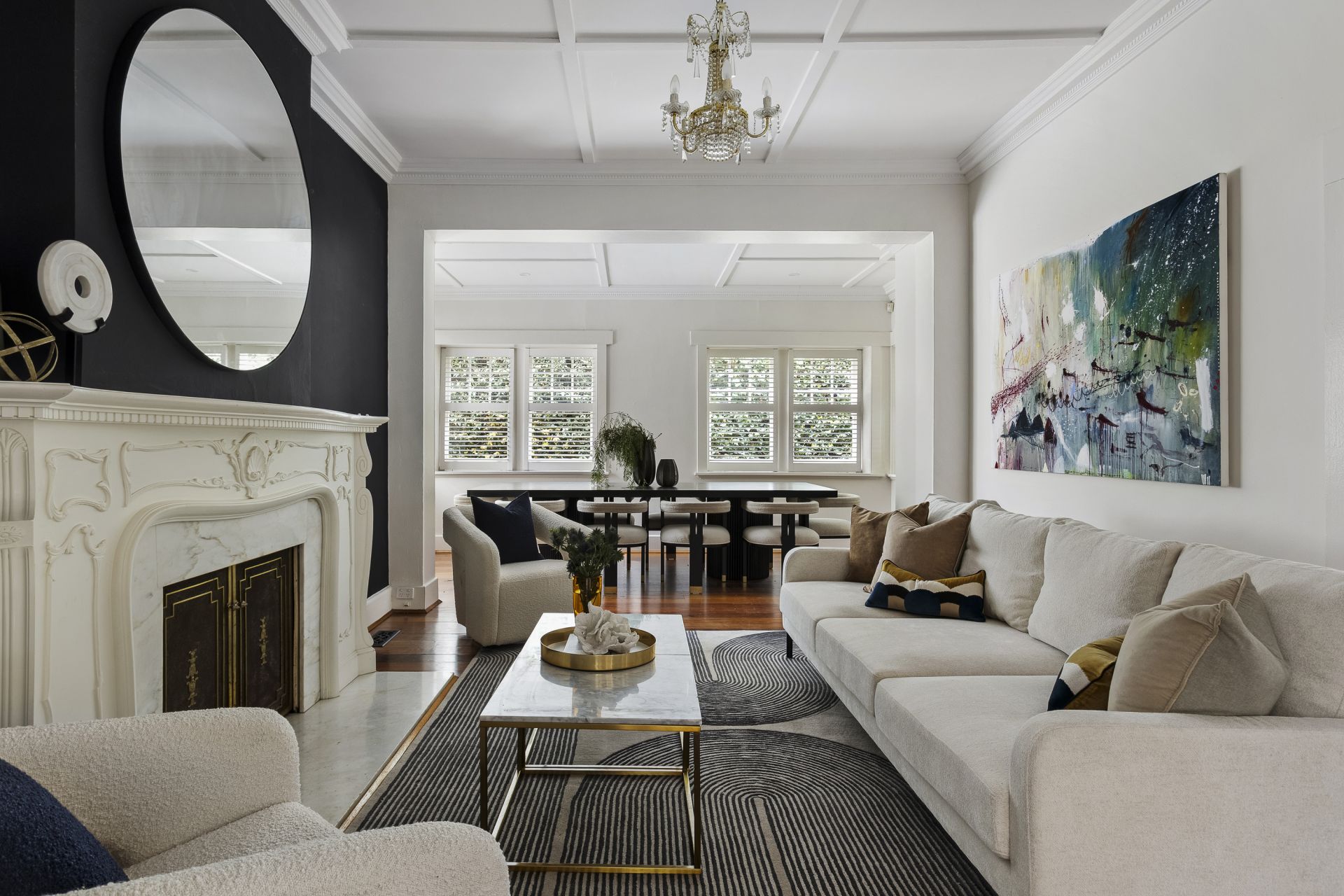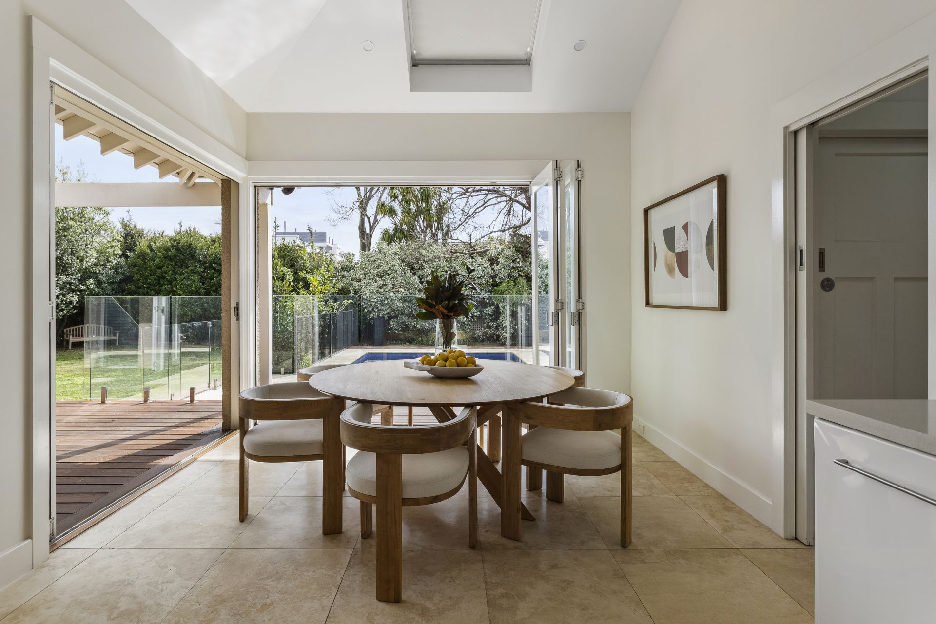Behind its period frontage, light-filled spaces unfold with a rhythm designed for family living. Formal rooms exude warmth and intimacy, anchored by marble fireplaces and traditional detailing, while expansive contemporary living zones extend to the north, where glass, travertine and timber draw the garden and pool into the daily experience.