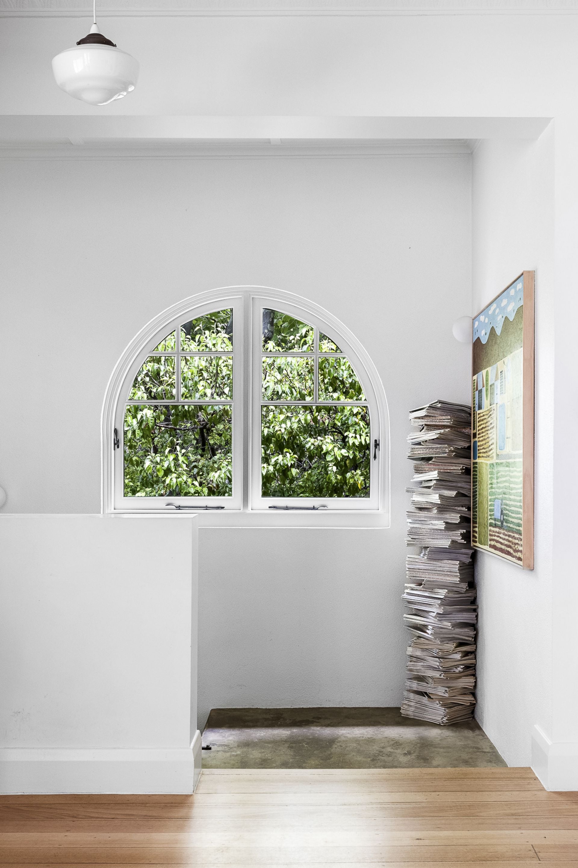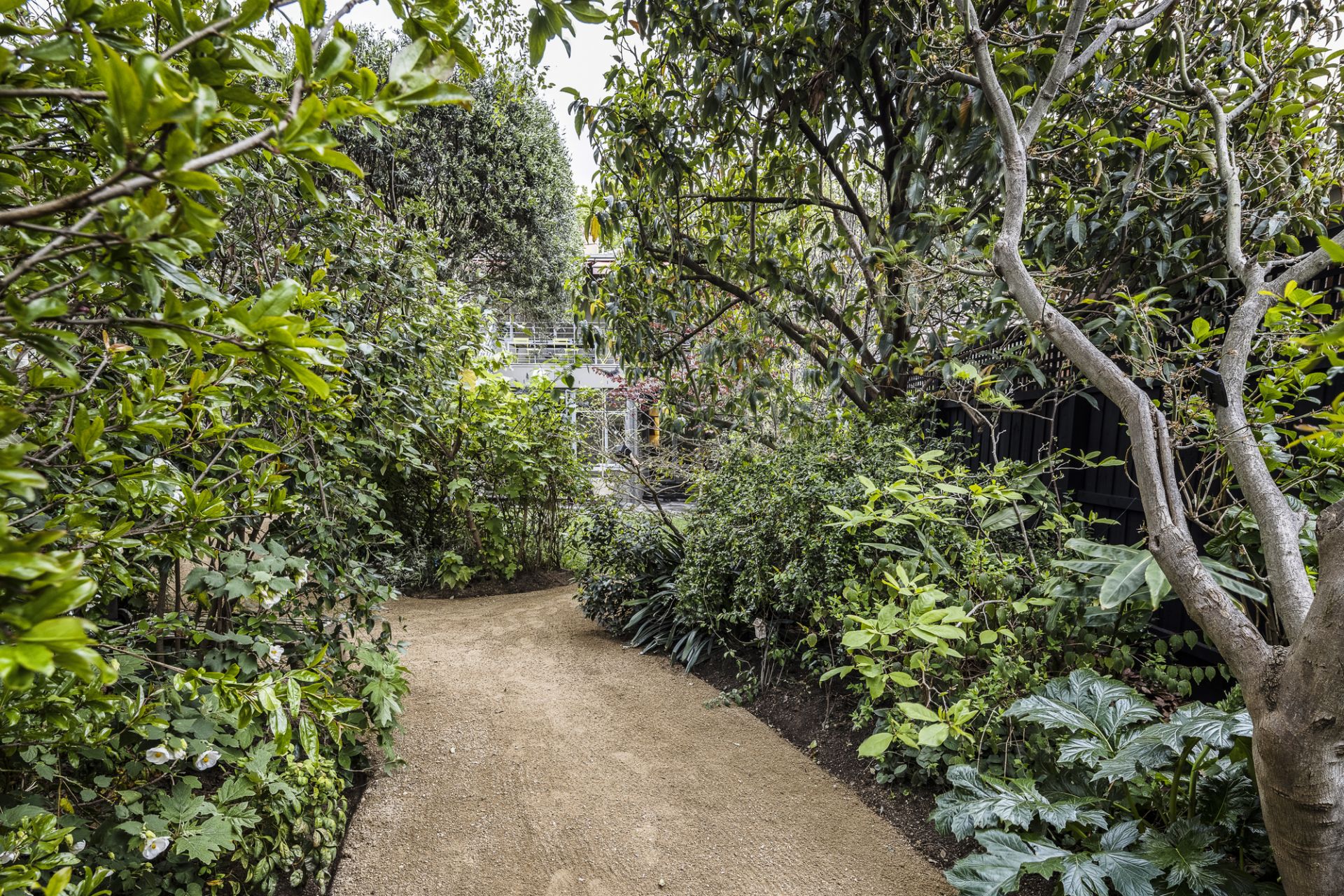 Upstairs an arched window with treetop views introduces the spacious living room that connects seamlessly to the open-plan marble/stainless steel kitchen and the expansive dining area. Perfect for entertaining on a large or intimate scale, this room ,with a wall of glazing opens through steel-framed doors to the north-facing deck to continue the living outdoors, while stairs lead down to the garden.
