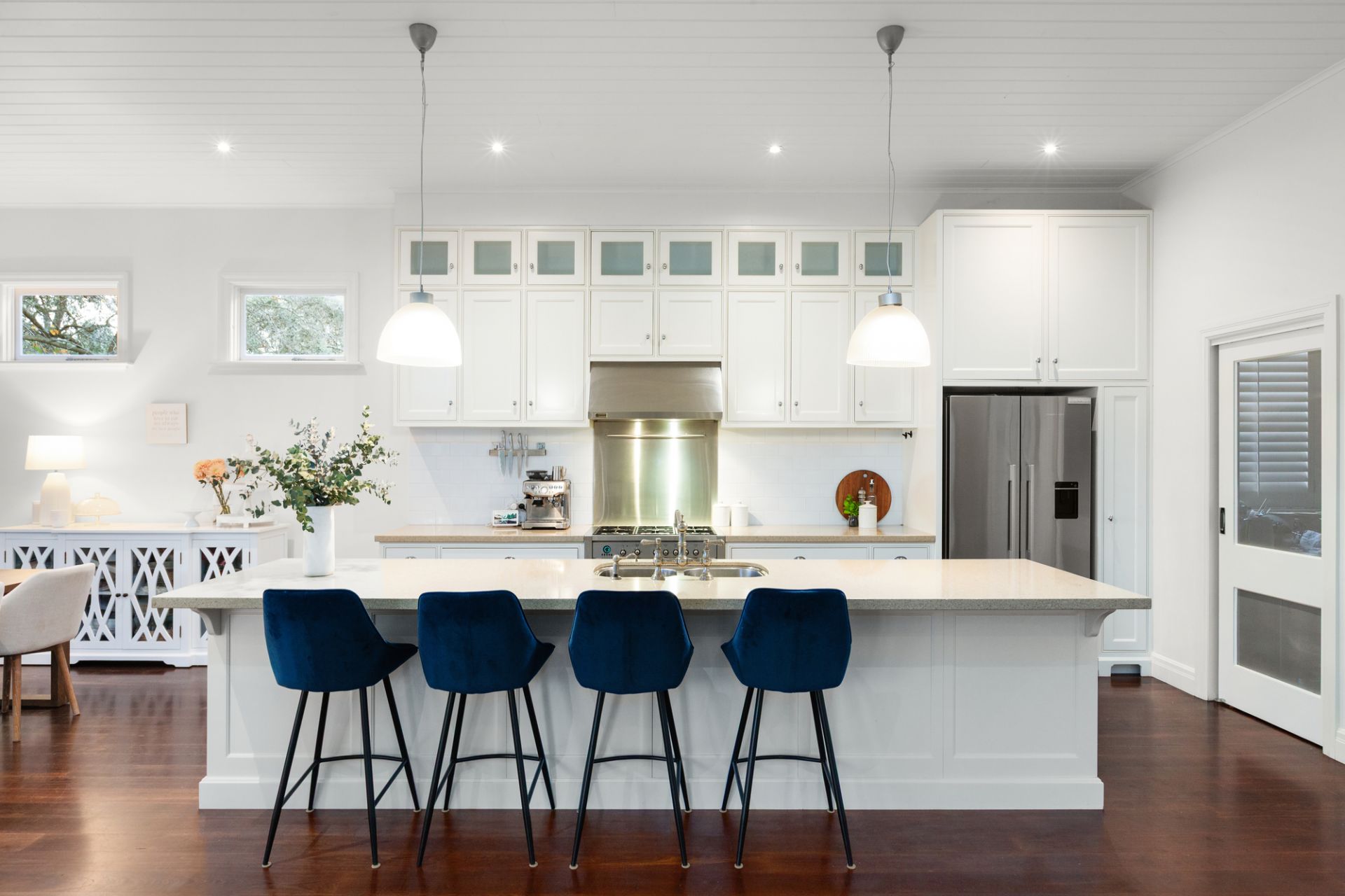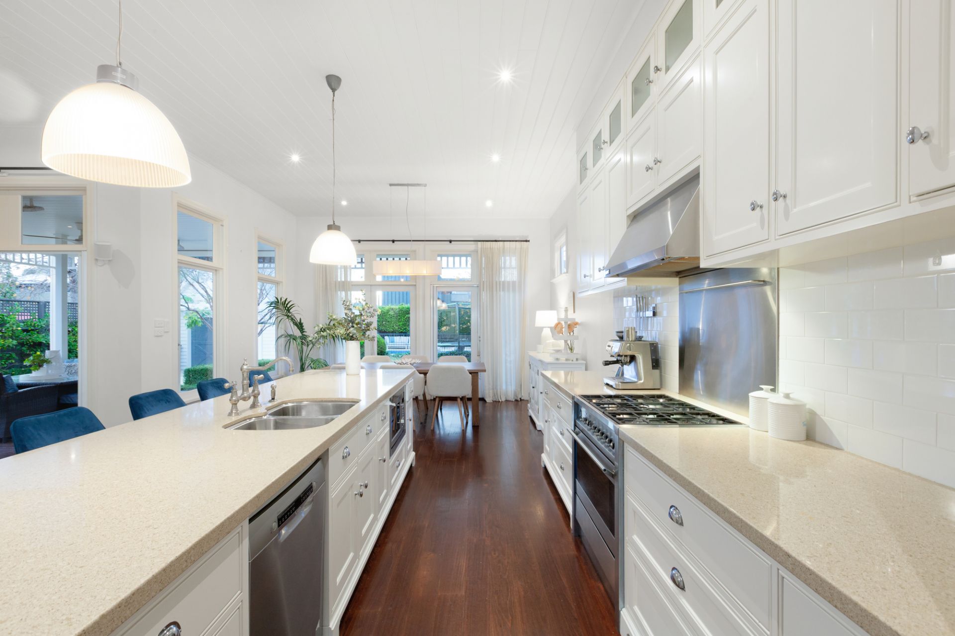 Set across two beautifully proportioned levels, the home is bathed in natural light and defined by generous spaces, refined finishes, and a seamless connection between indoor and outdoor living. At its heart lies a superbly appointed kitchen, perfectly positioned to overlook the lush gardens and expansive entertaining domain.