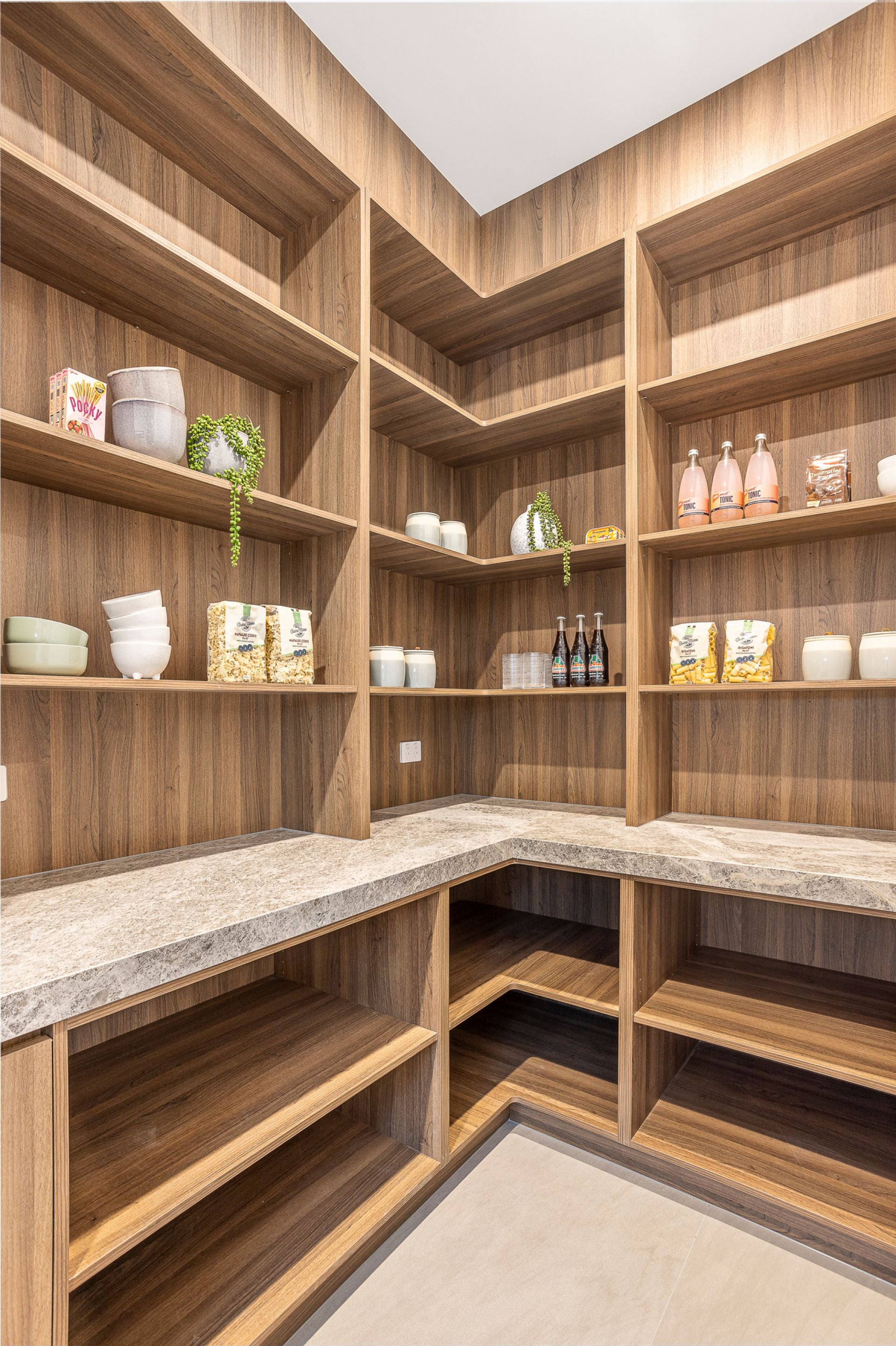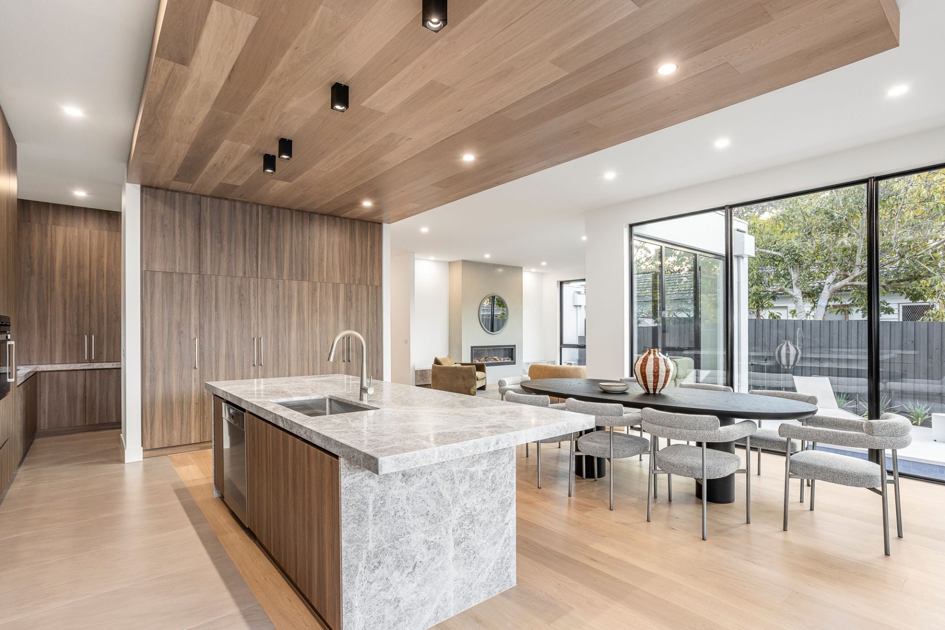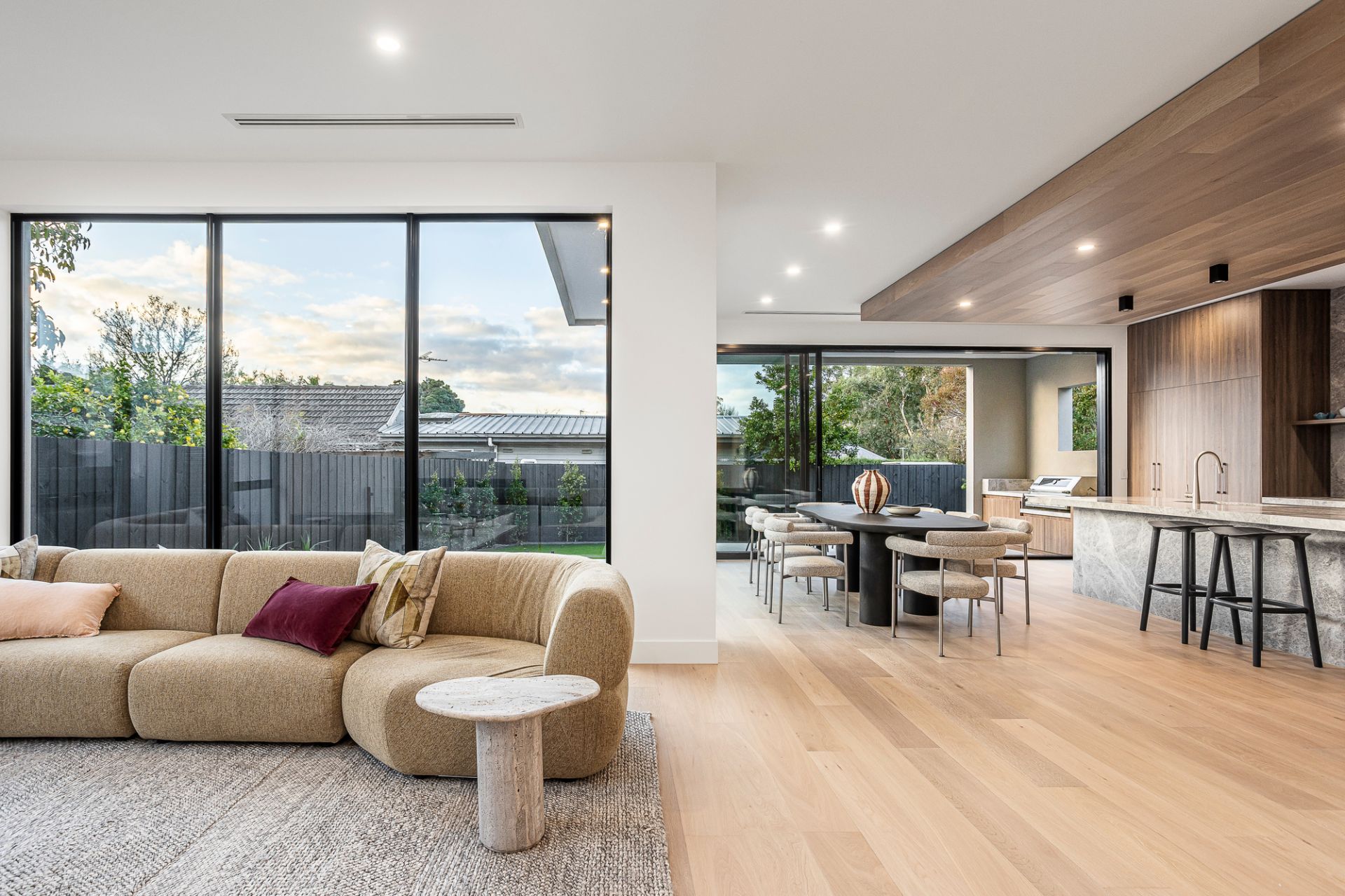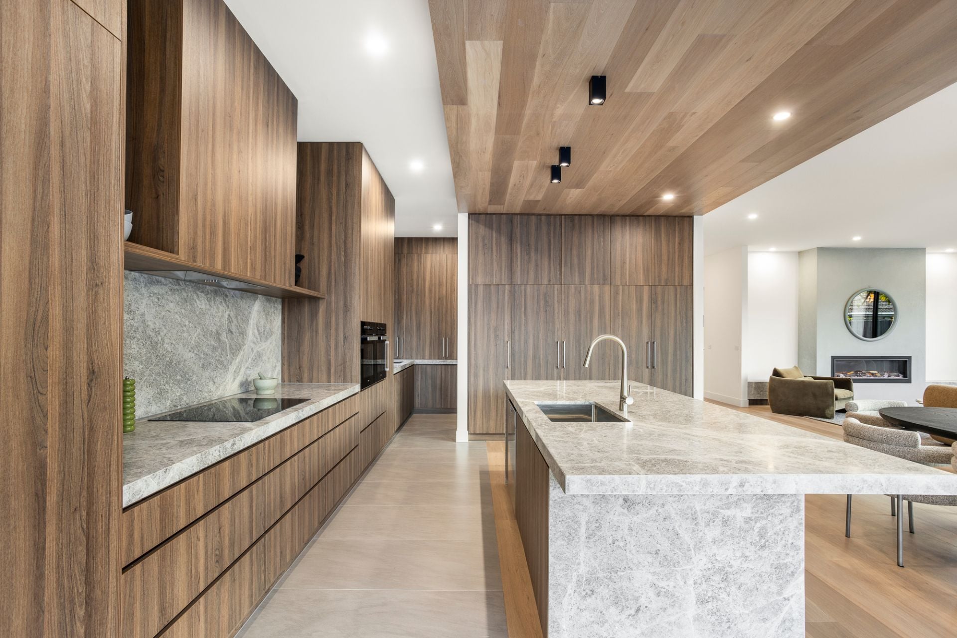 Taking in all-day sun, a spectacular hospitality suite sees living and dining areas, a barbecue alfresco, and sun-soaked pool retreat effortlessly entwine, simply brilliant for blue-sky Sundays and large-scale gatherings with friends and family. Gifted depth and dimension by a timber clad ceiling, a gourmet kitchen is certain to excite the passionate cook, with ribbons of marble and profuse storage joined by a butler’s pantry, wide island, and Miele appliance suite comprising a integrated fridge/freezer, double oven, induction cooktop, and dishwasher.