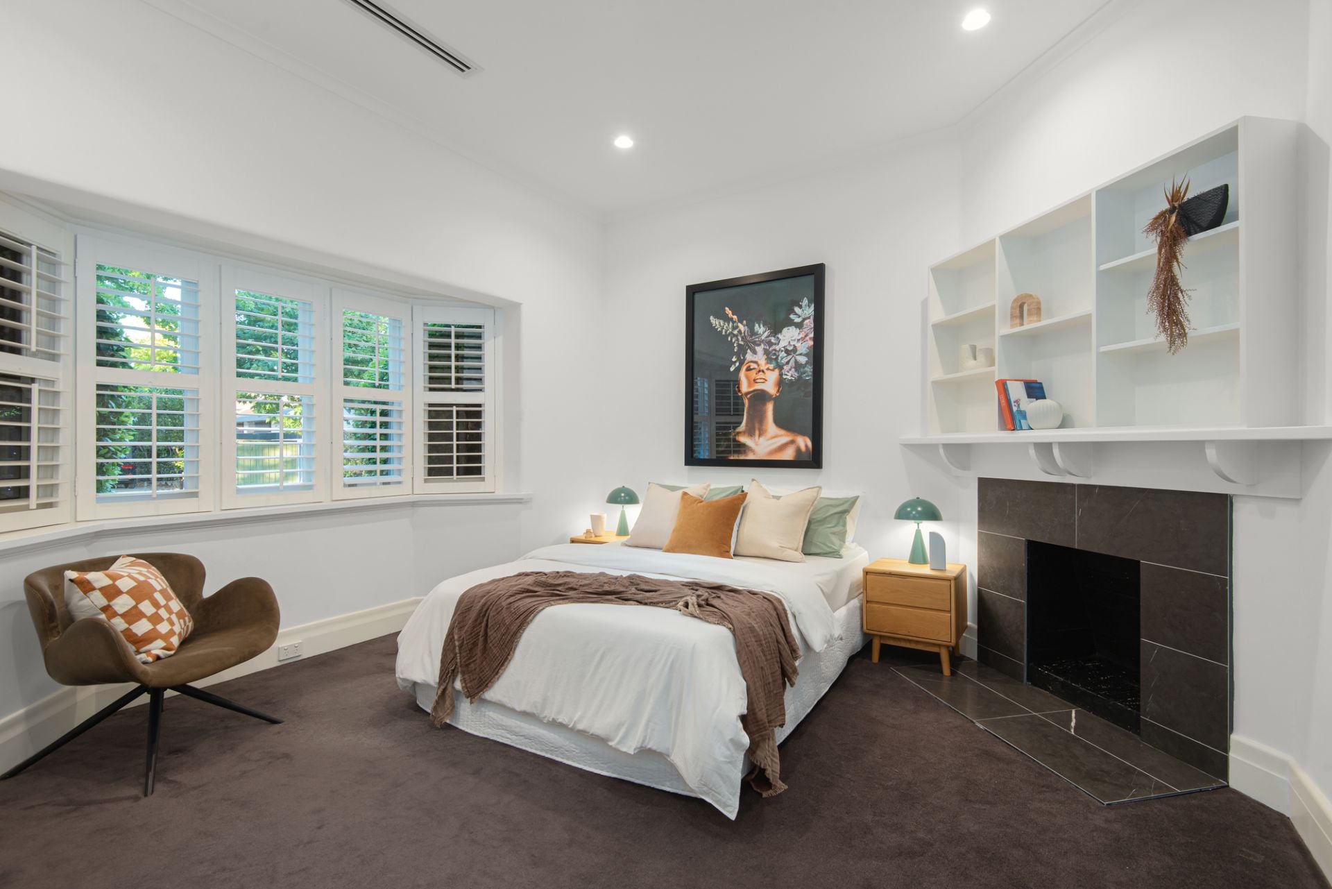 The house benefits from four spacious bedrooms including a captivating front master with original sash windows, walk-in robe and crisp ensuite. Another bedroom with built-in robes and an original fireplace is positioned at the front of the house while two further bedrooms are joined by a fully-tiled family bathroom with bath and double stone vanity at the rear.