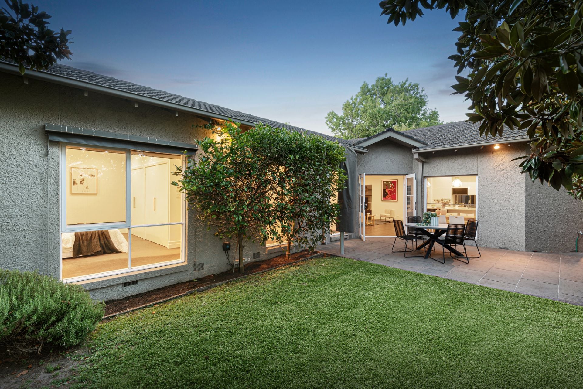 French doors open to a bluestone courtyard which is perfect for alfresco dining or entertaining, a lush lawn and a beautiful established garden with fruit trees.