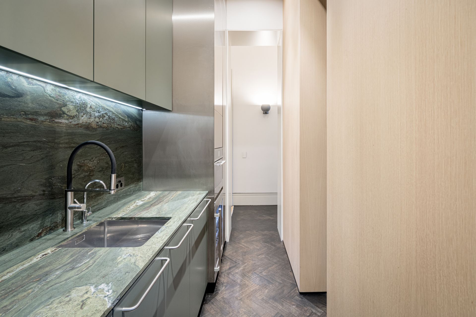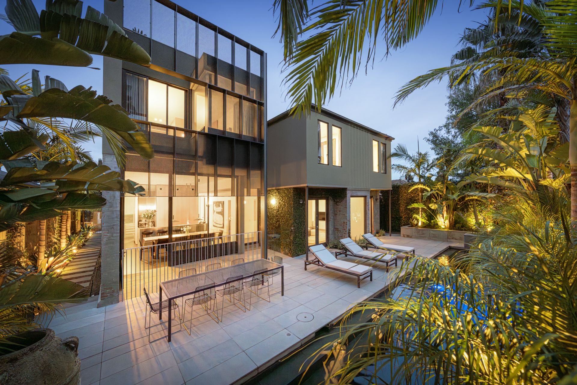 Ground-floor office, sitting room, and back living areas are all wonderful for cosy nights by the fire, while first-class ILVE, Miele, and Liebherr appliances, a butler’s pantry, and ribbon of textured marble all enhance a gourmet kitchen. Reaching from parquet floor to soaring ceiling, metal-frame glass doors streamline flow into a north-facing rear terrace with a pool and total privacy for separation from the world outside.