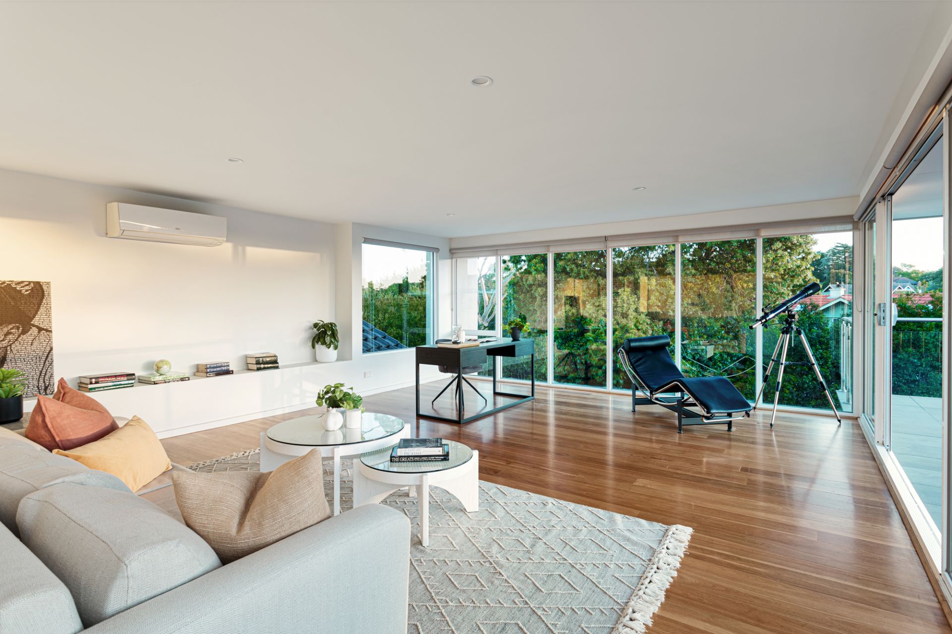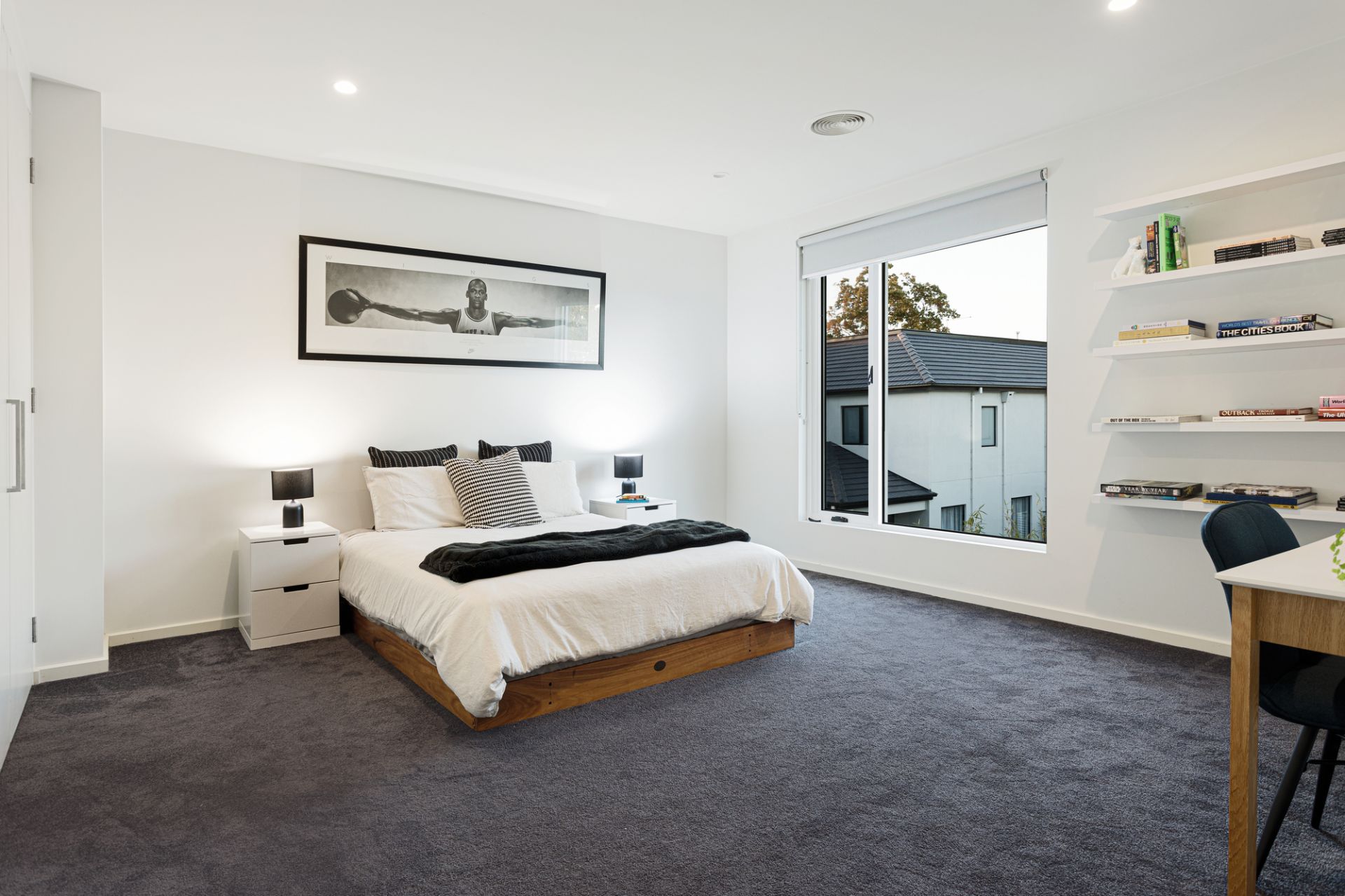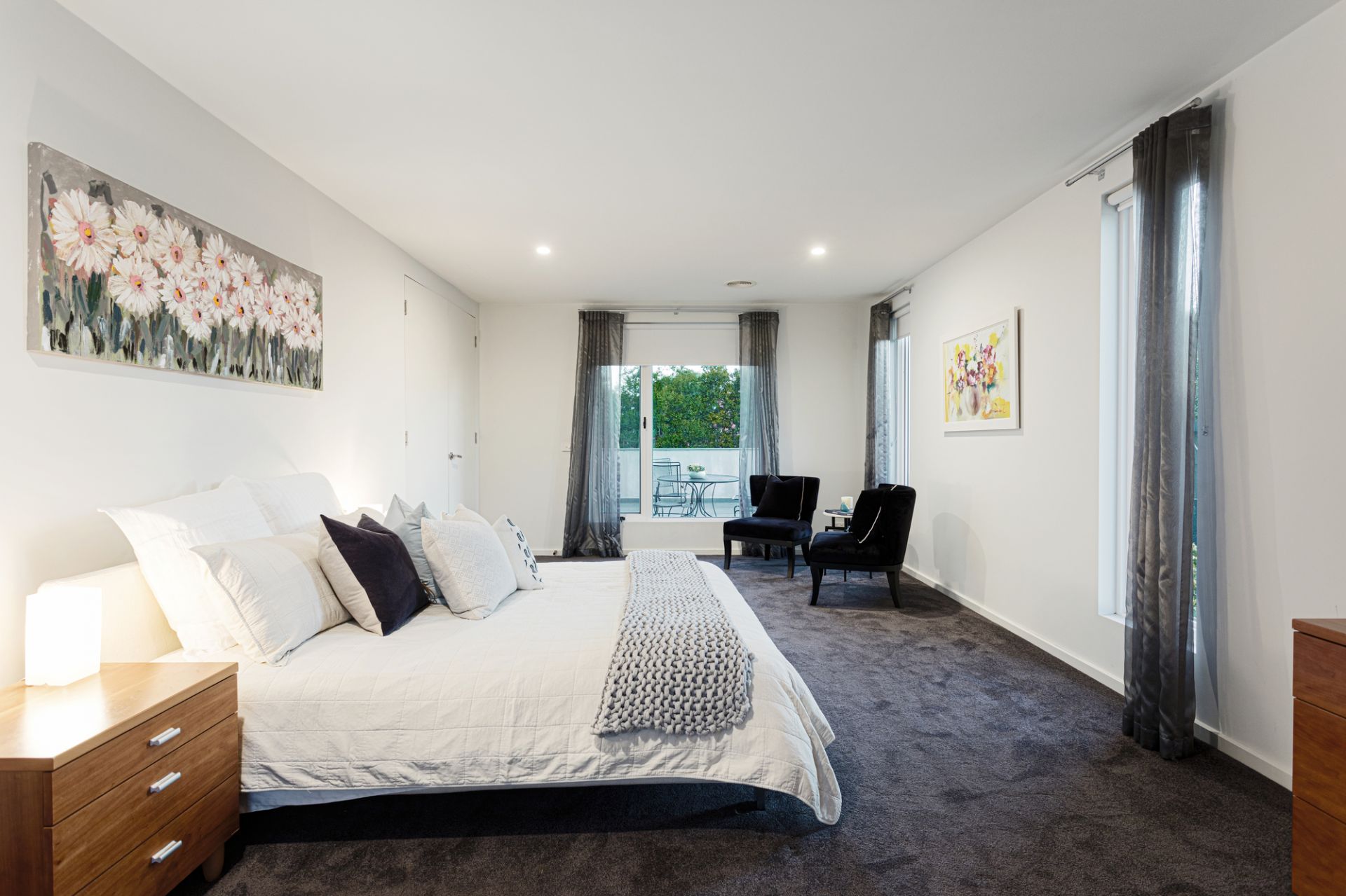 Contemporary refinement unfolds through an extensive open-plan design that fuses striking architectural elements with flexible, state-of-the-art spaces. A stunning multipurpose lounge or study with a kitchenette, bathroom and balcony on the top-floor highlights floor-to-ceiling windows and sliding doors framing breathtaking, never-to-be-built-out views, while just below is an opulent main bedroom suite with a city-view terrace, walk-in robe and a Carrara marble ensuite with a freestanding bath.