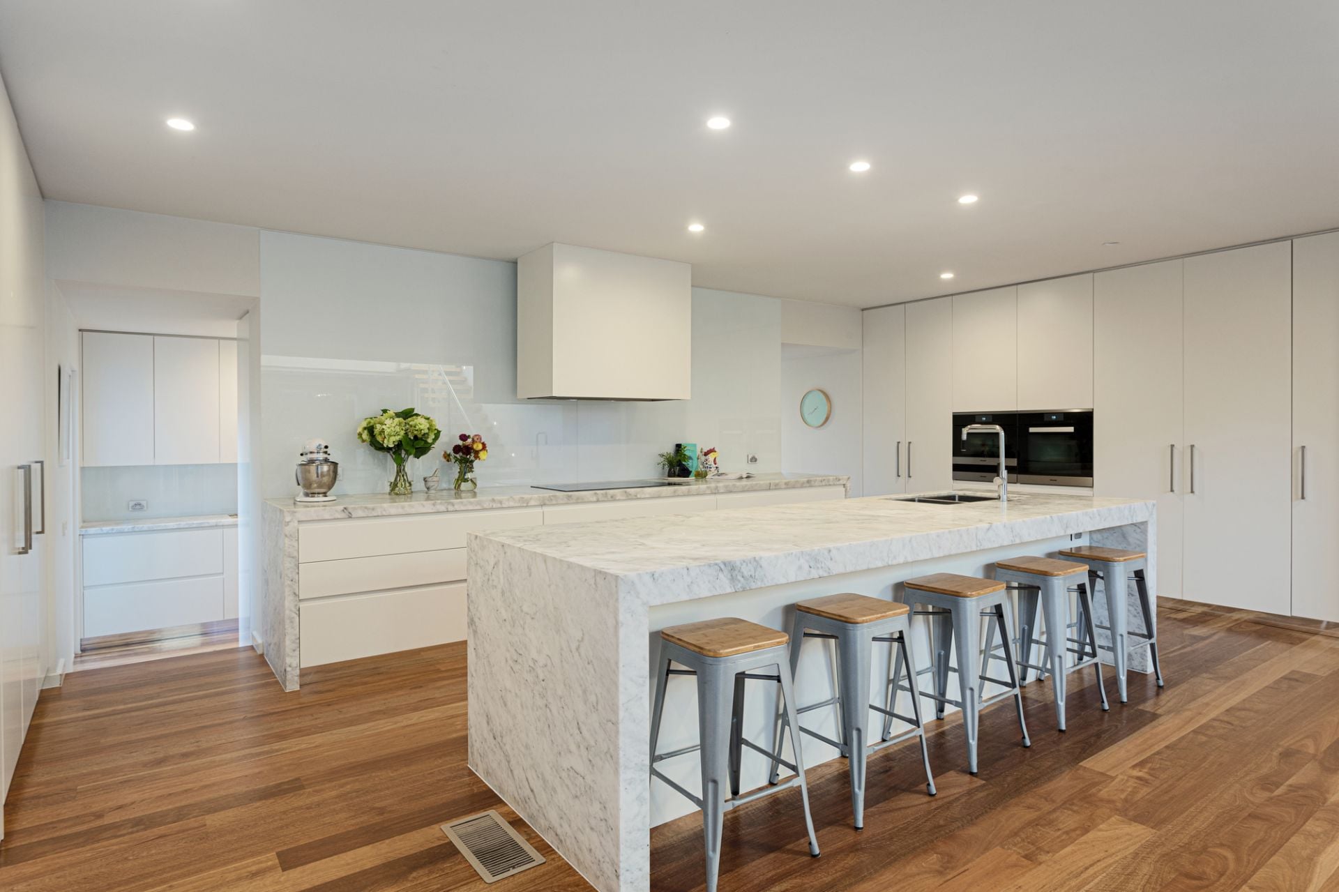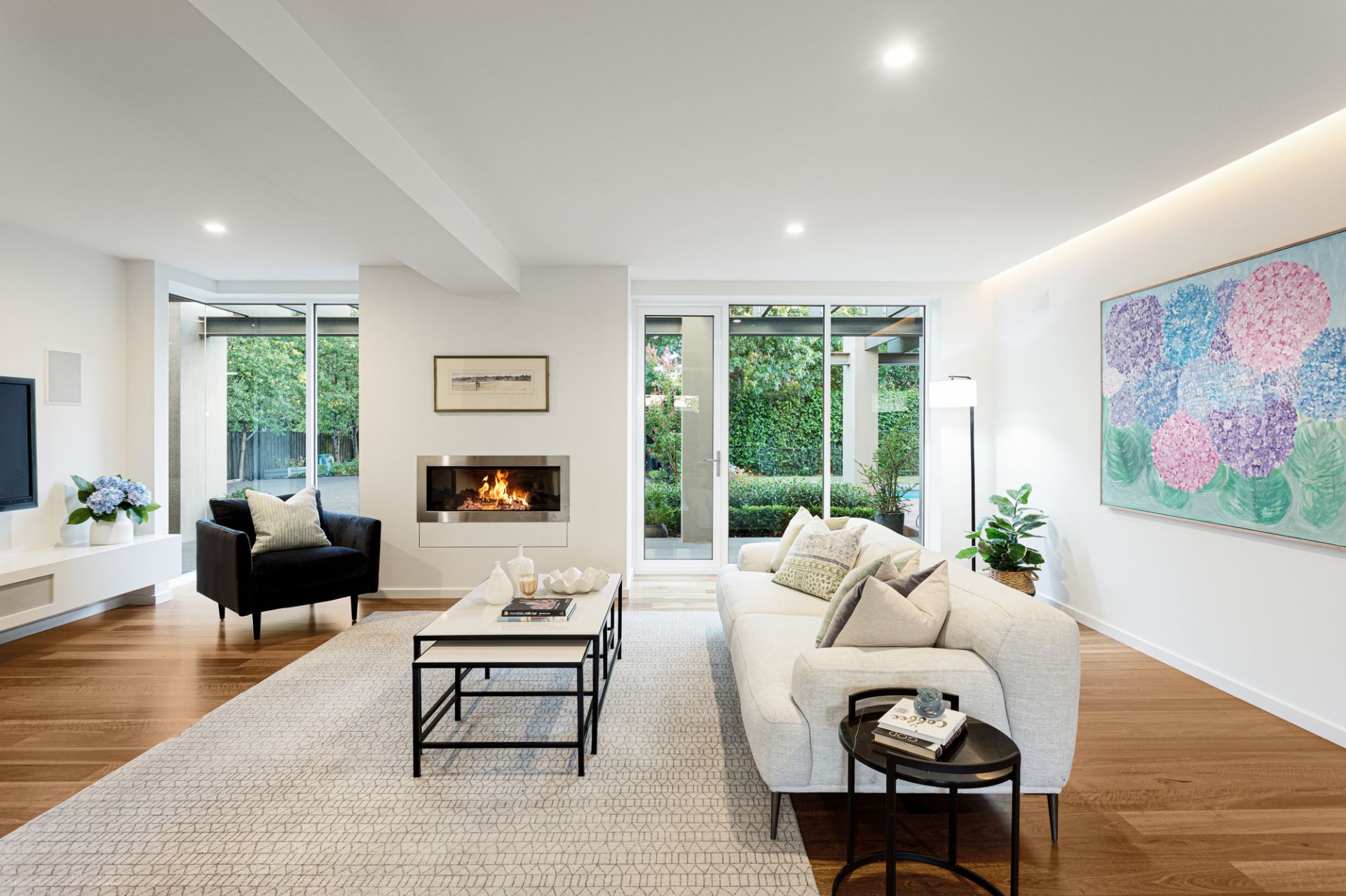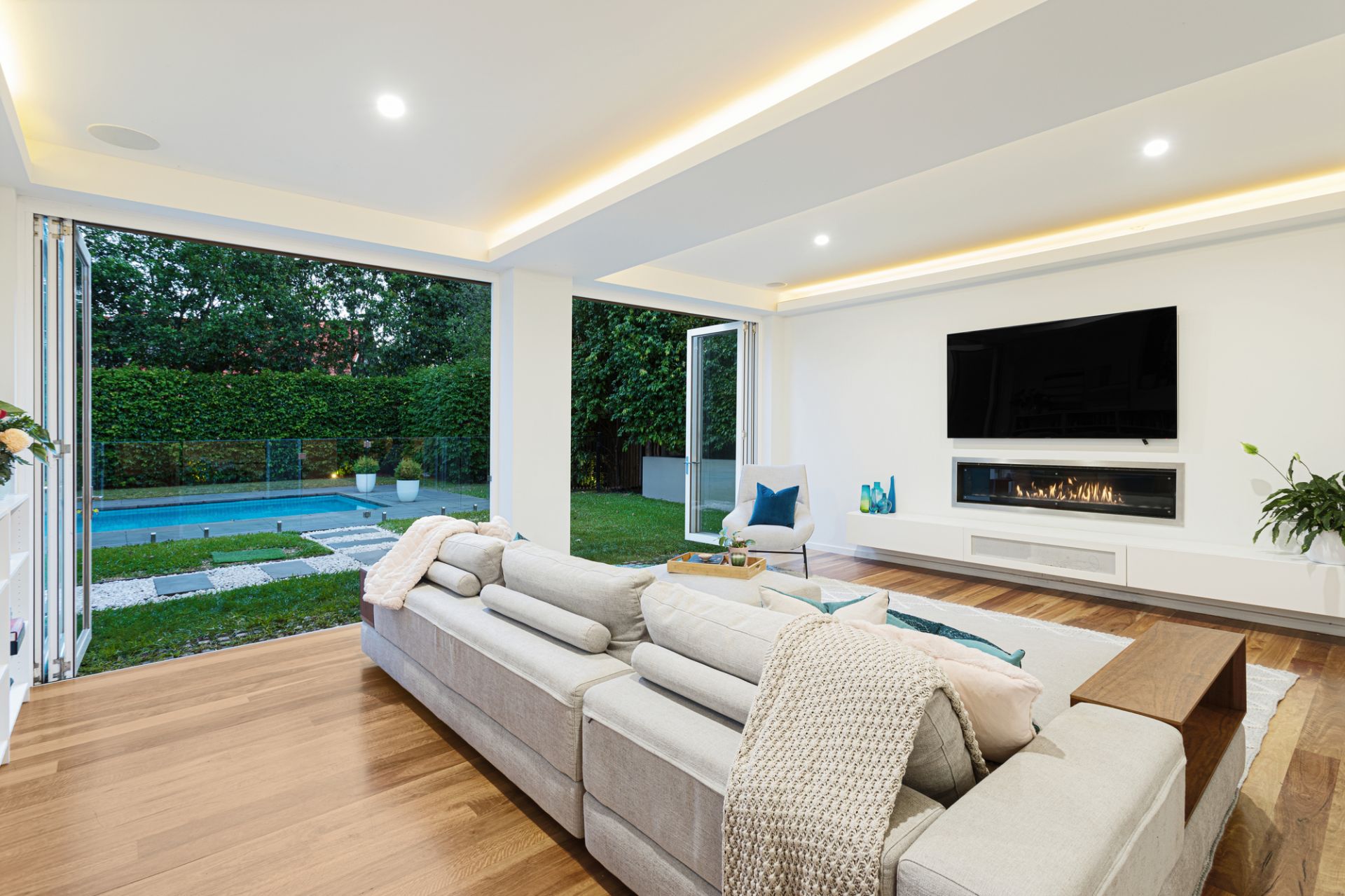 An entertainment oasis through bifold doors extends from an undercover deck (gas/water plumbing) to a glistening swimming pool and spa that’s self-cleaning and solar/gas-heated for endless outdoor enjoyment. Also offers an additional ground-floor bedroom, bathroom, powder room and laundry, ducted heating and cooling, hydronic floor heating, gas fireplaces, heated towel rails, speaker system, automatic driveway gates, video intercom and massive remote-control garage with fitted storage.