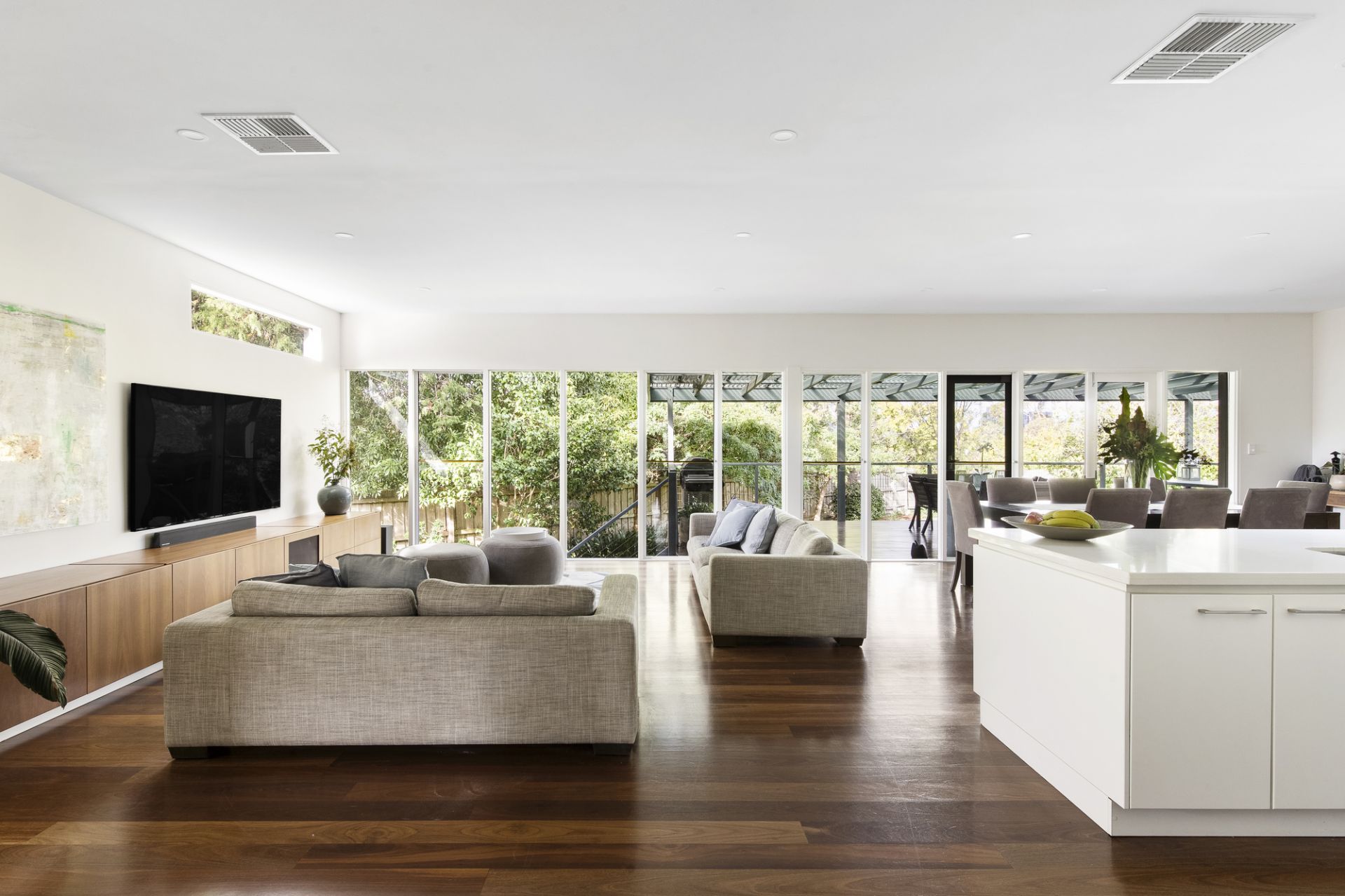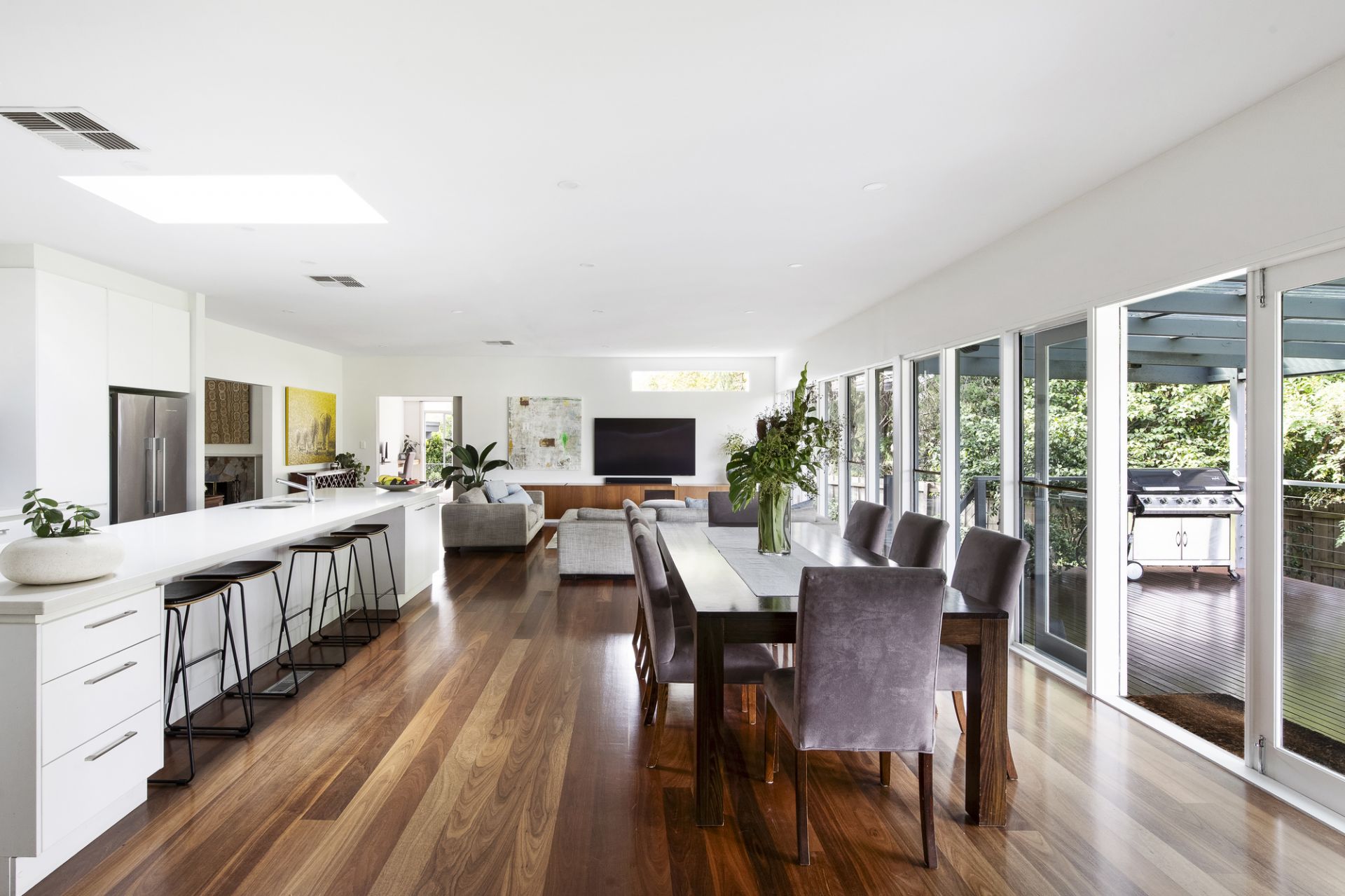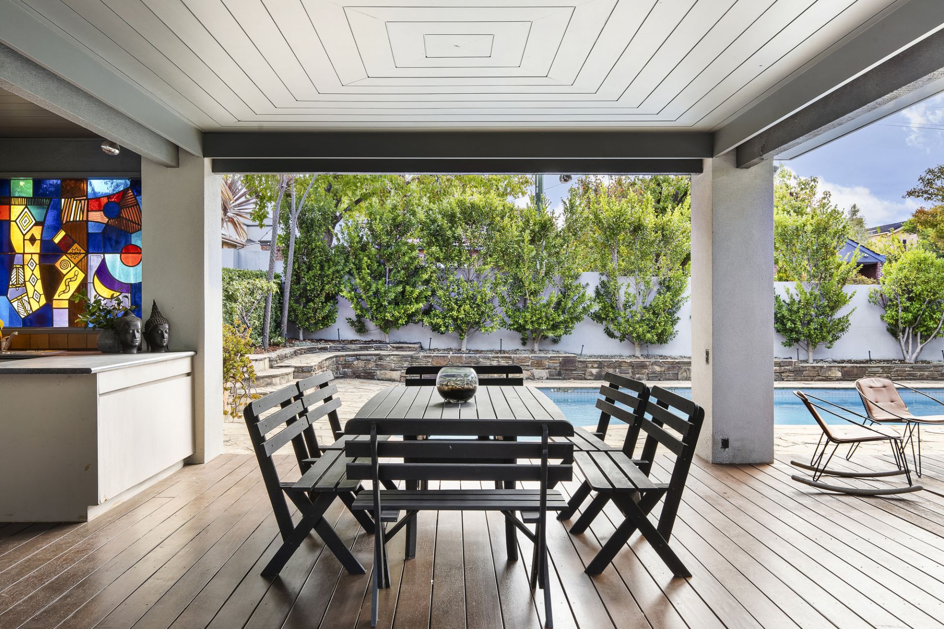 A stylish lounge room warmed by a wide stone-backed fireplace, a large multipurpose rumpus or home office (built-in desk and cabinetry), and a superb living and dining room complemented by a Miele-appointed gourmet kitchen with a stone-topped island bench all overlook secure, leafy garden that’s children-friendly and ideal for entertaining with dual front and rear undercover decks and a huge 14-metre swimming pool all fringed for sun-drenched privacy in nature reserve greenery.