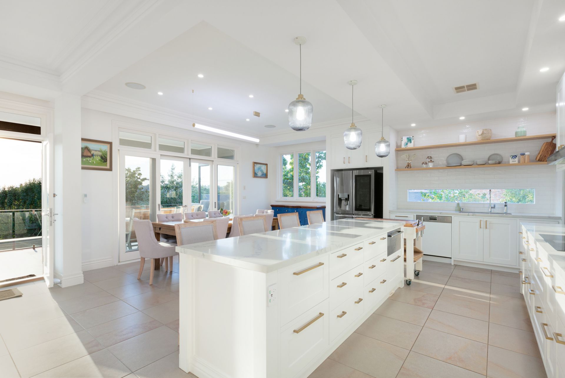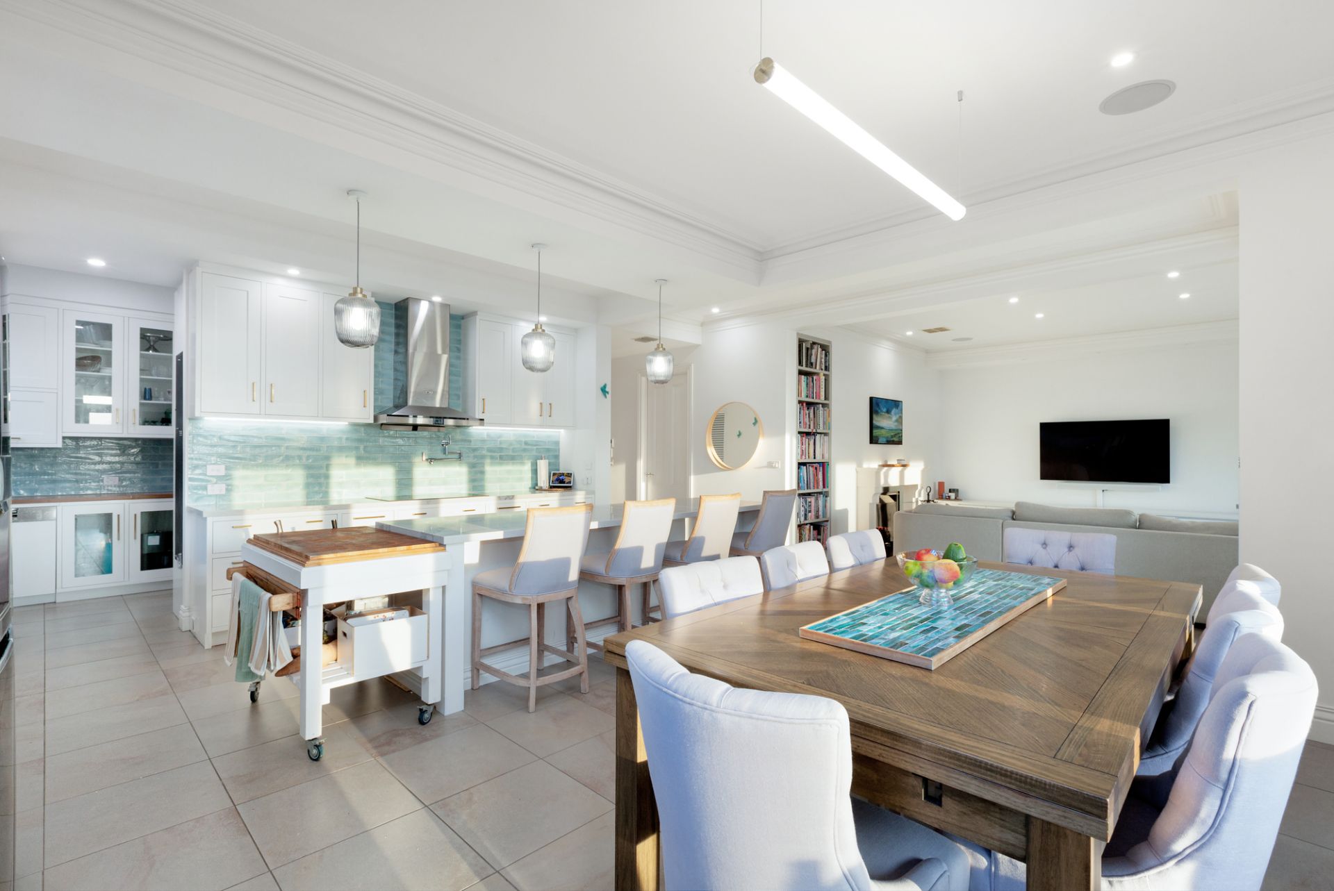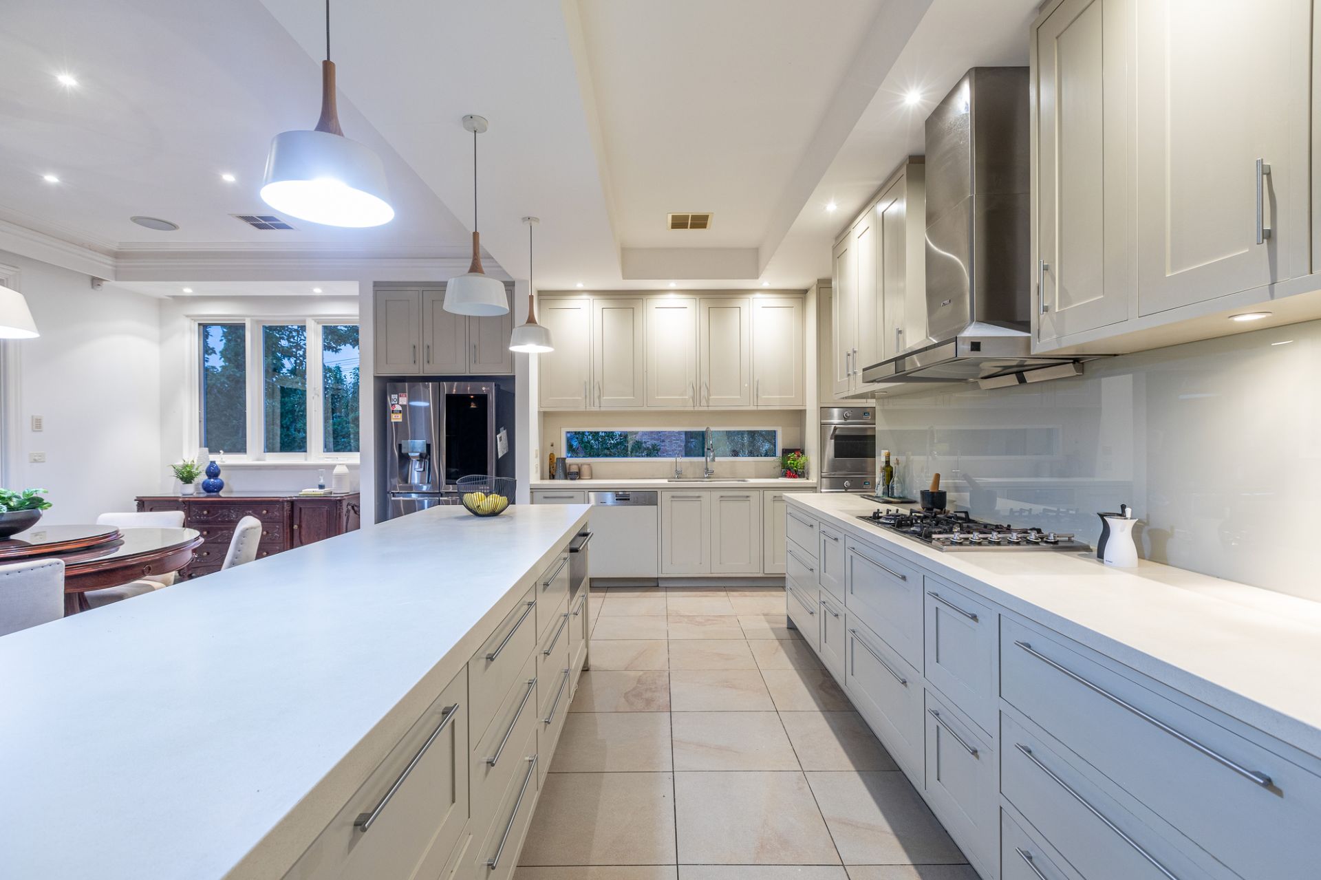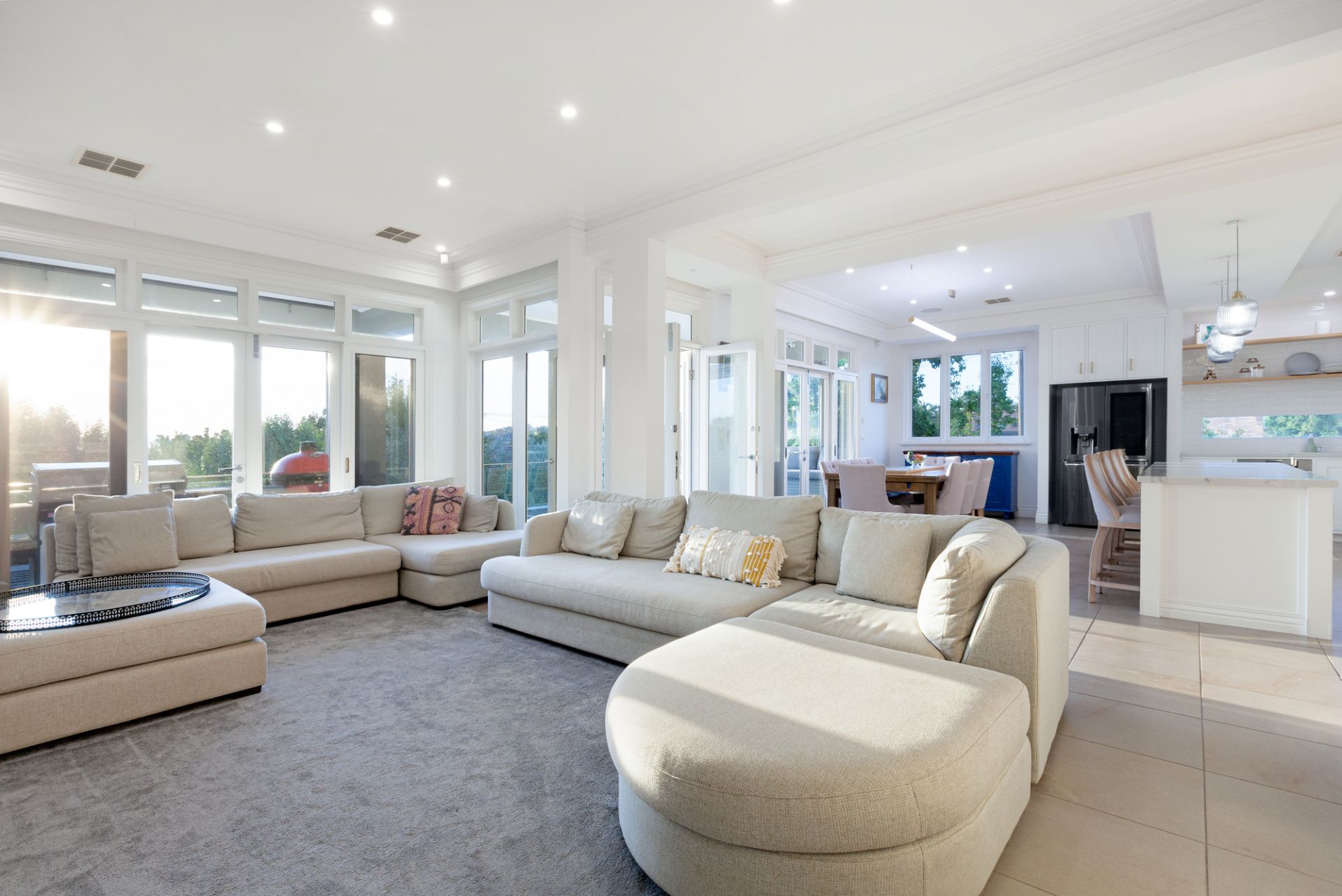 This architecturally designed home includes a home theatre room (with retractable projector projector screen, and speakers), a fitted home office, elegant sitting/music room, formal dining room, powder room, and laundry (complete with chute and drying cupboard). The chef’s kitchen which includes a butler’s pantry, has been completely revamped with top-tier appliances, including a 3-phase induction cooktop, large double ovens, and plumbed pot filler. The open-plan dining and living areas, featuring a Jetmaster open fire, both open onto a large undercover terrace—ideal for entertaining while enjoying views of the city skyline.