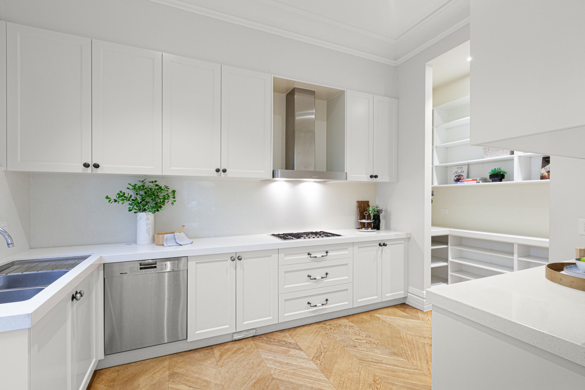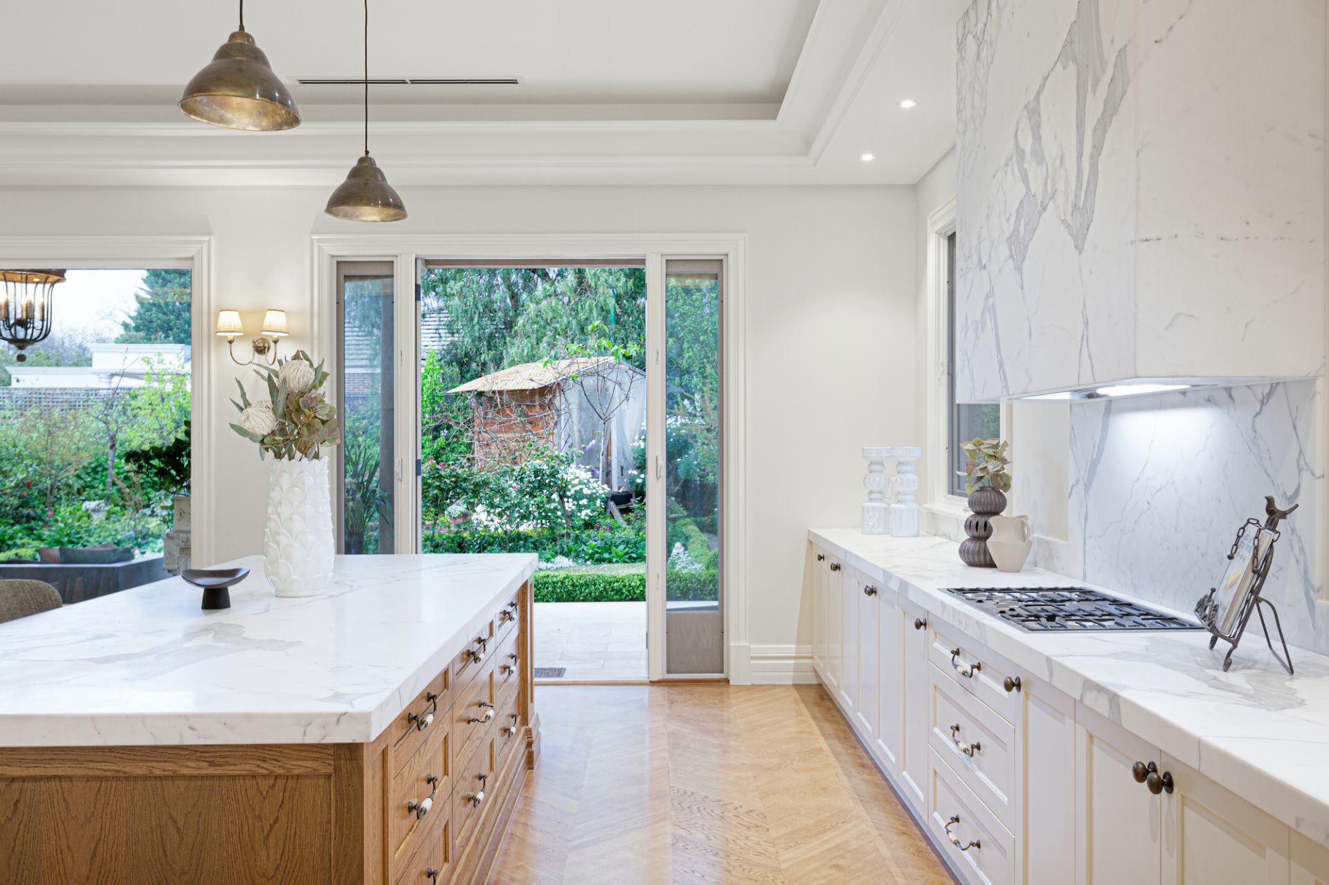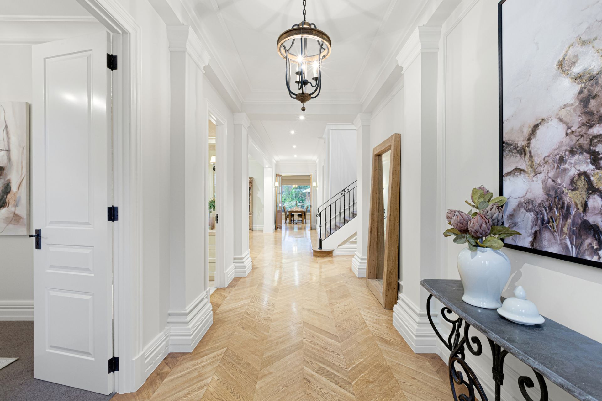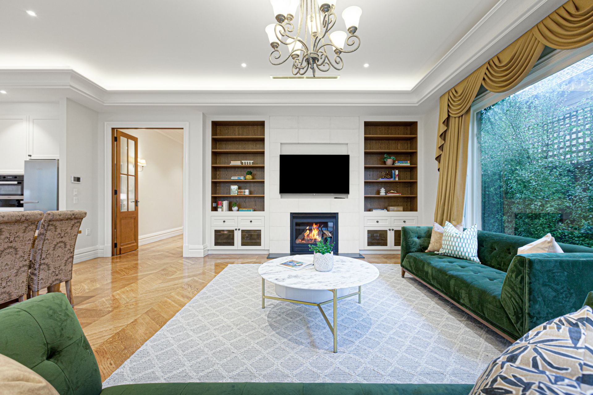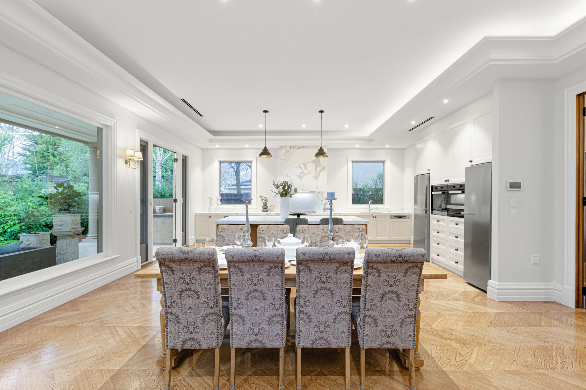 Upon entering through solid oak front doors, you are welcomed by a grand entrance hall adorned with American oak Chevron parquetry, leading into a realm of refined elegance. The light-filled ground-floor bedroom suite sets a gracious tone with its plush wool carpet, plantation shutters, walk-in robe, and a two-way ensuite complete with a frameless-glass shower, Villeroy & Boch vanity, and exquisite travertine finishes. A spacious formal sitting and dining room, bathed in northern light, enhances the inviting atmosphere.