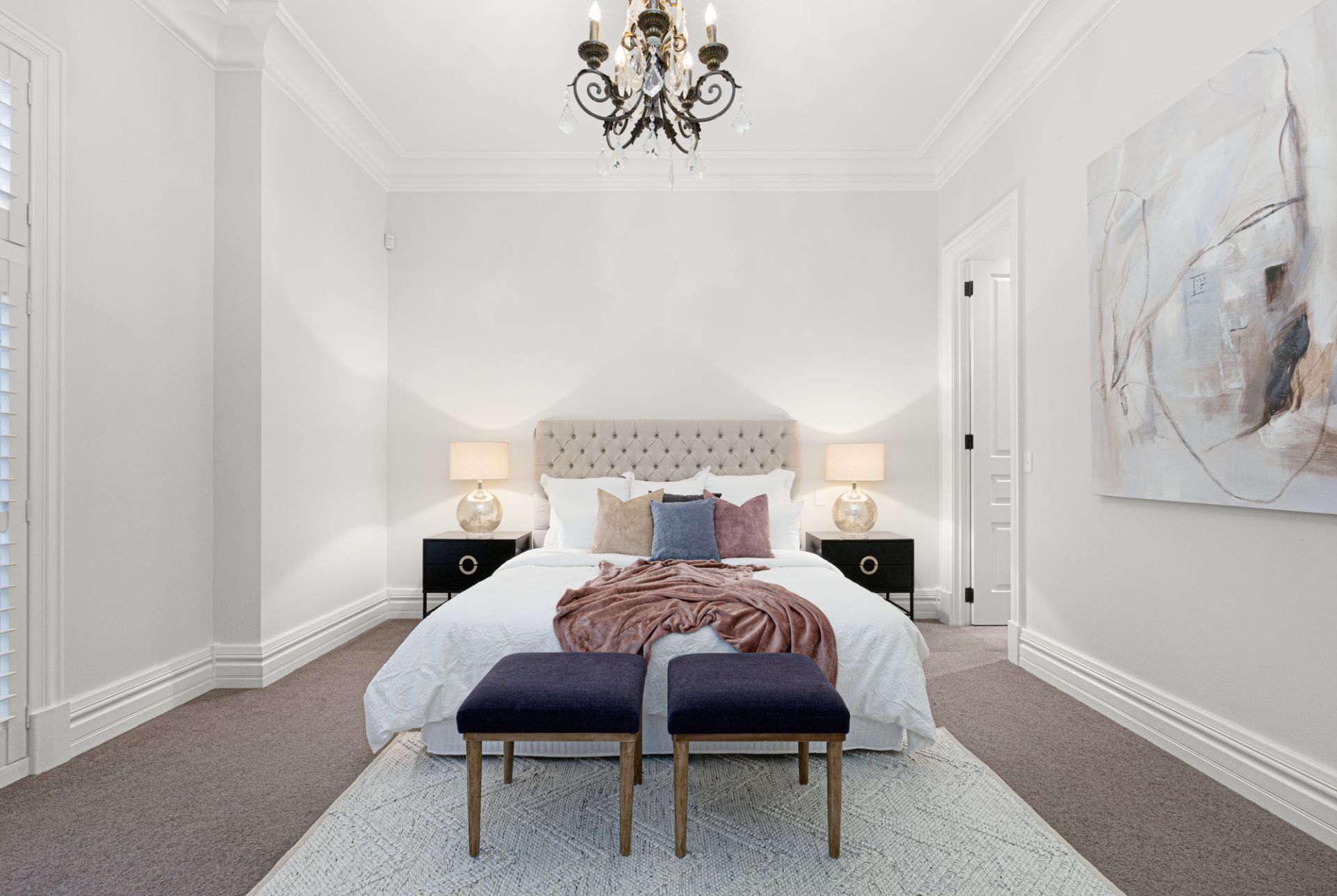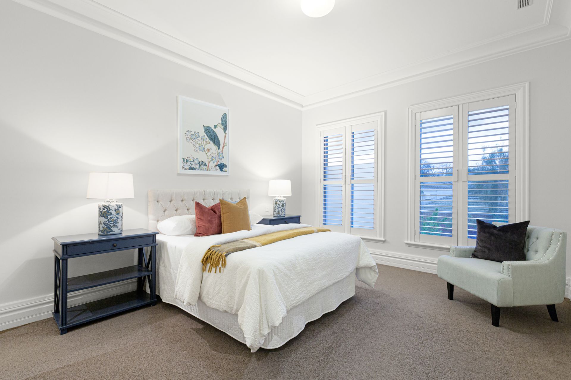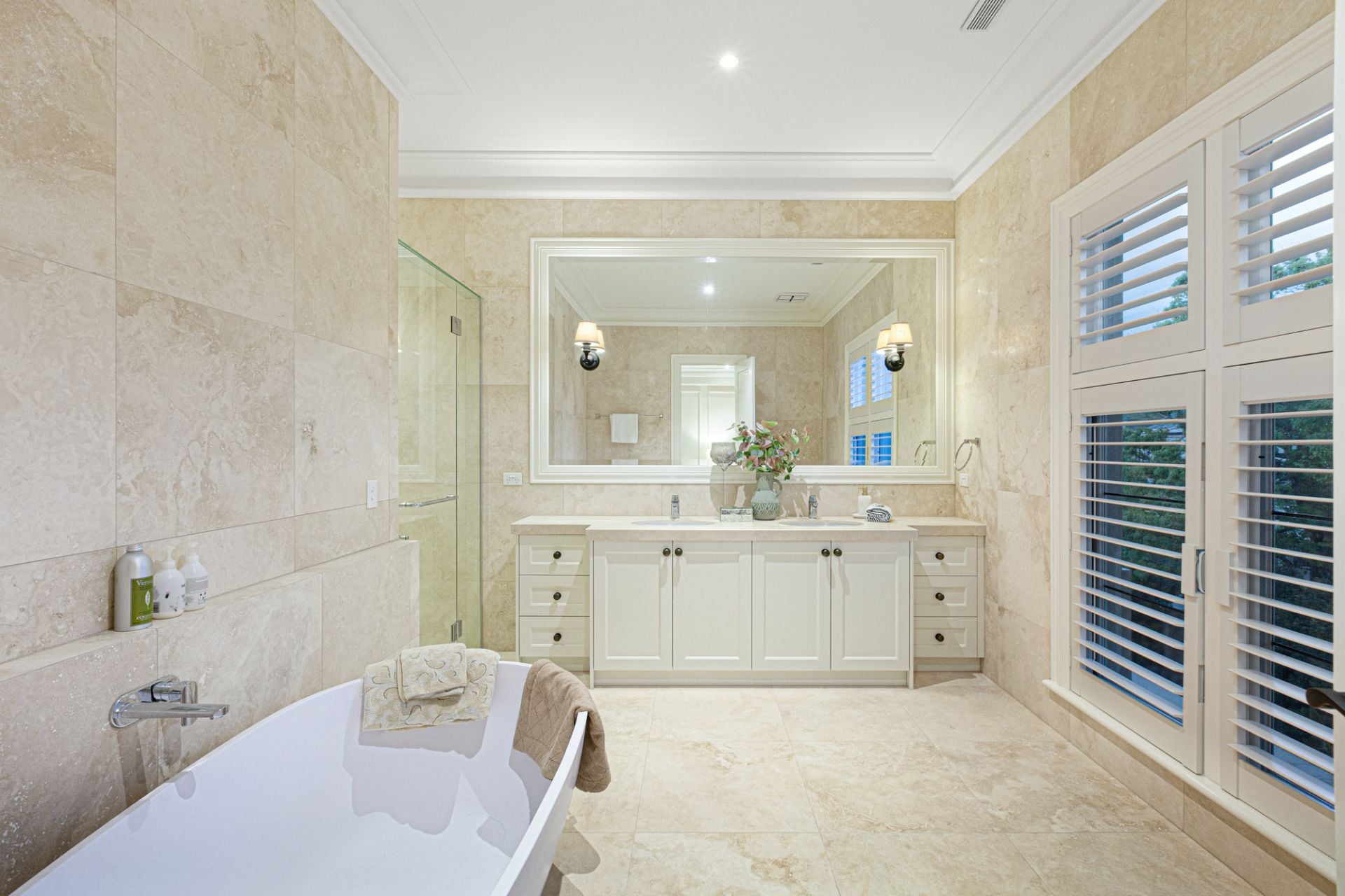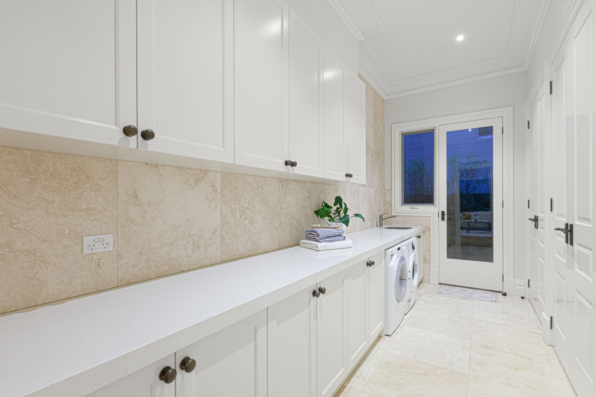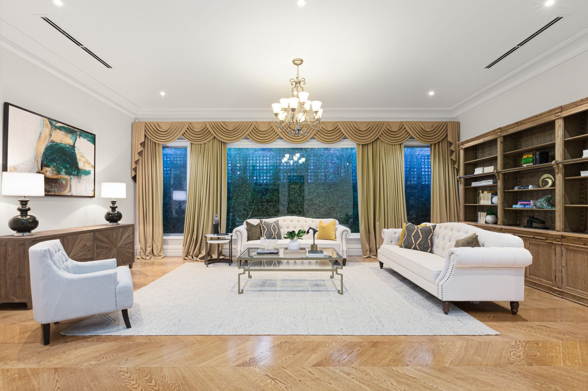 Upon entering through solid oak front doors, you are welcomed by a grand entrance hall adorned with American oak Chevron parquetry, leading into a realm of refined elegance. The light-filled ground-floor bedroom suite sets a gracious tone with its plush wool carpet, plantation shutters, walk-in robe, and a two-way ensuite complete with a frameless-glass shower, Villeroy & Boch vanity, and exquisite travertine finishes. A spacious formal sitting and dining room, bathed in northern light, enhances the inviting atmosphere.