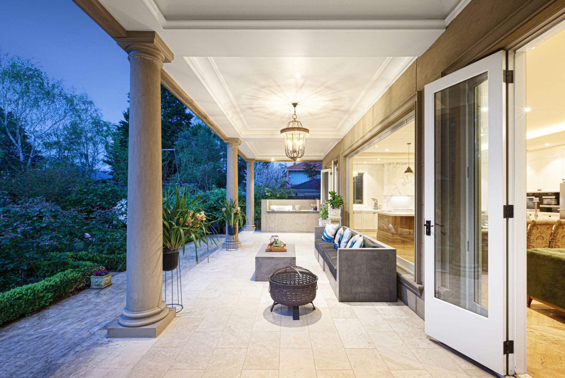 The ground-floor layout culminates in a magnificent kitchen adorned with sleek Calacatta marble and equipped with top-of-the-line Miele appliances, including dual ovens, a gas cooktop, and dishwashers, along with a butler’s pantry and Italian-designed Sirius Range Hoods. This kitchen seamlessly flows into a generous family dining and living room featuring a HeatnGlo fireplace and stunning picture windows that offer breathtaking views. French doors open to a travertine-paved entertaining terrace with a BBQ kitchen, perfect for grand gatherings overlooking a beautifully manicured garden complete with a fountain, rose beds, and fruit trees.