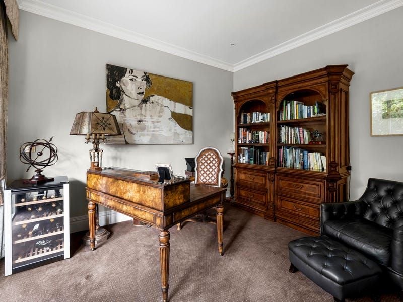A split-level main bedroom suite with multiple doors to a poolside terrace is an absolute showstopper including a dressing room, double-shower en-suite and plentiful built-in robes, while situated at the rear are two sizable bedrooms (BIRs), study with a fitted desk, an immaculate bathroom, a powder room and full laundry. Distinct living and dining rooms with an in-built bar and marble fireplace exude opulence and lead to a travertine tiled family/meals area awash with glorious north light.