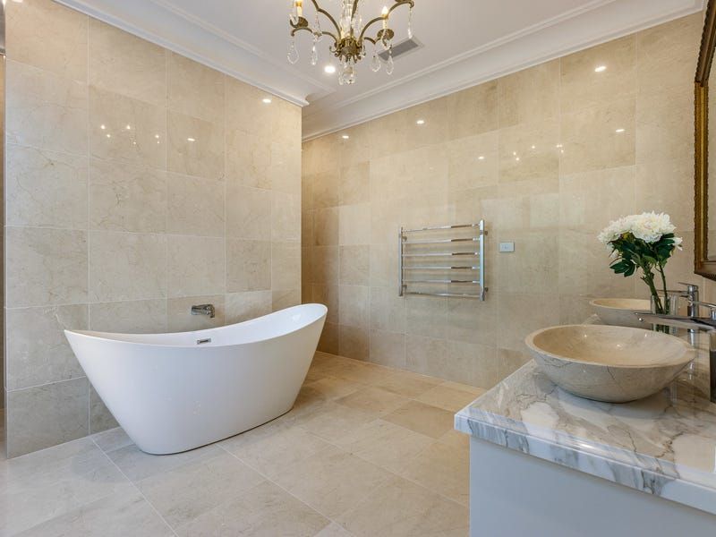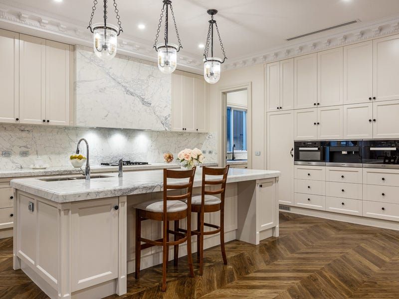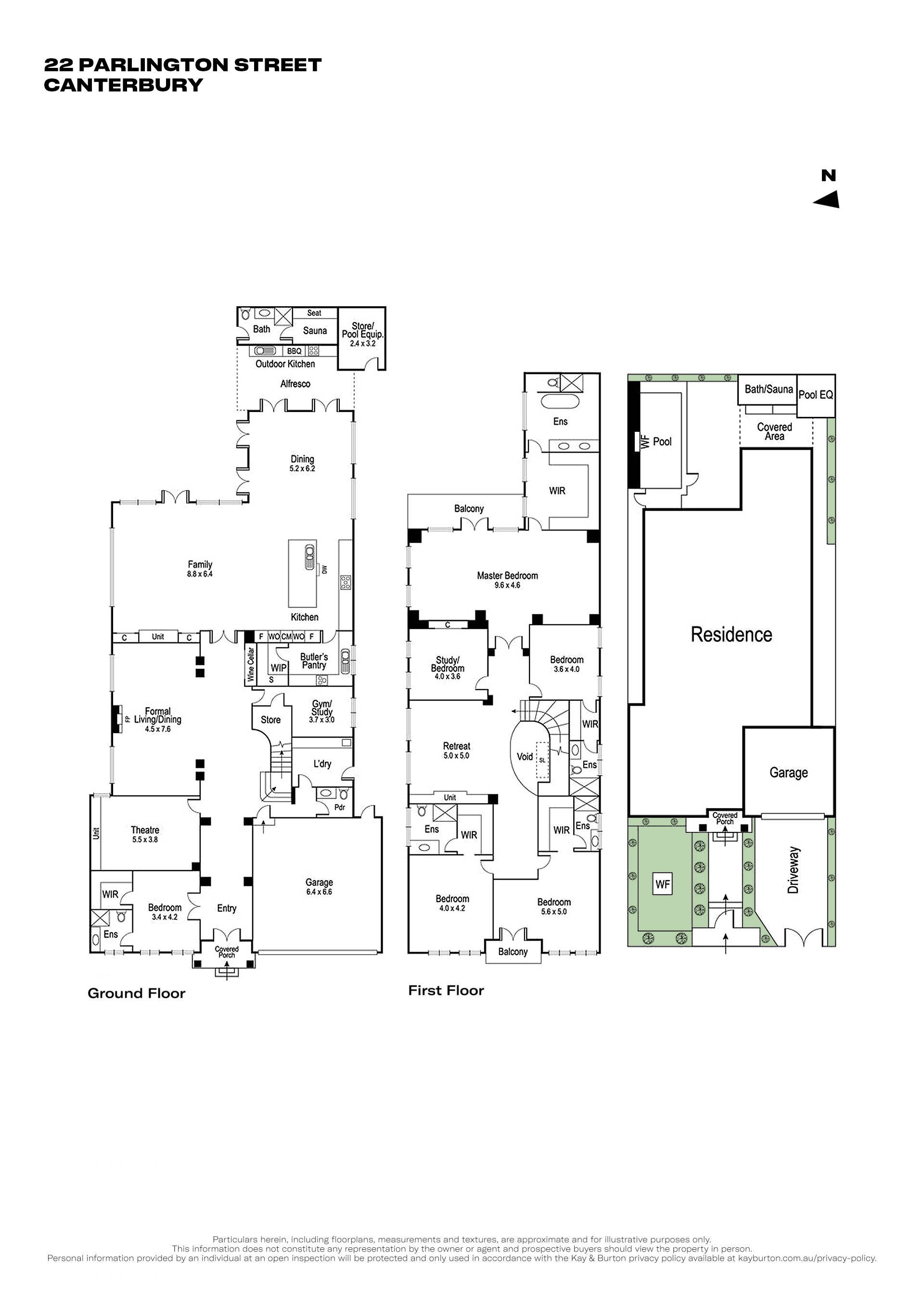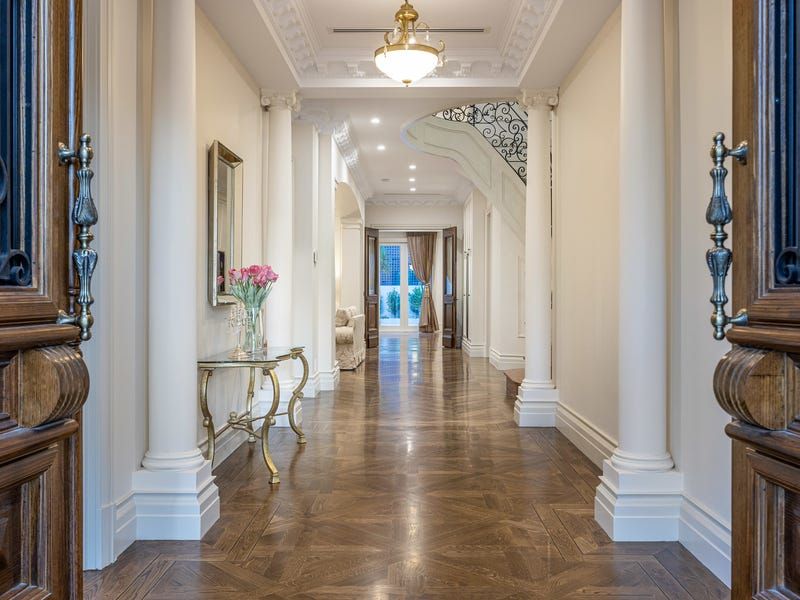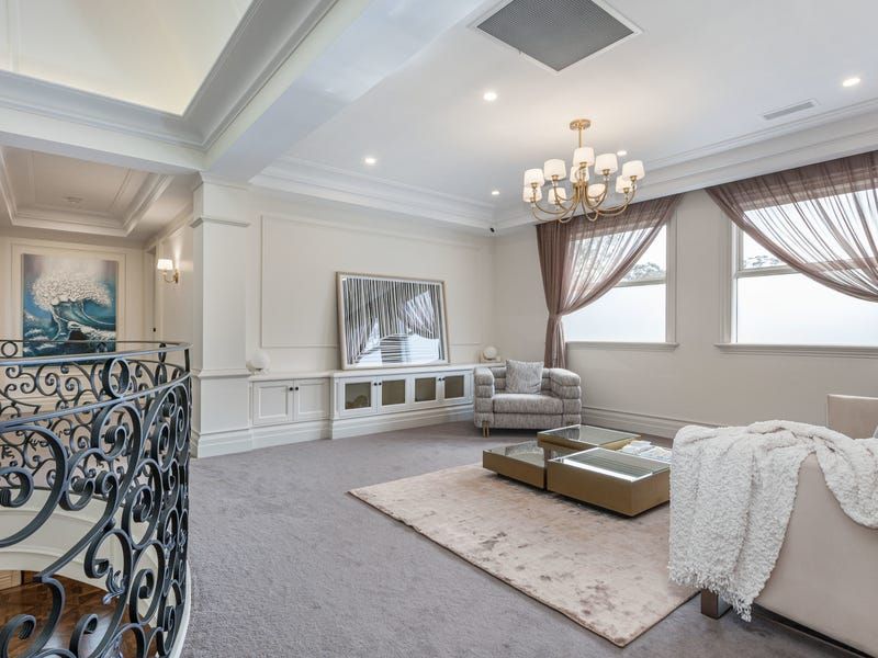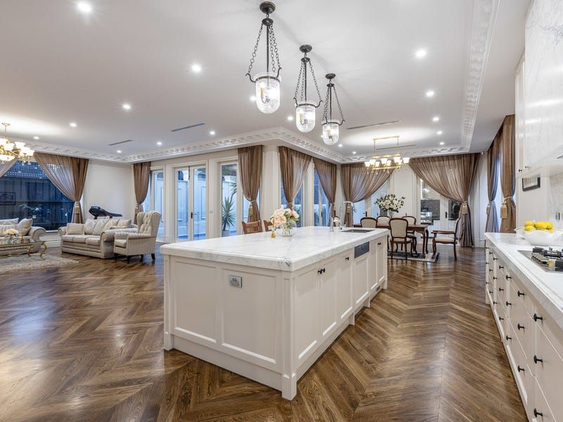 Commanding from the outset, a grand reception hall and sweeping staircase launch the vast two-level interior lavished in American Oak and Calacatta marble under towering ornate ceilings. A guests bedroom (WIR, ensuite), home theatre with red leather panels, a study and a powder room precede substantial ground-floor living spaces highlighted by an elegant lounge room (marble HeatnGlo fireplace) and a huge family/dining zone opening to an amazing north-oriented entertainment oasis.